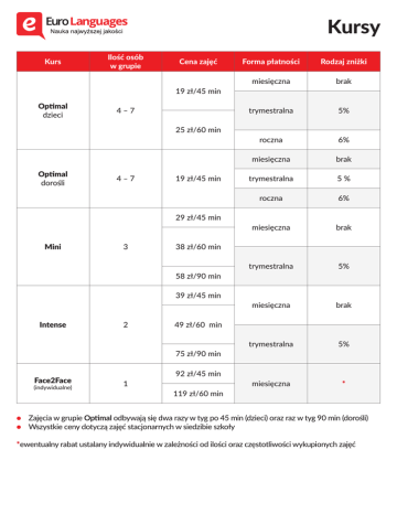 Kursy Kurs Ilość osób w grupie Cena zajęć 19 zł/45 min Optimal dzieci 4–7 25 zł/60 min Optimal dorośli 4–7 19 zł/45 min 29 zł/45 min Mini 3 39 zł/45 min 2 (indywidualne) miesięczna brak trymestralna 5% roczna 6% miesięczna brak trymestralna 5% roczna 6% miesięczna brak trymestralna 5% miesięczna brak trymestralna 5% miesięczna * 49 zł/60 min 75 zł/90 min Face2Face Rodzaj zniżki 38 zł/60 min 58 zł/90 min Intense Forma płatności 92 zł/45 min 1 119 zł/60 min • Zajęcia w grupie Optimal odbywają się dwa razy w tyg po 45 min (dzieci) oraz raz w tyg 90 min (dorośli) • Wszystkie ceny dotyczą zajęć stacjonarnych w siedzibie szkoły *ewentualny rabat ustalany indywidualnie w zależności od ilości oraz częstotliwości wykupionych zajęć