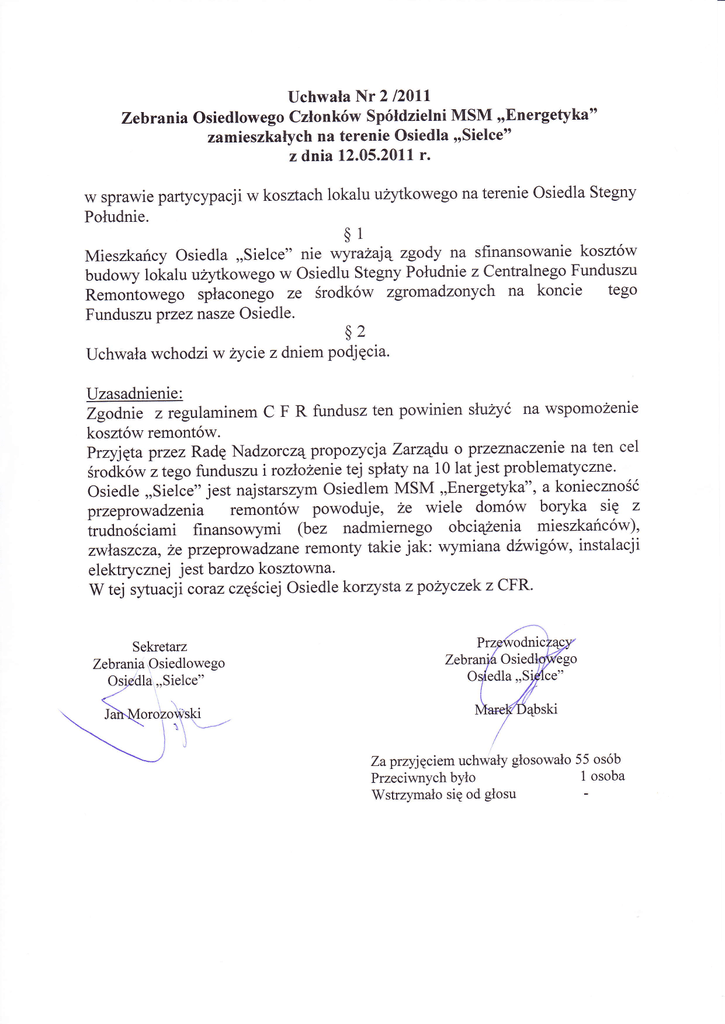 (Jchwała Nr 2 1201'1 Zebrania osiedlowego Członków Spółdzielni MSM ooEnergetyka'' zamieszkaĘch na terenie osiedla rrSielce'o z dnia 12.05,201'1' r, w sprawie paĄcypacji w kosztach lokalu uzytkowego na terenie osiedla Stegny Pofudnie. $1 Mieszkańcy osiedla ,,Sielce'' nie wyrazają zgody na sfinansowanie kosztów budowy lotalu uĄrtkowego w osiedlu Stegny Południe z Centralnego Funduszu Remontowego spłaconego ze środków zgromadzonych na koncie tego Funduszu przez nasze Osiedle. $2 Uchwała wchodzi w Ęcie z dniem podjęcia. Uzasadnienie: zgod"i" , ne"laminem C F R fundusz ten powinien słuĘćna wspomozenie kosŻów remontów. Przyjęta przez Radę Nadzorcząpropozycja Zarząill o ptzeznaczen\e na ten cel s'oóko* tego funduszuirozłoŻenie tej spłaty na 10 lat jest problematyczlle. " jest najstarszym osiedlem MSM ,,Energetykt', a konieczność osiedle ,,Sieńe'' przeprow adzenia remontów powoduje , ż9 wiele domów boryka się z irudnościami finansowymi (bez nadmiernego obcią7enia mieszkańców), nrłłaszcza,że przeprowadzate remonty takie jak: wymtana dtvłigów, instalacji elektrycznej jest bardzo kosŹowna. W tej sytuacji cotazczęściej osiedle korzystazpoĘczek z CFR. Sekretarz Zębtaniaasiedlowego Zaprzyjęciem uchwały głosowało 55 osób I osoba Przeciwnych było Wstrzymało się od głosu