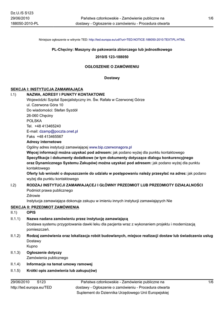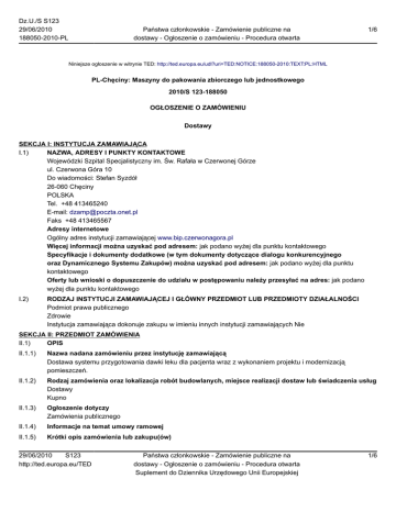 Dz.U./S S123 29/06/2010 188050-2010-PL Państwa członkowskie - Zamówienie publiczne na dostawy - Ogłoszenie o zamówieniu - Procedura otwarta 1/6 Niniejsze ogłoszenie w witrynie TED: http://ted.europa.eu/udl?uri=TED:NOTICE:188050-2010:TEXT:PL:HTML PL-Chęciny: Maszyny do pakowania zbiorczego lub jednostkowego 2010/S 123-188050 OGŁOSZENIE O ZAMÓWIENIU Dostawy SEKCJA I: INSTYTUCJA ZAMAWIAJĄCA I.1) NAZWA, ADRESY I PUNKTY KONTAKTOWE Wojewódzki Szpital Specjalistyczny im. Św. Rafała w Czerwonej Górze ul. Czerwona Góra 10 Do wiadomości: Stefan Syzdół 26-060 Chęciny POLSKA Tel. +48 413465240 E-mail: [email protected] Faks +48 413465567 Adresy internetowe Ogólny adres instytucji zamawiającej www.bip.czerwonagora.pl Więcej informacji można uzyskać pod adresem: jak podano wyżej dla punktu kontaktowego Specyfikacje i dokumenty dodatkowe (w tym dokumenty dotyczące dialogu konkurencyjnego oraz Dynamicznego Systemu Zakupów) można uzyskać pod adresem: jak podano wyżej dla punktu kontaktowego Oferty lub wnioski o dopuszczenie do udziału w postępowaniu należy przesyłać na adres: jak podano wyżej dla punktu kontaktowego I.2) RODZAJ INSTYTUCJI ZAMAWIAJĄCEJ I GŁÓWNY PRZEDMIOT LUB PRZEDMIOTY DZIAŁALNOŚCI Podmiot prawa publicznego Zdrowie Instytucja zamawiająca dokonuje zakupu w imieniu innych instytucji zamawiających Nie SEKCJA II: PRZEDMIOT ZAMÓWIENIA II.1) OPIS II.1.1) Nazwa nadana zamówieniu przez instytucję zamawiającą Dostawa systemu przygotowania dawki leku dla pacjenta wraz z wykonaniem projektu i modernizacją pomieszczeń. II.1.2) Rodzaj zamówienia oraz lokalizacja robót budowlanych, miejsce realizacji dostaw lub świadczenia usług Dostawy Kupno II.1.3) Ogłoszenie dotyczy Zamówienia publicznego II.1.4) Informacje na temat umowy ramowej II.1.5) Krótki opis zamówienia lub zakupu(ów) 29/06/2010 S123 http://ted.europa.eu/TED Państwa członkowskie - Zamówienie publiczne na dostawy - Ogłoszenie o zamówieniu - Procedura otwarta Suplement do Dziennika Urzędowego Unii Europejskiej 1/6 Dz.U./S S123 29/06/2010 188050-2010-PL Państwa członkowskie - Zamówienie publiczne na dostawy - Ogłoszenie o zamówieniu - Procedura otwarta 2/6 Dostawa aptecznego systemu przygotowania indywidualnej dawki leku dla pacjenta wraz z wykonaniem projektu i modernizacją pomieszczeń apteki szpitalnej w szczególności: 1. Dostawa urządzeń i wyposażenia pomieszczeń koniecznych do funkcjonowania aptecznego systemu przygotowania indywidualnej dawki leku dla pacjenta, jego wdrożenie - instalacja, uruchomienie systemu i jego integracja z systemem Infomedica, 2. Przeszkolenie wyznaczonych przez Zamawiającego pracowników w zakresie umożliwiającym obsługę systemu, 3. Dostawa materiałów eksploatacyjnych niezbędnych do nieprzerwanej pracy aparatu na okres 1 roku (zużycie 5 saszetek dziennie na jednego pacjenta przy założeniu 100 000 osobodni/rok), 4. Sporządzenie kompletnej dokumentacji projektowej, przebudowy pomieszczeń apteki szpitalnej znajdującej się w siedzibie Zamawiającego, która umożliwi zainstalowanie i sprawne funkcjonowanie aptecznego systemu przygotowania indywidualnej dawki leku dla pacjenta, 5. Wykonanie robót budowlanych, określonych w w/w dokumentacji projektowej, uwzględniających wszelkie normy i aprobaty techniczne. II.1.6) Wspólny Słownik Zamówień (CPV) 42921300, 71320000, 45000000, 39000000 II.1.7) Zamówienie jest objęte Porozumieniem w sprawie zamówień rządowych (GPA) Nie II.1.8) Podział na części Nie II.1.9) Dopuszcza się składanie ofert wariantowych Nie II.2) WIELKOŚĆ LUB ZAKRES ZAMÓWIENIA II.2.1) Całkowita wielkość lub zakres Powyżej 193 000 EUR. II.2.2) Opcje II.3) CZAS TRWANIA ZAMÓWIENIA LUB TERMIN REALIZACJI SEKCJA III: INFORMACJE O CHARAKTERZE PRAWNYM, EKONOMICZNYM, FINANSOWYM I TECHNICZNYM III.1) WARUNKI DOTYCZĄCE ZAMÓWIENIA III.1.1) Wymagane wadia i gwarancje Wadium- 25 000,00 PLN. III.1.2) Główne warunki finansowania i płatności i/lub odniesienie do odpowiednich przepisów je regulujących III.1.3) Forma prawna, jaką musi przyjąć grupa wykonawców, której zostanie udzielone zamówienie III.1.4) Inne szczególne warunki, którym podlega realizacja zamówienia III.2) WARUNKI UDZIAŁU III.2.1) Sytuacja podmiotowa wykonawców, w tym wymogi dotyczące wpisu do rejestru zawodowego lub handlowego Informacje i formalności konieczne do dokonania oceny spełniania wymogów: A. W celu wykazania braku podstaw do wykluczenia z postępowania o udzielenie zamówienia wykonawcy w okolicznościach, o których mowa w art. 24 ust. 1 ustawy, w postępowaniach określonych w art. 26 ust. 2 ustawy zamawiający może żądać następujących dokumentów: 1. Oświadczenie o braku podstaw do wykluczenia w związku z art. 24 ust.1 29/06/2010 S123 http://ted.europa.eu/TED Państwa członkowskie - Zamówienie publiczne na dostawy - Ogłoszenie o zamówieniu - Procedura otwarta Suplement do Dziennika Urzędowego Unii Europejskiej 2/6 Dz.U./S S123 29/06/2010 188050-2010-PL Państwa członkowskie - Zamówienie publiczne na dostawy - Ogłoszenie o zamówieniu - Procedura otwarta 3/6 2. Aktualny odpisu z właściwego rejestru, jeżeli odrębne przepisy wymagają wpisu do rejestru, w celu wykazania braku podstaw do wykluczenia w oparciu o art. 24 ust. 1 pkt. 2 ustawy, wystawiony nie wcześniej niż 6 miesięcy przed upływem terminu składania ofert, a w stosunku do osób fizycznych oświadczenia w zakresie art. 24 ust. 1 pkt.2 ustawy (załącznik do SIWZ dla osób fizycznych) 3. Aktualne zaświadczenie właściwego Naczelnika Urzędu Skarbowego potwierdzającego, że wykonawca nie zalega z opłacaniem podatków lub zaświadczenie, że uzyskał przewidziane prawem zwolnienie, odroczenie lub rozłożenie na raty zaległych płatności lub wstrzymanie w całości wykonania decyzji właściwego organu wystawione nie wcześniej niż 3 miesiące przed upływem terminu składania ofert, 4. Aktualne zaświadczenie właściwego od