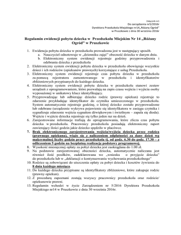 Załącznik nr1 Do zarządzenia nr5/2016r Dyrektora Przedszkola Miejskiego nr14,,Różany Ogród” w Pruszkowie z dnia 30 września 2016r Regulamin ewidencji pobytu dziecka w Przedszkolu Miejskim Nr 14 ,,Różany Ogród” w Pruszkowie 1. Ewidencja pobytu dziecka w przedszkolu prowadzona jest w następujący sposób. a. Nauczyciel odnotowuje w „dzienniku zajęć” obecność dziecka w danym dniu. b. Elektroniczny system ewidencji rejestruje godziny przyprowadzenia i odebrania dziecka z przedszkola 2. Elektroniczny system ewidencji pobytu dziecka w przedszkolu obowiązuje wszystkie dzieci i ich rodziców (opiekunów prawnych) korzystające z usług Przedszkola. 3. Elektroniczny system ewidencji rejestruje czas pobytu dziecka w przedszkolu za pomocą rejestratora zamontowanego w przedszkolu i identyfikatorów zbliżeniowych przypisanych do każdego dziecka. 4. Elektroniczny system ewidencji pobytu dziecka w przedszkolu stanowi zestaw urządzeń z oprogramowaniem, które pozwalają na zapis czasu wejścia i wyjścia osoby wyposażonej w unikatowy klucz identyfikujący. 5. Przyprowadzając lub odbierając dziecko rodzic (prawny opiekun) rejestruje to zdarzenie przykładając identyfikator do czytnika umieszczonego w przedszkolu. System automatycznie rejestruje godzinę, o której dziecko zostało przyprowadzone lub odebrane (urządzenie wykrywa pojawienie się identyfikatora w zasięgu czytnika i sygnalizuje zdarzenie wejścia sygnałem dźwiękowym i świetlnym – zapala się dioda). Wejście i wyjście dziecka rejestruje się tylko jeden raz na dzień. 6. Zarejestrowane informacje trafiają do oprogramowania, które zlicza czas pobytu dziecka w przedszkolu. Pracownicy przedszkola posiadają elektroniczny raport zawierający ilości godzin jakie dziecko spędziło w placówce. 7. Brak elektronicznego zarejestrowania wejścia/wyjścia dziecka przez rodzica (prawnego opiekuna), wiąże się z naliczeniem odpłatności za dany dzień wg maksymalnej liczby godzin pracy przedszkola tj. od godz. 6.30 do godz. 17.30 – z odliczeniem 5 godzin na bezpłatną realizację podstawy programowej. 8. Wysokość miesięcznej opłaty za pobyt dziecka jest zaokrąglana do 1.00 zł. 9. Na podstawie zarejestrowanej obecności dziecka, automatycznie naliczana jest również ilość posiłków, zadeklarowana we „wniosku o przyjęcie dziecka” do przedszkola lub w „deklaracji o kontynuowaniu wychowania przedszkolnego” 10. Rodzice są zobowiązani do uiszczenia opłaty za pobyt dziecka i kosztów żywienia do 8 dnia każdego miesiąca. 11. Do każdego dziecka przypisane są identyfikatory zbliżeniowe, które zakupuje rodzic (prawny opiekun). 12. Z procedurą zapoznani zostają wszyscy pracownicy przedszkola oraz rodzicie/ opiekunowie prawni. 13. Regulamin wchodzi w życie Zarządzeniem nr 5/2016 Dyrektora Przedszkola Miejskiego nr14 w Pruszkowie z dnia 30 września 2016r. Pruszków, 2016-09-30 Zarządzenie nr 5/2016 Dyrektora Przedszkola Miejskiego Nr 14 ,,Różany Ogród” w Pruszkowie z dnia 30 września 2016r. w sprawie wprowadzenia REGULAMINU EWIDENCJI POBYTU DZIECKA w Przedszkolu Miejskim Nr 14 ,,Różany Ogród” w Pruszkowie Na podstawie: 1) Rozporządzenia Ministra Edukacji Narodowej z dnia 28 sierpnia 2014r. (Dz. U. z 2014, poz. 1157) wraz z późniejszymi zmianami, 2) Uchwały XXXVI/328/2013 Rady Miejskiej w Pruszkowie z dnia 29.08.2013r. zarządzam co następuje: §1 Wprowadzam REGULAMIN EWIDENCJI POBYTU DZIECKA w Przedszkolu Miejskim Nr 14 w Pruszkowie z dnia 30 września 2016r. stanowiący załącznik Nr 1 do niniejszego zarządzenia. §2 Zarządzenie wchodzi w życie z dniem 03 października 2016r
