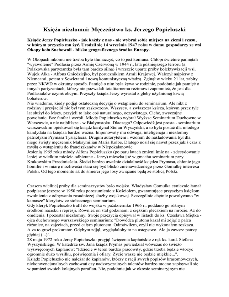 Księża niezłomni: Męczeństwo ks. Jerzego Popiełuszki Ksiądz Jerzy Popiełuszko - jak każdy z nas - nie wybrał sobie miejsca na ziemi i czasu, w którym przyszło mu żyć. Urodził się 14 września 1947 roku w domu gospodarzy ze wsi Okopy koło Suchowoli - blisko geograficznego środka Europy. W Okopach nikomu nie trzeba było tłumaczyć, co to jest komuna. Chłopi świetnie pamiętali "wyzwolenie" Podlasia przez Armię Czerwoną w 1944 r., lata późniejszego terroru (a Polakowska partyzantka była tam bardzo silna) i wreszcie uparte próby kolektywizacji wsi. Wujek Alka - Alfons Gniedziejko, był porucznikiem Armii Krajowej. Walczył najpierw z Niemcami, potem z Sowietami i nową komunistyczną władzą. Zginął w wieku 21 lat, zabity przez NKWD w okrutny sposób. Pamięć o nim była żywa w rodzinie, podobnie jak pamięć o innych partyzantach, którzy nie pozwalali totalitarnemu reżimowi zapomnieć, że jest dla Podlasiaków czymś obcym. Przyszły ksiądz Jerzy wyrastał z gleby użyźnionej krwią bohaterów. Nie wiadomo, kiedy podjął ostateczną decyzję o wstąpieniu do seminarium. Ale nikt z rodziny i przyjaciół nie był tym zaskoczony. Wszyscy, a zwłaszcza księża, którym przez tyle lat służył do Mszy, przyjęli to jako coś naturalnego, oczywistego. Ciche, zwyczajne powołanie. Bez fanfar i werbli. Młody Popiełuszko wybrał Wyższe Seminarium Duchowne w Warszawie, a nie najbliższe - w Białymstoku. Dlaczego? Odpowiedź jest prosta - seminarium warszawskim opiekował się ksiądz kardynał Stefan Wyszyński, a to była postać dla młodego kandydata na księdza bardzo ważna. Imponowały mu odwaga, inteligencja i niezłomny patriotyzm Prymasa Tysiąclecia. Drugim autorytetem i wzorem do naśladowania był dla niego święty męczennik Maksymilian Maria Kolbe. Dlatego nosił się nawet przez jakiś czas z myślą o wstąpieniu do franciszkanów w Niepokalanowie. Jesienią 1965 roku młody Alfons Popiełuszko (po paru latach zmieni imię na - zdecydowanie lepiej w wielkim mieście odbierane - Jerzy) mieszka już w gmachu seminarium przy Krakowskim Przedmieściu. Śledzi bardzo uważnie działalność księdza Prymasa, chłonie jego homilie i w miarę możliwości stara się być blisko znienawidzonego przez Gomułkę interrexa Polski. Od tego momentu aż do śmierci jego losy związane będą ze stolicą Polski. Czasem wielkiej próby dla seminarzystów było wojsko. Władysław Gomułka cynicznie łamał podpisane jeszcze w 1950 roku porozumienie z Kościołem, gwarantujące przyszłym księżom zwolnienie z odbywania zasadniczej służby wojskowej. Szczególnie chętnie powoływano "w kamasze" kleryków ze stołecznego seminarium. Gdy kleryk Popiełuszko trafił do wojska w październiku 1966 r., poddano go różnym środkom nacisku i represji. Również on stał godzinami z ciężkim plecakiem na mrozie. Aż do omdlenia. I pozostał niezłomny. Swoje przeżycia opisywał w listach do ks. Czesława Miętka ojca duchownego warszawskiego seminarium: "Dowódca plutonu kazał mi zdjąć z palca różaniec, na zajęciach, przed całym plutonem. Odmówiłem, czyli nie wykonałem rozkazu. A za to grozi prokurator. Gdybym zdjął, wyglądałoby to na ustępstwo. Ale ja zawsze patrzę głębiej (...)". 28 maja 1972 roku Jerzy Popiełuszko przyjął święcenia kapłańskie z rąk ks. kard. Stefana Wyszyńskiego. W katedrze św. Jana ksiądz Prymas powiedział wówczas do świeżo wyświęconych kapłanów: "Idziecie w teren bardzo pracowity, gdzie trzeba będzie włożyć ogromnie dużo wysiłku, poświęcenia i ofiary. Życie wasze nie będzie miękkie...". Ksiądz Popiełuszko nie należał do kapłanów, którzy z racji swych popisów krasomówczych, niekonwencjonalnych zachowań czy nadzwyczajnych talentów bardzo mocno zapisywali się w pamięci swoich kolejnych parafian. Nie, podobnie jak w okresie seminaryjnym nie odznaczał się niczym szczególnym. Wszyscy podkreślali jego zwyczajność. Z jednym charakterystycznym wyjątkiem - był niezwykle otwarty na ludzi i ich problemy. I wierny w przyjaźni. Ci, z którymi zbliżył się w Ząbkach i później w Aninie, pozostali z nim aż do końca. Od roku 1978 był wikariuszem w parafii Dzieciątka Jezus przy ul. Czarnieckiego na Żoliborzu Oficerskim. W tym samym roku został duszpasterzem pielęgniarek w kaplicy Res Sacra Miser przy Krakowskim Przedmieściu. W maju 1980 roku trafił do kościoła św. Stanisława Kostki na warszawskim Żoliborzu. Mimo że ten "prosty, nieśmiały, jakby zalękniony" młody ksiądz nie był w pełni zdrowy, ksiądz proboszcz Teofil Bogucki przystał na jego prośbę, by mógł zostać rezydentem. Gdy poznał ks. Popiełuszkę bliżej, pierwsze, dalekie od entuzjazmu wrażenie minęło bez śladu. "Coś z niego promieniowało. (...) Był inny niż wszyscy, choć bezpośredni i taki swój". Przenoszony dotychczas dość często z miejsca na miejsce ksiądz Popiełuszko poczuł się na Żoliborzu jak u siebie. Tu trafił na ludzi bardzo mu życzliwych, na proboszcza podzielającego jego gorący patriotyzm. Żoliborz i jego specyficzny inteligencko-robotniczy charakter poznał już wcześniej. Mógł teraz wcielać w życie swoje rozliczne pomysły. Był już w Warszawie postacią znaną, dlatego przyjaciele z dawnych parafii oraz z wielu środowisk, w których dotychczas pracował, przyszli tu za nim. Droga ku wielkości i śmierci zaczęła się 31 sierpnia 1980 r. Wówczas to, raczej przypadkiem, ksiądz Jerzy odprawił Mszę Świętą dla strajkujących robotników "Huty Warszawa" i zetknął się z obcym sobie światem robotników. Był zafascynowany. Nie sądził, że spotka się wśród nich z tak silną religijnością. Odtąd zawsze wspominać będzie tę pierwszą robotniczą Mszę i szacunek, z jakim się spotkał u hutników. Bo nie zawahał się być z nimi w chwili, gdy wszystko mogło się wydarzyć, gdy nie było jasne, jak zareagują władze. Robotnicy szybko g