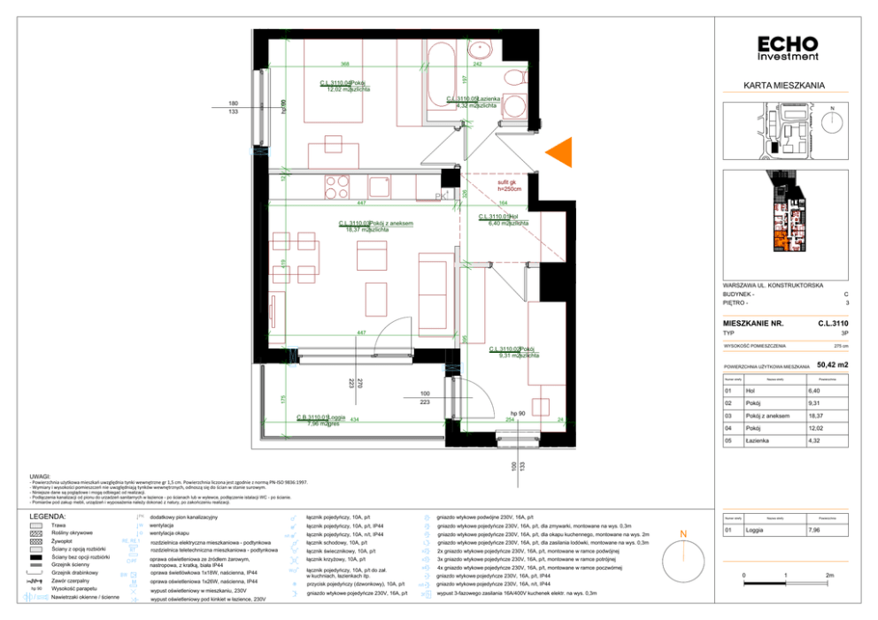 242 197 368 C.L.3110.04Pokój 12,02 m2szlichta 9 326 12 sufit gk h=250cm 164 8 7 11 6 5 13 4 18 x 17 = 310 14 15 PK 447 N 12 hp311 90 C.L.3110.05Łazienka 4,32 m2szlichta 10 180 133 KARTA MIESZKANIA 3 2 1 16 17 C.L.3110.01Hol 6,40 m2szlichta 419 C.L.3110.03Pokój z aneksem 18,37 m2szlichta WARSZAWA UL. KONSTRUKTORSKA BUDYNEK - C PIĘTRO - 3 MIESZKANIE NR. 447 C.L.3110 395 TYP 3P WYSOKOŚĆ POMIESZCZENIA C.L.3110.02Pokój 9,31 m2szlichta 275 cm POWIERZCHNIA UŻYTKOWA MIESZKANIA 270 223 Numer strefy 175 100 223 hp 90 C.B.3110.01Loggia 434 7,96 m2gres 24 Powierzchnia 01 Hol 6,40 02 Pokój 9,31 03 Pokój z aneksem 18,37 04 Pokój 12,02 05 Łazienka 4,32 100 133 254 Nazwa strefy 50,42 m2 UWAGI: - Powierzchnia użytkowa mieszkań uwzględnia tynki wewnętrzne gr 1,5 cm. Powierzchnia liczona jest zgodnie z normą PN-ISO 9836:1997. - Wymiary i wysokości pomieszczeń nie uwzględniają tynków wewnętrznych, odnoszą się do ścian w stanie surowym. - Niniejsze dane są poglądowe i mogą odbiegać od realizacji. - Podłączenia kanalizacji od pionu do urzadzeń sanitarnych w łazience - po ścianach lub w wylewce, podłączenie istalacji WC - po ścianie. - Pomiarów pod zakup mebli, urządzeń i wyposażenia należy dokonać z natury, po zakończeniu realizacji. LEGENDA: Trawa Rośliny okrywowe Żywopłot hp 90 / łącznik pojedyńczy, 10A, p/t 2 gniazdo wtykowe podwójne 230V, 16A, p/t wentylacja wentylacja okapu łącznik pojedyńczy, 10A, p/t, IP44 z gniazdo wtykowe pojedyńcze 230V, 16A, p/t, dla zmywarki, montowane na wys. 0,3m łącznik pojedyńczy, 10A, n/t, IP44 o gniazdo wtykowe pojedyńcze 230V, 16A, p/t, dla okapu kuchennego, montowane na wys. 2m RE, RE.1 RT Ściany bez opcji rozbiórki Grzejnik ścienny Zawór czerpalny dodatkowy pion kanalizacyjny W O Ściany z opcją rozbiórki Grzejnik drabinkowy PK PF BW M n/t rozdzielnica elektryczna mieszkaniowa - podtynkowa rozdzielnica teletechniczna mieszkaniowa - podtynkowa łącznik schodowy, 10A, p/t łącznik świecznikowy, 10A, p/t x2 2x gniazdo wtykowe pojedyńcze 230V, 16A, p/t, montowane w ramce podwójnej oprawa oświetleniowa ze źródłem żarowym, nastropowa, z kratką, biała IP44 oprawa świetlówkowa 1x18W, naścienna, IP44 łącznik krzyżowy, 10A, p/t x3 3x gniazdo wtykowe pojedyńcze 230V, 16A, p/t, montowane w ramce potrójnej oprawa oświetleniowa 1x26W, naścienna, IP44 Wysokość parapetu wypust oświetleniowy w mieszkaniu, 230V Nawietrzaki okienne / ścienne wypust oświetleniowy pod kinkiet w łazience, 230V W łącznik pojedyńczy, 10A, p/t do zał. w kuchniach, łazienkach itp. przycisk pojedyńczy (dzwonkowy), 10A, p/t gniazdo wtykowe pojedyńcze 230V, 16A, p/t L x4 3f N Nazwa strefy 01 Powierzchnia Loggia 7,96 gniazdo wtykowe pojedyńcze 230V, 16A, p/t, dla zasilania lodówki, montowane na wys. 0,3m 4x gniazdo wtykowe pojedyńcze 230V, 16A, p/t, montowane w ramce poczwórnej gniazdo wtykowe pojedyńcze 230V, 16A, p/t, IP44 n/t Numer strefy gniazdo wtykowe pojedyńcze 230V, 16A, n/t, IP44 wypust 3-fazowego zasilania 16A/400V kuchenek elektr. na wys. 0,3m 0 1 2m