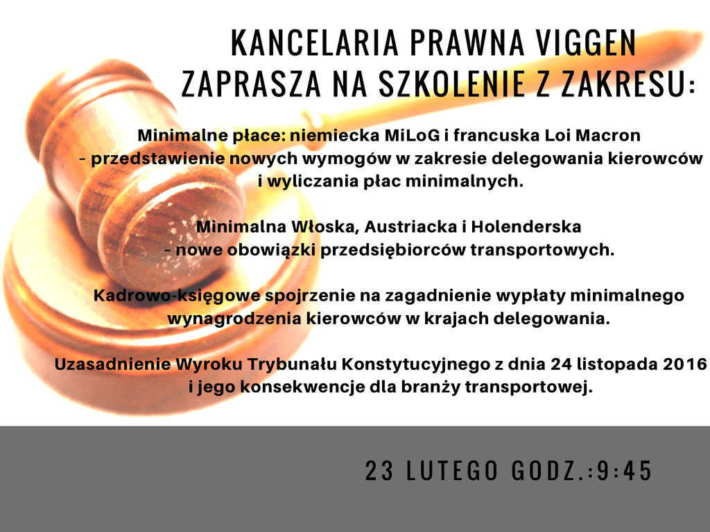 KANCELARIA PRAWNA VIGGEN ZAPRASZA NA SZKOLENIE Z ZAKRESU: Minimalne płace: niemiecka MiLoG i francuska Loi Macron – przedstawienie nowych wymogów w zakresie delegowania kierowców i wyliczania płac minimalnych. Minimalna Włoska, Austriacka i Holenderska – nowe obowiązki przedsiębiorców transportowych. Kadrowo-księgowe spojrzenie na zagadnienie wypłaty minimalnego wynagrodzenia kierowców w krajach delegowania. Uzasadnienie Wyroku Trybunału Konstytucyjnego z dnia 24 listopada 2016 i jego konsekwencje dla branży transportowej. 23 LUTEGO GODZ.:9:45 HARMONOGRAM SZKOLENIA: 9:45 -10:45 - Podsumowanie dotychczasowego okresu obowiązywania dekretu LOI MACRON oraz przedstawienie zmian obowiązujących od 2017r. Delegowanie pracowników do Republiki Niemiec oraz wypłata płacy minimalnej MILOG po 1 stycznia 2017r. - Daniel Wielgus, Prawnik Kancelarii Prawnej Viggen sp.j. - Wymogi dla przedsiębiorców i kierowców. - - Niezbędne wymogi w dokumentacji. Zmiany w delegowaniu po 1 stycznia 2017r. Jak prawidłowo wypełnić dokumentacje w systemie SIPSI? 10:45-11:15 - MINIMALNA HOLENDER SKA - Maciej Ostrowski Prawnik Kancelarii Prawnej Viggen sp.j. - Przepisy wymuszając e swoje zastosowan ie a ) minimalna stawka wynagrodze nia za pracę na terenie Królestwa Niderlandów b ) inne obowiązki ( wymiar czasu pracy, dodatki do wynagrodze nia, ewidencja czasu pracy ) - Przedstawic ielstwo a ) kto może być przedstawic ielem? b ) obowiązki przedstawic iela - Dokumenta cja kontrolowan a przez organy holenderski e - Zasady rozliczania dopłat do minimalnej stawki holenderski ej w Polsce - 11:15-11:30 - PRZERWA KAWOWA 11:30 – 12:30 MINIMALNA AUSTRIACKA – Anna Nowak – - stażysta w Kancelarii Prawnej Viggen sp.j. Wprowadzenie LSD - BG a zmiany dotyczące transportu wprowadzenie. - Formularz delegowania : a ) podstawa prawna wprowadzenia obowiązku b ) analiza poszczególnych informacji koniecznych do uzupełnienia każdego z formularzy c ) osoba uprawniona do reprezentacji a osoba uprawniona do kontaktu - analiza pojęcia Warunki pracy i wynagrodzenia na terenie Austrii w związku z wprowadzeniem ,,Austriackiego układu zbiorowego dla branży transportowej " - 12:30 - 13:00 MINIMALNA WŁOSKA - obowiązki przedsiębiorcy na podstawie dekretu, który wszedł w życie 27.12.2016r. - Małgorzata Pelc Prawnik Kancelarii Prawnej Viggen sp.j. - - Jakie wymogi obowiązują przedsiębiorców wykonujących kabotaż na terenie Włoch? W jaki sposób dokonywać zgłoszenia pracownika delegowanego, jak wypełnić formularz zgłoszeniowy? - Kim jest przedstawiciel i jakie są jego obowiązki? 13:00 – 14:00 PROGRAM VTS - Program kadrowo - księgowy stworzony przez prawników do obsługi wyliczenia wynagrodzeń należnych kierowcom w firmach transportowych – Maria Krawczyk - Prawnik Kancelarii Prawnej Viggen sp.j. Jak wyliczyć płacę minimalną: niemiecką, francuską , włoską, austriacką i holenderską na podstawie danych, które już masz. - 14:00 - 15:00 PRZERWA OBIADOWA 15:00 - 16:30 Co oznacza Wyrok Trybunału Konstytucyjnego z dnia 24 listopada 2016r. i jakie mogą być jego konsekwencje dla branży transportowej? Mariusz Miąsko, Prezes Kancelarii Prawnej Viggen sp.j. 16:30 PYTANIA UCZESTNIKÓW ZAPRASZAMY : 502 189 280, [email protected] Renata Domagalska : 519 140 984, [email protected] Jolanta Kur : 606 589 800, [email protected] Jakub Figuła : (12) 637 24 57 lub , ZADZWOŃ ZAPISZ SIĘ I WEŹ UDZIAŁ W TYM WYDARZENIU