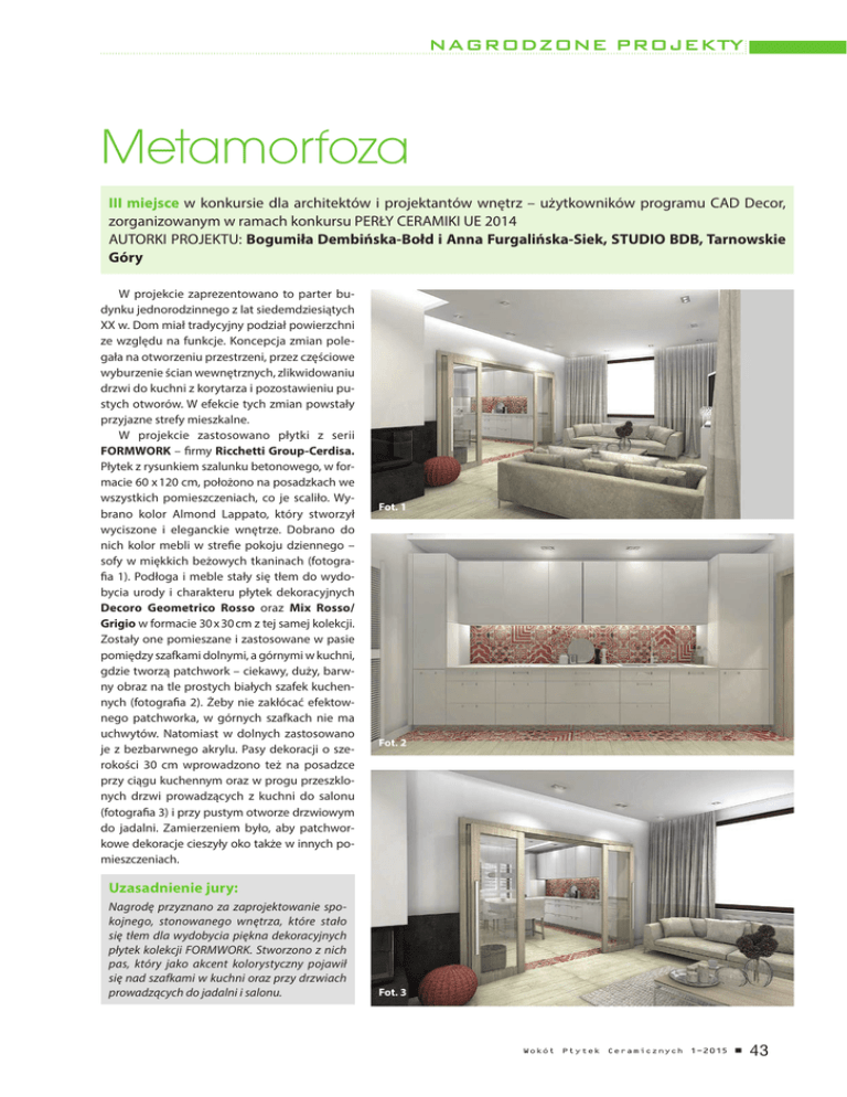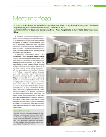 N A GRODZ ONE P ROJEKTY Metamorfoza III miejsce w konkursie dla architektów i projektantów wnętrz – użytkowników programu CAD Decor, zorganizowanym w ramach konkursu PERŁY CERAMIKI UE 2014 AUTORKI PROJEKTU: Bogumiła Dembińska-Bołd i Anna Furgalińska-Siek, STUDIO BDB, Tarnowskie Góry W projekcie zaprezentowano to parter budynku jednorodzinnego z lat siedemdziesiątych XX w. Dom miał tradycyjny podział powierzchni ze względu na funkcje. Koncepcja zmian polegała na otworzeniu przestrzeni, przez częściowe wyburzenie ścian wewnętrznych, zlikwidowaniu drzwi do kuchni z korytarza i pozostawieniu pustych otworów. W efekcie tych zmian powstały przyjazne strefy mieszkalne. W projekcie zastosowano płytki z serii FORMWORK – firmy Ricchetti Group-Cerdisa. Płytek z rysunkiem szalunku betonowego, w formacie 60 x 120 cm, położono na posadzkach we wszystkich pomieszczeniach, co je scaliło. Wybrano kolor Almond Lappato, który stworzył wyciszone i eleganckie wnętrze. Dobrano do nich kolor mebli w strefie pokoju dziennego – sofy w miękkich beżowych tkaninach (fotografia 1). Podłoga i meble stały się tłem do wydobycia urody i charakteru płytek dekoracyjnych Decoro Geometrico Rosso oraz Mix Rosso/ Grigio w formacie 30 x 30 cm z tej samej kolekcji. Zostały one pomieszane i zastosowane w pasie pomiędzy szafkami dolnymi, a górnymi w kuchni, gdzie tworzą patchwork – ciekawy, duży, barwny obraz na tle prostych białych szafek kuchennych (fotografia 2). Żeby nie zakłócać efektownego patchworka, w górnych szafkach nie ma uchwytów. Natomiast w dolnych zastosowano je z bezbarwnego akrylu. Pasy dekoracji o szerokości 30 cm wprowadzono też na posadzce przy ciągu kuchennym oraz w progu przeszklonych drzwi prowadzących z kuchni do salonu (fotografia 3) i przy pustym otworze drzwiowym do jadalni. Zamierzeniem było, aby patchworkowe dekoracje cieszyły oko także w innych pomieszczeniach. Fot. 1 Fot. 2 Uzasadnienie jury: Nagrodę przyznano za zaprojektowanie spokojnego, stonowanego wnętrza, które stało się tłem dla wydobycia piękna dekoracyjnych płytek kolekcji FORMWORK. Stworzono z nich pas, który jako akcent kolorystyczny pojawił się nad szafkami w kuchni oraz przy drzwiach prowadzących do jadalni i salonu. Fot. 3 Wokół Płytek Ceramicznych 1-2015 n 43