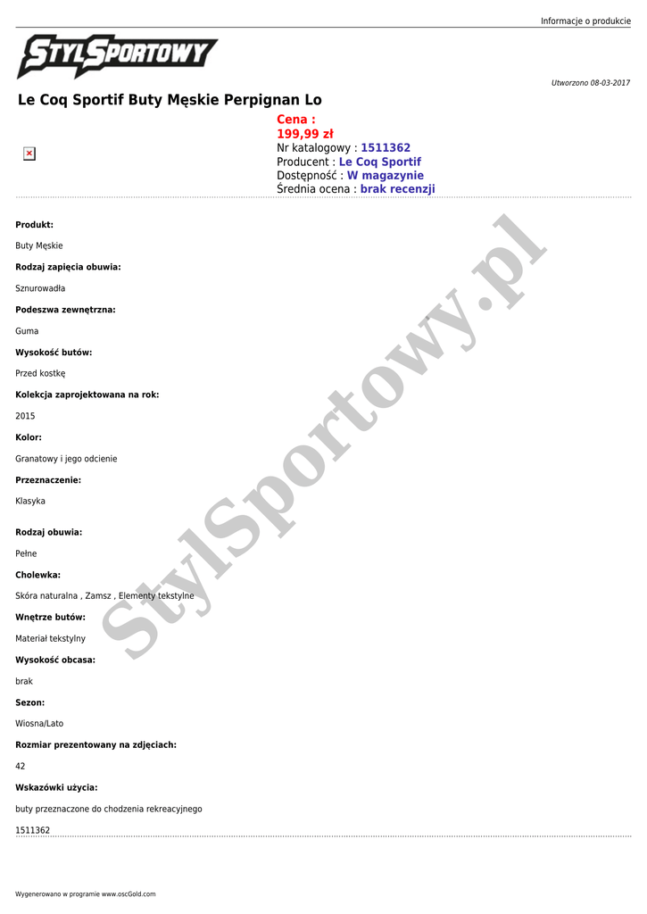 Informacje o produkcie Utworzono 08-03-2017 Le Coq Sportif Buty Męskie Perpignan Lo Cena : 199,99 zł Nr katalogowy : 1511362 Producent : Le Coq Sportif Dostępność : W magazynie Średnia ocena : brak recenzji Produkt: pl Buty Męskie Rodzaj zapięcia obuwia: y. Sznurowadła Podeszwa zewnętrzna: Wysokość butów: Przed kostkę Kolekcja zaprojektowana na rok: 2015 Kolor: Granatowy i jego odcienie Klasyka Rodzaj obuwia: Pełne St y Cholewka: lS p Przeznaczenie: or to w Guma Skóra naturalna , Zamsz , Elementy tekstylne Wnętrze butów: Materiał tekstylny Wysokość obcasa: brak Sezon: Wiosna/Lato Rozmiar prezentowany na zdjęciach: 42 Wskazówki użycia: buty przeznaczone do chodzenia rekreacyjnego 1511362 Wygenerowano w programie www.oscGold.com Dostępne opcje Le Coq Sportif Buty Męskie Perpignan Lo St y lS p or to w y. pl Rozmiar: 42, 40, 41, 43, 44, 45, 46, 47.