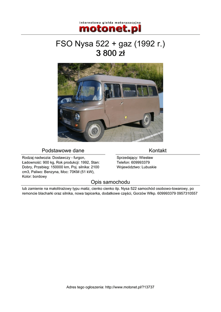 FSO Nysa 522 + gaz (1992 r.) 3 800 zł Podstawowe dane Kontakt Rodzaj nadwozia: Dostawczy - furgon, Ładowność: 900 kg, Rok produkcji: 1992, Stan: Dobry, Przebieg: 150000 km, Poj. silnika: 2100 cm3, Paliwo: Benzyna, Moc: 70KM (51 kW), Kolor: bordowy Sprzedający: Wiesław Telefon: 609993379 Województwo: Lubuskie Opis samochodu lub zamienie na małolitrażowy typu matiz, cienko cienko itp. Nysa 522 samochód osobowo-towarowy, po remoncie blacharki oraz silnika, nowa tapicerka, dodatkowe części, Gorzów Wlkp. 609993379 0957310557 Adres tego ogłoszenia: http://www.motonet.pl/?13737