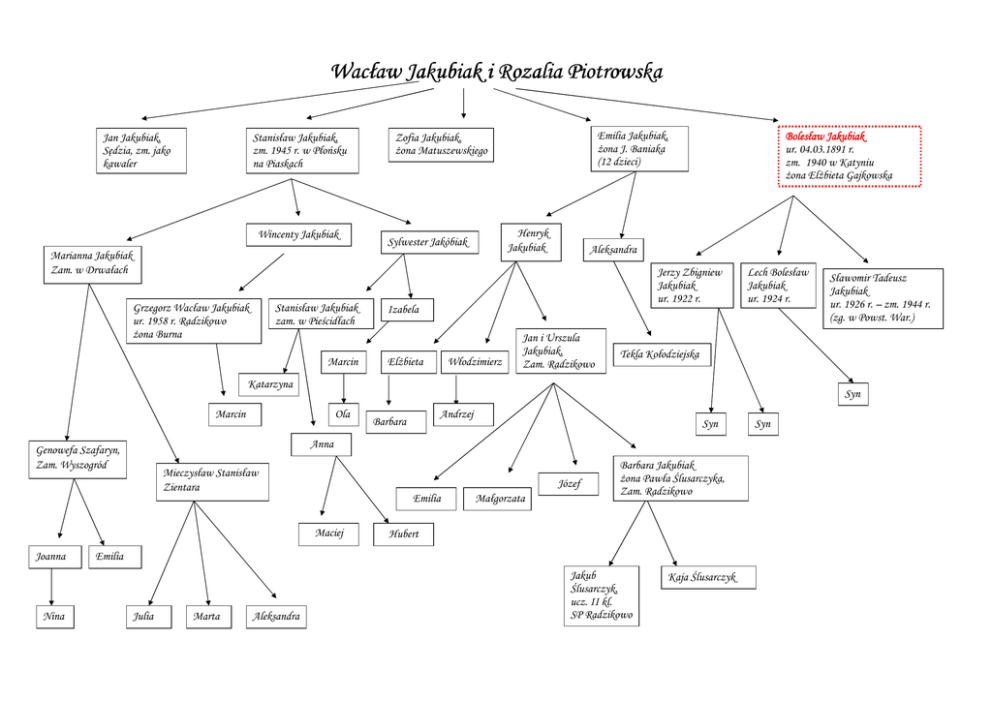 Wacław Jakubiak i Rozalia Piotrowska Jan Jakubiak, Sędzia, zm. jako kawaler Stanisław Jakubiak, zm. 1945 r. w Płońsku na Piaskach Wincenty Jakubiak Henryk Jakubiak Sylwester Jakóbiak Marianna Jakubiak Zam. w Drwałach Grzegorz Wacław Jakubiak ur. 1958 r. Radzikowo Ŝona Burna Stanisław Jakubiak zam. w Pieścidłach Marcin Emilia Jakubiak, Ŝona J. Baniaka (12 dzieci) Zofia Jakubiak, Ŝona Matuszewskiego Bolesław Jakubiak ur. 04.03.1891 r. zm. 1940 w Katyniu Ŝona ElŜbieta Gajkowska Aleksandra Jerzy Zbigniew Jakubiak ur. 1922 r. Izabela ElŜbieta Włodzimierz Jan i Urszula Jakubiak, Zam. Radzikowo Lech Bolesław Jakubiak ur. 1924 r. Tekla Kołodziejska Katarzyna Syn Marcin Ola Andrzej Barbara Mieczysław Stanisław Zientara Józef Emilia Maciej Joanna Nina Syn Anna Genowefa Szafaryn, Zam. Wyszogród Małgorzata Barbara Jakubiak Ŝona Pawła Ślusarczyka, Zam. Radzikowo Hubert Emilia Julia Marta Aleksandra Sławomir Tadeusz Jakubiak ur. 1926 r. – zm. 1944 r. (zg. w Powst. War.) Jakub Ślusarczyk, ucz. II kl. SP Radzikowo Kaja Ślusarczyk Syn