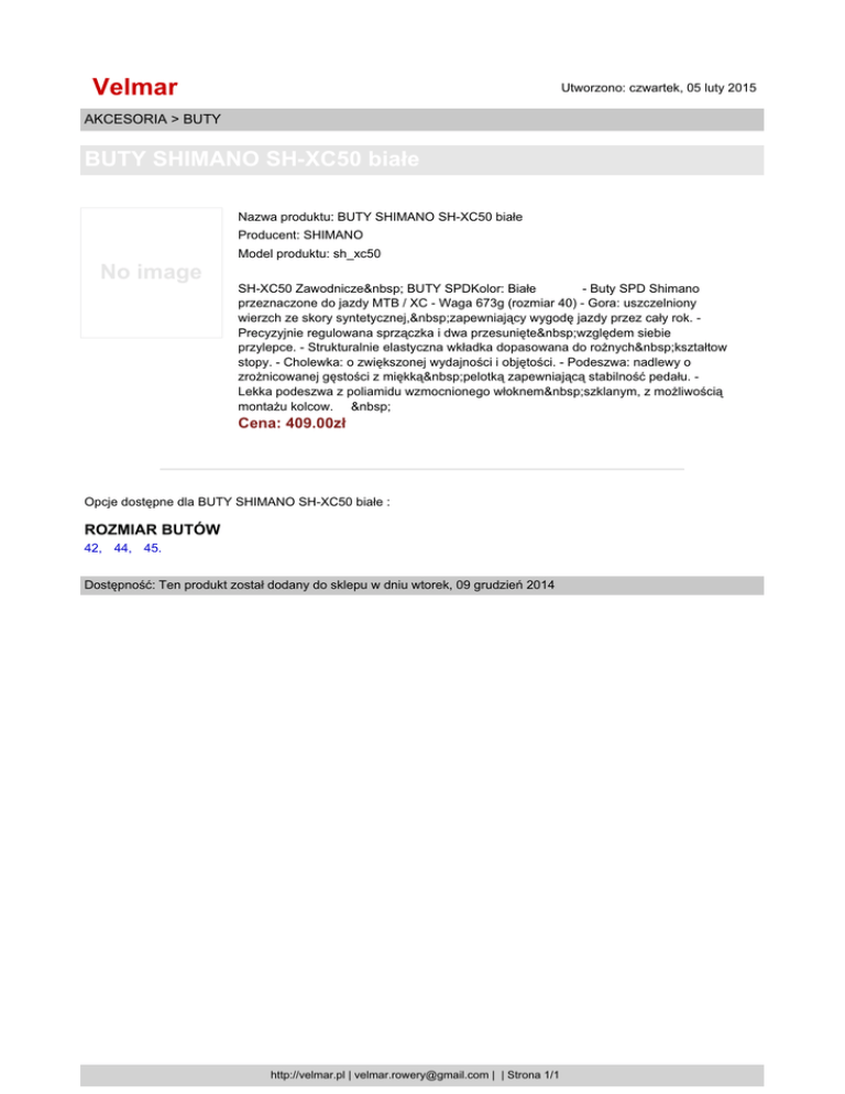 Velmar Utworzono: czwartek, 05 luty 2015 AKCESORIA > BUTY BUTY SHIMANO SH-XC50 białe Nazwa produktu: BUTY SHIMANO SH-XC50 białe Producent: SHIMANO Model produktu: sh_xc50 No image SH-XC50 Zawodnicze BUTY SPDKolor: Białe - Buty SPD Shimano przeznaczone do jazdy MTB / XC - Waga 673g (rozmiar 40) - Gora: uszczelniony wierzch ze skory syntetycznej, zapewniający wygodę jazdy przez cały rok. Precyzyjnie regulowana sprzączka i dwa przesunięte względem siebie przylepce. - Strukturalnie elastyczna wkładka dopasowana do rożnych kształtow stopy. - Cholewka: o zwiększonej wydajności i objętości. - Podeszwa: nadlewy o zrożnicowanej gęstości z miękką pelotką zapewniającą stabilność pedału. Lekka podeszwa z poliamidu wzmocnionego włoknem szklanym, z możliwością montażu kolcow. Cena: 409.00zł Opcje dostępne dla BUTY SHIMANO SH-XC50 białe : ROZMIAR BUTÓW 42, 44, 45. Dostępność: Ten produkt został dodany do sklepu w dniu wtorek, 09 grudzień 2014 http://velmar.pl | [email protected] | | Strona 1/1
