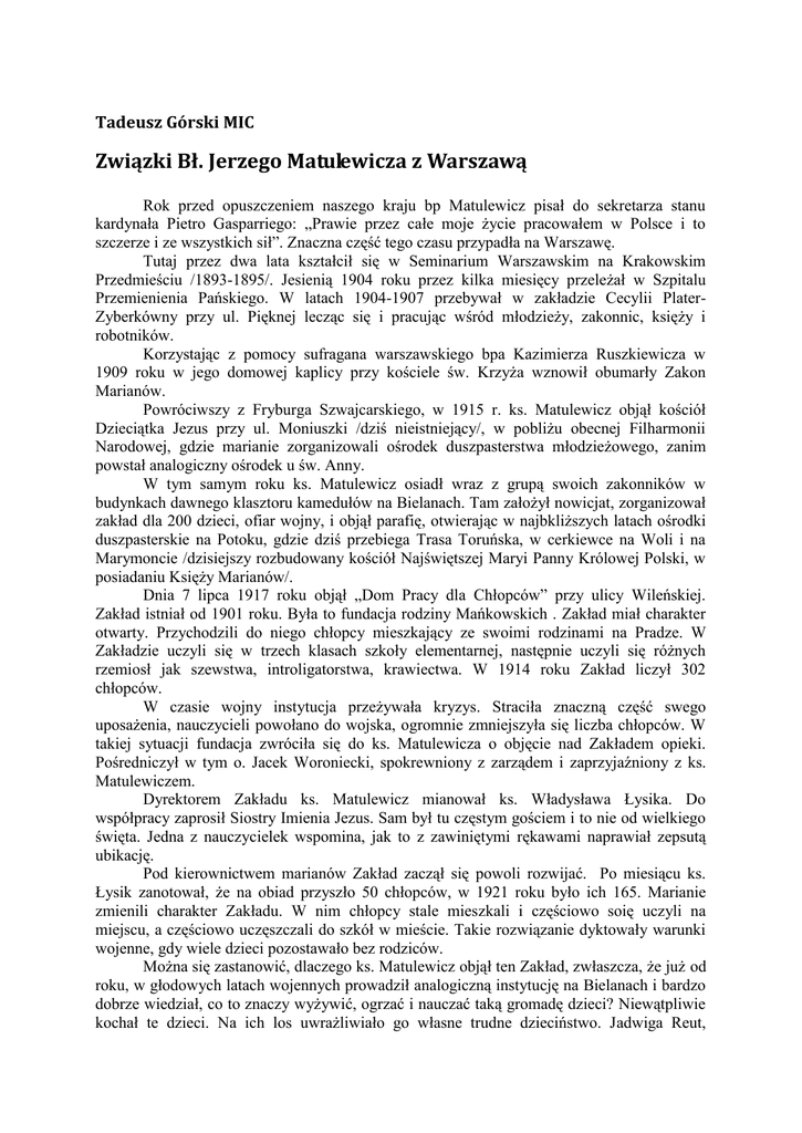 Tadeusz Górski MIC Związki Bł. Jerzego Matulewicza z Warszawą Rok przed opuszczeniem naszego kraju bp Matulewicz pisał do sekretarza stanu kardynała Pietro Gasparriego: „Prawie przez całe moje życie pracowałem w Polsce i to szczerze i ze wszystkich sił”. Znaczna część tego czasu przypadła na Warszawę. Tutaj przez dwa lata kształcił się w Seminarium Warszawskim na Krakowskim Przedmieściu /1893-1895/. Jesienią 1904 roku przez kilka miesięcy przeleżał w Szpitalu Przemienienia Pańskiego. W latach 1904-1907 przebywał w zakładzie Cecylii PlaterZyberkówny przy ul. Pięknej lecząc się i pracując wśród młodzieży, zakonnic, księży i robotników. Korzystając z pomocy sufragana warszawskiego bpa Kazimierza Ruszkiewicza w 1909 roku w jego domowej kaplicy przy kościele św. Krzyża wznowił obumarły Zakon Marianów. Powróciwszy z Fryburga Szwajcarskiego, w 1915 r. ks. Matulewicz objął kościół Dzieciątka Jezus przy ul. Moniuszki /dziś nieistniejący/, w pobliżu obecnej Filharmonii Narodowej, gdzie marianie zorganizowali ośrodek duszpasterstwa młodzieżowego, zanim powstał analogiczny ośrodek u św. Anny. W tym samym roku ks. Matulewicz osiadł wraz z grupą swoich zakonników w budynkach dawnego klasztoru kamedułów na Bielanach. Tam założył nowicjat, zorganizował zakład dla 200 dzieci, ofiar wojny, i objął parafię, otwierając w najbkliższych latach ośrodki duszpasterskie na Potoku, gdzie dziś przebiega Trasa Toruńska, w cerkiewce na Woli i na Marymoncie /dzisiejszy rozbudowany kościół Najświętszej Maryi Panny Królowej Polski, w posiadaniu Księży Marianów/. Dnia 7 lipca 1917 roku objął „Dom Pracy dla Chłopców” przy ulicy Wileńskiej. Zakład istniał od 1901 roku. Była to fundacja rodziny Mańkowskich . Zakład miał charakter otwarty. Przychodzili do niego chłopcy mieszkający ze swoimi rodzinami na Pradze. W Zakładzie uczyli się w trzech klasach szkoły elementarnej, następnie uczyli się różnych rzemiosł jak szewstwa, introligatorstwa, krawiectwa. W 1914 roku Zakład liczył 302 chłopców. W czasie wojny instytucja przeżywała kryzys. Straciła znaczną część swego uposażenia, nauczycieli powołano do wojska, ogromnie zmniejszyła się liczba chłopców. W takiej sytuacji fundacja zwróciła się do ks. Matulewicza o objęcie nad Zakładem opieki. Pośredniczył w tym o. Jacek Woroniecki, spokrewniony z zarządem i zaprzyjaźniony z ks. Matulewiczem. Dyrektorem Zakładu ks. Matulewicz mianował ks. Władysława Łysika. Do współpracy zaprosił Siostry Imienia Jezus. Sam był tu częstym gościem i to nie od wielkiego święta. Jedna z nauczycielek wspomina, jak to z zawiniętymi rękawami naprawiał zepsutą ubikację. Pod kierownictwem marianów Zakład zaczął się powoli rozwijać. Po miesiącu ks. Łysik zanotował, że na obiad przyszło 50 chłopców, w 1921 roku było ich 165. Marianie zmienili charakter Zakładu. W nim chłopcy stale mieszkali i częściowo soię uczyli na miejscu, a częściowo uczęszczali do szkół w mieście. Takie rozwiązanie dyktowały warunki wojenne, gdy wiele dzieci pozostawało bez rodziców. Można się zastanowić, dlaczego ks. Matulewicz objął ten Zakład, zwłaszcza, że już od roku, w głodowych latach wojennych prowadził analogiczną instytucję na Bielanach i bardzo dobrze wiedział, co to znaczy wyżywić, ogrzać i nauczać taką gromadę dzieci? Niewątpliwie kochał te dzieci. Na ich los uwrażliwiało go własne trudne dzieciństwo. Jadwiga Reut, długoletnia dyrektorka gimnazjum Plater-Zyberkówny na Pięknej wspomina jego troskę o sierociniec na Bielanach, co z całą pewnością można odnieść i do Zakładu Mańkowskich. Pisze: „W roku 1916 miałam dopilnować Ojca, gdy miał wpaść do nas na chwilkę, żeby zechciał się posilić. Była już pora spóźniona, więc o. Matulewicz musiał być głodny i bardzo zmęczony, bo kilka godzin stał w ogonku dla swego sierocińca na Bielanach. Nie zasiadł jerdnak do stołu, dopóki z wielką radością nie opowiedział mi, ile udało mu się wyjednać mąki, tłuszczu, kaszy i chleba dla tej masy biednych dzieci. „ A teraz – powiedział – jestem głodny, będę jadł z apetytem, bo moje dzieci nie będą głodować”. Czułam jak kocha te dzieci, jak mu są drogie, jak mu na nich zależy. Kiedy w czasie pobytu na stolicy biskupiej na Litwie zarzucano mu, że jest nieprzychylnie usposobiony do Polaków, przypomniałam sobie opisaną chwilę. Poświęcał się jak najlepszy Polak dla naszych dzieci. To nie były słowa, to były czyny człowieka, który w każdym widzi dziecko Boże i jemu służy”. Jego poświęcenie dla dzieci Warszawy i talent z jakim to robił były znane i cenione przez otoczenie, a przede wszystkim przez instytucje, z którymi załatwiał sprawy. Zarząd miasta Warszawy 22 września 1916 roku wybrał go na członka /używając dzisiejszego języka powiedzielibyśmy, że został radnym miasta/. Dnia 22 lutego 1918 roku te same władze miejskie powołały go na „członka Komisji Opieki nad Dziećmi” z powołaniem się na regulamin Komisji, który głosił, że do tego gremium mogą należeć obywatele miasta „znani ze swej działalności filantropijnej i nie szczędzący pracy nad ulżeniem losu nieszczęśliwych a bezbronnych dzieci”. Dnia 21 marca 1917 roku został powołany na członka Rady Głównej Opiekuńczej powiatu warszawskiego. Minister Wyznań Religijnych i Oświecenia Publicznego Antoni Ponikowski 31 stycznia 1918 roku mianował ks. Matulewicza członkiem Rady Szkolnej Okręgu Warszawskiego /powołał go do kuratorium/. Z kolei prefekci szkolni metropolii warszawskiej, obradujący na swym zjeździe 20-22 czerwca 1917 roku w Warszawie, wybrali go jednogłośnie na przewodniczącego zjazdu. Niemniej ceniły go władze kościelne. Znając jego zaangażowanie w sprawy wychowania i wykształcenia duchowieństwa, w 1915 roku powołały go do komisji 