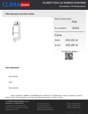 Filtr-Osuszacz do Fiat Croma Marka samochodu: Fiat Nr. produktu: G201 Cena Netto: 101,63 zł Brutto: 125,00 zł Przejdź do sklepu OPIS PRODUKTU Kod produktu: G201 Opis produktu: Numer oryginału: 1848044 / 24418368Czynnik chłodniczy: R-134aWymiary "wejscie": Wymiary "wyjście": Średnica filtra: Rocznik pojazdu: Fiat Croma (05-)Pojemność silnika: 1.8 16V / 2.2 16V © CLIMA TEAM Spółka z o.o. Doradztwo i Profesjonalizm Tel: (022) 817 83 01 Mobile: 0 501 642 528 ul. Staniewicka 2 03-310 Warszawa Fax: (022) 817 84 49 Mobile: 0 501 642 529 Zapraszamy od poniedziałku do piątku [email protected] Mobile: 0 500 119 528 w godz. 9:00 - 17:00 [email protected] projekt GRAFCOM | Netler Shop 1.020 © CLIMA TEAM Spółka z o.o. Doradztwo i Profesjonalizm Tel: (022) 817 83 01 Mobile: 0 501 642 528 ul. Staniewicka 2 03-310 Warszawa Fax: (022) 817 84 49 Mobile: 0 501 642 529 Zapraszamy od poniedziałku do piątku [email protected] Mobile: 0 500 119 528 w godz. 9:00 - 17:00 [email protected] projekt GRAFCOM | Netler Shop 1.020