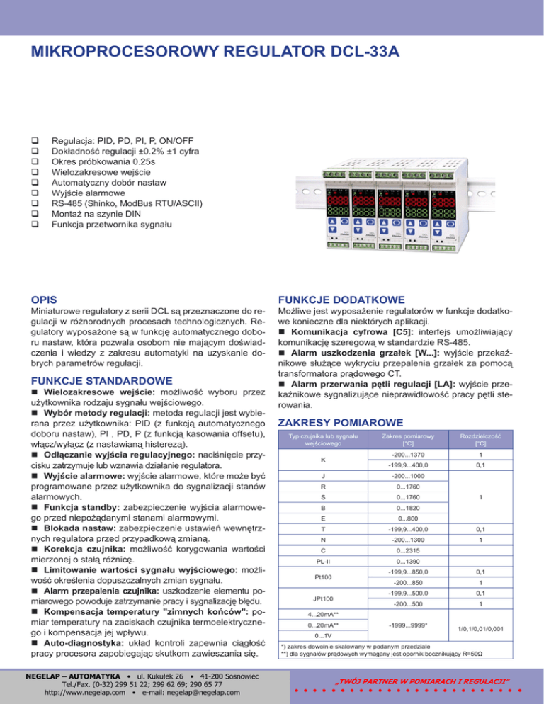 MIKROPROCESOROWY REGULATOR DCL-33A Regulacja: PID, PD, PI, P, ON/OFF Dokładność regulacji ±0.2% ±1 cyfra Okres próbkowania 0.25s Wielozakresowe wejście Automatyczny dobór nastaw Wyjście alarmowe RS-485 (Shinko, ModBus RTU/ASCII) Montaż na szynie DIN Funkcja przetwornika sygnału OPIS Miniaturowe regulatory z serii DCL są przeznaczone do regulacji w różnorodnych procesach technologicznych. Regulatory wyposażone są w funkcję automatycznego doboru nastaw, która pozwala osobom nie mającym doświadczenia i wiedzy z zakresu automatyki na uzyskanie dobrych parametrów regulacji. FUNKCJE STANDARDOWE Wielozakresowe wejście: możliwość wyboru przez użytkownika rodzaju sygnału wejściowego. Wybór metody regulacji: metoda regulacji jest wybierana przez użytkownika: PID (z funkcją automatycznego doboru nastaw), PI , PD, P (z funkcją kasowania offsetu), włącz/wyłącz (z nastawianą histerezą). Odłączanie wyjścia regulacyjnego: naciśnięcie przycisku zatrzymuje lub wznawia działanie regulatora. Wyjście alarmowe: wyjście alarmowe, które może być programowane przez użytkownika do sygnalizacji stanów alarmowych. Funkcja standby: zabezpieczenie wyjścia alarmowego przed niepożądanymi stanami alarmowymi. Blokada nastaw: zabezpieczenie ustawień wewnętrznych regulatora przed przypadkową zmianą. Korekcja czujnika: możliwość korygowania wartości mierzonej o stałą różnicę. Limitowanie wartości sygnału wyjściowego: możliwość określenia dopuszczalnych zmian sygnału. Alarm przepalenia czujnika: uszkodzenie elementu pomiarowego powoduje zatrzymanie pracy i sygnalizację błędu. Kompensacja temperatury "zimnych końców": pomiar temperatury na zaciskach czujnika termoelektrycznego i kompensacja jej wpływu. Auto-diagnostyka: układ kontroli zapewnia ciągłość pracy procesora zapobiegając skutkom zawieszania się. #$$%& ' % ( ! ( & ' ! %) ' "" % ( FUNKCJE DODATKOWE Możliwe jest wyposażenie regulatorów w funkcje dodatkowe konieczne dla niektórych aplikacji. Komunikacja cyfrowa [C5]: interfejs umożliwiający komunikację szeregową w standardzie RS-485. Alarm uszkodzenia grzałek [W...]: wyjście przekaźnikowe służące wykryciu przepalenia grzałek za pomocą transformatora prądowego CT. Alarm przerwania pętli regulacji [LA]: wyjście przekaźnikowe sygnalizujące nieprawidłowość pracy pętli sterowania. ZAKRESY POMIAROWE Typ czujnika lub sygnału wejściowego K Zakres pomiarowy [°C] Rozdzielczość [°C] -200...1370 1 -199,9...400,0 0,1 J -200...1000 R 0...1760 S 0...1760 B 0...1820 1 E 0...800 T -199,9...400,0 0,1 N -200...1300 1 C 0...2315 PL-II Pt100 JPt100 0...1390 -199,9...850,0 0,1 -200...850 1 -199,9...500,0 0,1 -200...500 1 4...20mA** 0...20mA** 0...1V -1999...9999* 1/0,1/0,01/0,001 *) zakres dowolnie skalowany w podanym przedziale **) dla sygnałów prądowych wymagany jest opornik bocznikujący R=50Ω DANE TECHNICZNE SPOSÓB ZAMAWIANIA DCL -33A Funkcje standardowe Wartość mierzona (PV): 4 czerwone cyfry 7,5x4,1mm Wartość nastawy (SV): 4 zielone cyfry 7,5x4,1mm Wyświetlanie Wyjście - R S /M, , , 22,5x75x100mm Przekaźnikowe Logiczne SSR 0...12VDC A Wejście Wejścia Termopary: max. rezyst. wew. 100Ω RTD: linia 3-przew., max. rezyst. linii 10Ω na przewód Prądowe: 0(4)...20mA - imp. wej. 50Ω (wymagany opornik bocznikujący R=50Ω) Napięciowe: 0...1V - imp. wej. 1MΩ, max. imp. źródła 2kΩ Dokładność Termopary: ±0,2% zakresu ±1 cyfra (z uwzględnieniem błędu kompensacji temperatury zimnych końców) z wyjątkiem: - R lub S: (0...200°C): ±6°C - B: (0...300°C): nie gwarantowana - K, J, E, T, N: poniżej 0°C ±0,4% zakresu ±1 cyfra RTD: ±0,2% zakresu ±1 cyfra lub ±1°C Prądowe i napięciowe: ±0,2% zakresu ±1 cyfra Okres próbkowania 250ms Wyjście regulacyjne Do wyboru przy zamawianiu: Przekaźnikowe: 3A, 250VAC obc. rezyst. lub 1A, 250VAC obc. induk. Logiczne SSR: 12VDC, max. 40mA Analogowe prądowe: 4...20mA, max. obc. 550Ω Metoda regulacji - PID z funkcją automatycznego doboru nastaw - PD, PI, P z funkcją kasowania offsetu - ON/OFF (włącz/wyłącz - dwustawna) Strefa proporcjonalności (P): 0,0...110,0% Czas zdwojenia (I): 0...1000s Czas wyprzedzenia (D): 0...300s Cykl proporcjonalności: 1...120s ARW: 0...100% Histereza (regulacja ON/OFF): termopary i RTD: 0.1...100,0°C, prądowe i napięciowe: 1...1000 (z ustawionym punktem dziesiętnym) Alarm A1 Wyjście typu open collector: 0,1A, 24VDC; sposób działania wybierany: górna, dolna, obustronna odchyłka, strefa odchyłek, górny, dolny próg Zasilanie Do wyboru przy zamawianiu: 100...240VAC 50/60Hz (zakres zmian 85...264VAC) lub 24VAC/DC (zakres zmian 20...28VAC/DC) Pobór mocy Ok. 6VA Izolacja, wytrzymałość elektryczna Rezystancja izolacji: min 10MΩ przy 500VDC (oprócz zacisków nieizolowanych) Wytrzymałość elektryczna: 1,5kV przez 1 min. pomiędzy parami zacisków: wejście - uziemienie, wejście - zasilanie, wyjście - uziemienie, wyjście - zasilanie i zasilanie - uziemienie Parametry środowiska Temperatura otoczenia: 0...50°C Wilgotność: 35...85% bez kondensacji Stopień ochrony IP40 Masa Ok. 150g Materiał obudowy Poliwęglan Opcje Prądowe 4...20mA M Wielozakresowe W(5A) W(10A) W(20A) W(50A) C5 LA 5A 10A Alarm przepale20A nia grzałki 50A Interfejs szeregowy RS-485 Alarm przerwania pętli regulacji Uwagi: - dla wyjścia prądowego niedostępna opcja [W...] - standardowe zasilanie 100...240VAC, inne należy określić przy zamawianiu WYMIARY TRANSFORMATORY PRĄDOWE CTL PANEL OPERATORSKI OMR-100 Opcje Interfejs komunikacyjny [C5] EIA RS485 Prędkość transmisji: 2400, 4800, 9600, 19200 Metoda komunikacji: pół-duplex, synchronizacja start-stop Format danych: 1 bit startu, 7 bitów danych, 1 bit parzystości, 1 bit stopu Protokół komunikacji: Shinko lub Modbus (RTU, ASCII) - wybierany z klawiatury Alarm przerwania pętli regulacji [LA] Wyjście typu open collector: 0,1A, 24VDC; (czas zadziałania 0...200min lub poziom 