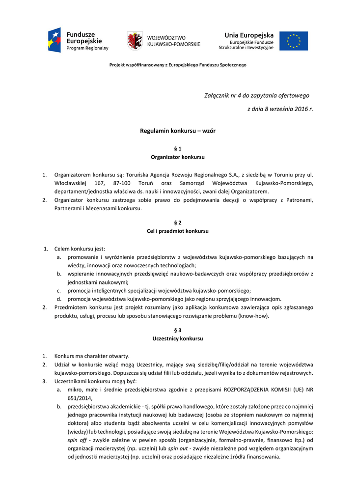 Załącznik nr 4 do zapytania ofertowego z dnia 8 września 2016 r. Regulamin konkursu – wzór §1 Organizator konkursu 1. 2. Organizatorem konkursu są: Toruńska Agencja Rozwoju Regionalnego S.A., z siedzibą w Toruniu przy ul. Włocławskiej 167, 87-100 Toruń oraz Samorząd Województwa Kujawsko-Pomorskiego, departament/jednostka właściwa ds. nauki i innowacyjności, zwani dalej Organizatorem. Organizator konkursu zastrzega sobie prawo do podejmowania decyzji o współpracy z Patronami, Partnerami i Mecenasami konkursu. §2 Cel i przedmiot konkursu 1. 2. Celem konkursu jest: a. promowanie i wyróżnienie przedsiębiorstw z województwa kujawsko-pomorskiego bazujących na wiedzy, innowacji oraz nowoczesnych technologiach; b. wspieranie innowacyjnych przedsięwzięć naukowo-badawczych oraz współpracy przedsiębiorców z jednostkami naukowymi; c. promocja inteligentnych specjalizacji województwa kujawsko-pomorskiego; d. promocja województwa kujawsko-pomorskiego jako regionu sprzyjającego innowacjom. Przedmiotem konkursu jest projekt rozumiany jako aplikacja konkursowa zawierająca opis zgłaszanego produktu, usługi, procesu lub sposobu stanowiącego rozwiązanie problemu (know-how). §3 Uczestnicy konkursu 1. 2. 3. Konkurs ma charakter otwarty. Udział w konkursie wziąć mogą Uczestnicy, mający swą siedzibę/filię/oddział na terenie województwa kujawsko-pomorskiego. Dopuszcza się udział filii lub oddziału, jeżeli wynika to z dokumentów rejestrowych. Uczestnikami konkursu mogą być: a. mikro, małe i średnie przedsiębiorstwa zgodnie z przepisami ROZPORZĄDZENIA KOMISJI (UE) NR 651/2014, b. przedsiębiorstwa akademickie - tj. spółki prawa handlowego, które zostały założone przez co najmniej jednego pracownika instytucji naukowej lub badawczej (osoba ze stopniem naukowym co najmniej doktora) albo studenta bądź absolwenta uczelni w celu komercjalizacji innowacyjnych pomysłów (wiedzy) lub technologii, posiadające swoją siedzibę na terenie Województwa Kujawsko-Pomorskiego: spin off - zwykle zależne w pewien sposób (organizacyjnie, formalno-prawnie, finansowo itp.) od organizacji macierzystej (np. uczelni) lub spin out - zwykle niezależne pod względem organizacyjnym od jednostki macierzystej (np. uczelni) oraz posiadające niezależne źródła finansowania. c. d. jednostki naukowe zgodnie z definicją zawartą w ustawie. o zasadach finansowania nauki (Dz. U. z 2010 Nr 96 poz. 615 z późn.zm.); zespół badawczy powołany do prowadzenia badań zgodnie z celami projektów badawczych jednostki naukowej, którym kieruje Lider spełniający wymogi ust. 2. §4 Ogólne warunki uczestnictwa w konkursie i nabór wniosków 1. 2. 3. Warunkiem zgłoszenia i przystąpienia do konkursu jest akceptacja przez Uczestnika treści niniejszego Regulaminu, czego potwierdzeniem jest wypełnienie zgłoszenia za pośrednictwem formularza elektronicznego w terminie określonym w ogłoszeniu konkursu. Formularz zgłoszeniowy uczestnicy konkursu wypełniają zgodnie z jego treścią. Zgłaszający odpowiada za prawdziwość danych wpisanych do formularza. Informacje dotyczące konkursu, regulamin oraz formularze zgłoszeniowe dostępne są na stronie internetowej: www.liderzy.tarr.org.pl oraz www.innowacje.kujawsko-pomorskie.pl. §5 Warunki uczestnictwa 1. 2. Zwycięzcy będą wyłonieni w dwóch kategoriach: a. Biznes: i. uczestnik może zgłosić do konkursu projekt nie obciążony prawami osób trzecich; ii. uczestnik nie może zgłaszać ponownie do konkursu projektu nagrodzonego lub wyróżnionego w poprzednich edycjach konkursu; iii. zgłoszony projekt musi być wdrożony w firmie, tj. spełniać wymóg minimum IX Poziomu Gotowości Technologii, zgodnie z Załącznikiem do Rozporządzenia Ministra Nauki i Szkolnictwa Wyższego z dnia 4 stycznia 2011r. w sprawie sposobu zarządzania przez Narodowe Centrum Badań i Rozwoju realizacją badań naukowych lub prac rozwojowych na rzecz obronności i bezpieczeństwa państwa (Dz.U. z 2011 Nr 18 poz. 91 z późn. zm.). b. Nauka: i. uczestnik może zgłosić do konkursu projekt nie obciążony prawami osób trzecich; ii. uczestnik nie może zgłaszać ponownie do konkursu projektu nagrodzonego lub wyróżnionego w poprzednich edycjach konkursu; iii. zgłoszony projekt musi być wdrożony w firmie, tj. spełniać wymóg minimum IV Poziomu Gotowości Technologii, zgodnie z Załącznikiem do Rozporządzenia Ministra Nauki i Szkolnictwa Wyższego z dnia 4 stycznia 2011r. w sprawie sposobu zarządzania przez Narodowe Centrum Badań i Rozwoju realizacją badań naukowych lub prac rozwojowych na rzecz obronności i bezpieczeństwa państwa (Dz.U. z 2011 Nr 18 poz. 91 z późn. zm.). Oceniane są projekty nie starsze niż dwa pełne lata kalendarzowe poprzedzające dzień ogłoszenia konkursu. §6 Kapituła Konkursowa 1. Kapituła Konkursowa powoływana jest przez Organizatora konkursu. Pracami Kapituły kieruje Przewodniczący, wybrany w drodze konsensusu spośród przedstawicieli Organizatora. Kapituła liczy od 5 do 10 Członków, wliczając Przewodniczącego oraz Sekretarza. 2. Zadaniem Kapituły Konkursowej jest ocena zgłoszonych projektów, wyłonienie laureatów konkursu oraz przyznanie nagród. 3. Dla Kategorii Biznes Kapituła Konkursowa składa się z: a. maksymalnie 2 przedstawicieli Samorządu Województwa Kujawsko-Pomorskiego, każdorazowo wskazanych przez organizację; b. maksymalnie 2 przedstawicieli Toruńskiej Agencji Rozwoju Regionalnego S.A., każdorazowo wskazanych przez organizację; c. przedstawiciela Urzędu Patentowego RP; d. przedstawiciela Polskiej Agencji Rozwoju Przedsiębiorczości; e. przedstawiciela Kujawsko-Pomorskiej Agencji Innowacji Sp. z o.o. f. maksymalnie 2 przedstawicieli instytucji zrzeszonych w Sejmiku Gospodarczym, każdorazowo wskazanych przez organizację. 4. Dla Kategorii Nauka Kapituła Konkursowa składa się z: a. maksymalnie 2 przedstawicieli Samorządu Województwa Kujawsko-Pomorskiego,