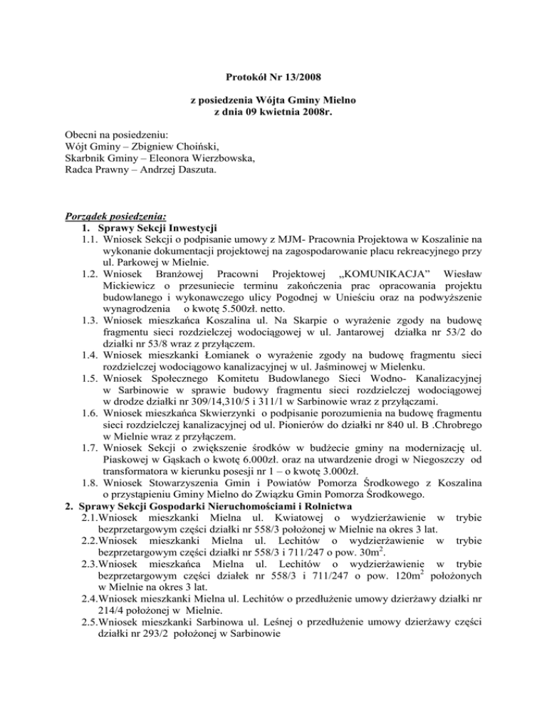 Protokół Nr 13/2008 z posiedzenia Wójta Gminy Mielno z dnia 09 kwietnia 2008r. Obecni na posiedzeniu: Wójt Gminy – Zbigniew Choiński, Skarbnik Gminy – Eleonora Wierzbowska, Radca Prawny – Andrzej Daszuta. Porządek posiedzenia: 1. Sprawy Sekcji Inwestycji 1.1. Wniosek Sekcji o podpisanie umowy z MJM- Pracownia Projektowa w Koszalinie na wykonanie dokumentacji projektowej na zagospodarowanie placu rekreacyjnego przy ul. Parkowej w Mielnie. 1.2. Wniosek BranŜowej Pracowni Projektowej „KOMUNIKACJA” Wiesław Mickiewicz o przesuniecie terminu zakończenia prac opracowania projektu budowlanego i wykonawczego ulicy Pogodnej w Unieściu oraz na podwyŜszenie wynagrodzenia o kwotę 5.500zł. netto. 1.3. Wniosek mieszkańca Koszalina ul. Na Skarpie o wyraŜenie zgody na budowę fragmentu sieci rozdzielczej wodociągowej w ul. Jantarowej działka nr 53/2 do działki nr 53/8 wraz z przyłączem. 1.4. Wniosek mieszkanki Łomianek o wyraŜenie zgody na budowę fragmentu sieci rozdzielczej wodociągowo kanalizacyjnej w ul. Jaśminowej w Mielenku. 1.5. Wniosek Społecznego Komitetu Budowlanego Sieci Wodno- Kanalizacyjnej w Sarbinowie w sprawie budowy fragmentu sieci rozdzielczej wodociągowej w drodze działki nr 309/14,310/5 i 311/1 w Sarbinowie wraz z przyłączami. 1.6. Wniosek mieszkańca Skwierzynki o podpisanie porozumienia na budowę fragmentu sieci rozdzielczej kanalizacyjnej od ul. Pionierów do działki nr 840 ul. B .Chrobrego w Mielnie wraz z przyłączem. 1.7. Wniosek Sekcji o zwiększenie środków w budŜecie gminy na modernizację ul. Piaskowej w Gąskach o kwotę 6.000zł. oraz na utwardzenie drogi w Niegoszczy od transformatora w kierunku posesji nr 1 – o kwotę 3.000zł. 1.8. Wniosek Stowarzyszenia Gmin i Powiatów Pomorza Środkowego z Koszalina o przystąpieniu Gminy Mielno do Związku Gmin Pomorza Środkowego. 2. Sprawy Sekcji Gospodarki Nieruchomościami i Rolnictwa 2.1.Wniosek mieszkanki Mielna ul. Kwiatowej o wydzierŜawienie w trybie bezprzetargowym części działki nr 558/3 połoŜonej w Mielnie na okres 3 lat. 2.2.Wniosek mieszkanki Mielna ul. Lechitów o wydzierŜawienie w trybie bezprzetargowym części działki nr 558/3 i 711/247 o pow. 30m2. 2.3.Wniosek mieszkańca Mielna ul. Lechitów o wydzierŜawienie w trybie bezprzetargowym części działek nr 558/3 i 711/247 o pow. 120m2 połoŜonych w Mielnie na okres 3 lat. 2.4.Wniosek mieszkanki Mielna ul. Lechitów o przedłuŜenie umowy dzierŜawy działki nr 214/4 połoŜonej w Mielnie. 2.5.Wniosek mieszkanki Sarbinowa ul. Leśnej o przedłuŜenie umowy dzierŜawy części działki nr 293/2 połoŜonej w Sarbinowie - 2 3. Sprawy Sekcji Rozwoju Gospodarczo Społecznego 3.1.Wniosek Sekcji o podpisanie aneksów do umów zawartych na przekazanie w uŜytkowanie defibrylatorów oraz sprzętu medycznego dla Niepublicznego Zakładu Opieki Zdrowotnej „MED-CARE” s.c. L. Kosiński, W. Kosiński. 3.2.Wniosek Sekcji o zmianę decyzji w sprawie przekazania autobusu szkolnego. 3.3.Wniosek Stowarzyszenia Promocji i Rozwoju Osady Nadmorskiej Chłopy „16-ty Południk” w Chłopach o zaakceptowanie zaktualizowanego kosztorysu wydatków i harmonogramu. 3.4.Wniosek trenerek piłki ręcznej ze Szkoły Podstawowej nr 18 w Koszalinie w sprawie pokrycia kosztów uŜytkowania hali sportowej w Mielnie podczas II Międzynarodowego Turnieju Piłki Ręcznej Chłopców o puchar Wójta Gminy Mielno organizowanego 23-25.05.2008r. 4. Sprawy Sekcji Zamówień Publicznych i Funduszy Europejskich 4.1.Wniosek Sekcji o podpisanie trzech umów na opracowanie studiów wykonalności pięciu inwestycji na terenie Gminy Mielno. 5. Sprawy Mieleńskiego Ośrodka Sportu i Rekreacji w Mielnie 5.1.Wniosek Dyrektora o zabezpieczenie w budŜecie dodatkowej kwoty na realizację projektu „PlaŜa” przez Telewizję TVN. 6. Polecenie wykonania uchwał Rady Gminy podjętych na sesji w dniu 31 marca 2008r. Ad.1 Sekcja Inwestycji 1.1.Wójt Gminy podpisał umowę z MJM- Pracownia Projektowa w Koszalinie na wykonanie dokumentacji projektowej na zagospodarowanie placu rekreacyjnego przy ul. Parkowej w Mielnie.(TT) 1.2.Wójt Gminy wyraził zgodę na podpisanie aneksu do umowy zawartej z BranŜową Pracownią Projektową „KOMUNIKACJA” Wiesław Mickiewicz na wykonanie projektu budowlanego i wykonawczego ulicy Pogodnej w Unieście, w którym przesuwa się termin zakończenia prac na 3 miesiące od daty otrzymania prawomocnej decyzji o ustaleniu lokalizacji inwestycji celu publicznego oraz na proponowany przez wnioskodawcę wzrost wynagrodzenia. (DG+EW)) 1.3.Wójt Gminy podpisał porozumienie z wnioskodawcą w sprawie budowy fragmentu sieci rozdzielczej wodociągowej w ul. Jantarowej – działka nr 53/2 do działki nr 53/8 wraz z przyłączem.(ZO) 1.4.Wójt Gminy podpisał z wnioskodawcą porozumienie w sprawie budowy fragmentu sieci rozdzielczej wodociągowo kanalizacyjnej w ul. Jaśminowej w Mielenku z działki nr 86/14 do działki nr 86/7.(ZO) 1.5.Wójt Gminy podpisał porozumienie z wnioskodawcą w sprawie budowy fragmentu sieci rozdzielczej wodociągowej w drodze działki nr 309/14,310/5 i 311/1 w Sarbinowie wraz z przyłączami.(ZO) 1.6.Wójt Gminy rozpatrzył wniosek negatywnie.(ZO) 1.7.Wójt Gminy wyraził zgodę na przesuniecie środków w budŜecie zgodnie z wnioskiem Sekcji. Polecił Skarbnikowi Gminy przygotować propozycje zmian w budŜecie.(TT+EW) 1.8.Wójt Gminy przyjął projekt uchwały w sprawie utworzenia Związku Gmin Pomorza Środkowego i skierował go do Biura Rady.(DG) - 3 Ad.2 Sekcja Gospodarki Nieruchomościami i Rolnictwa 2.1.Wójt Gminy wyraził zgodę na wydzierŜawienie w trybie bezprzetargowym części działki nr 558/3 połoŜonej w Mielnie na okres 3 lat z przeznaczeniem na tereny zielone, ustalając roczną stawkę czynszu dzierŜawnego w wysokości 300zł. plus VAT.(MG) 2.2.Wójt Gminy wyraził zgodę na wydzierŜawienie w trybie bezprzetargowym części działki nr 558/3 i 711/247 o pow. 30m2 połoŜonych w Mielnie na okres
