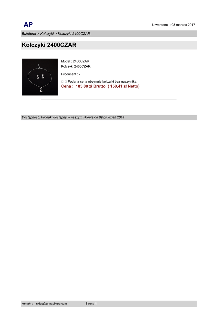 AP Utworzono : 08 marzec 2017 Biżuteria > Kolczyki > Kolczyki 2400CZAR Kolczyki 2400CZAR Model : 2400CZAR Kolczyki 2400CZAR Producent : ��Podana cena obejmuje kolczyki bez naszyjnika. Cena : 185,00 zł Brutto ( 150,41 zł Netto) Dostępność: Produkt dostępny w naszym sklepie od 09 grudzień 2014 kontakt : - [email protected] Strona 1