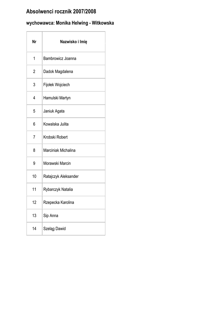 Absolwenci rocznik 2007/2008 wychowawca: Monika Helwing - Witkowska Nr Nazwisko i Imię 1 Bambrowicz Joanna 2 Dadok Magdalena 3 Fijołek Wojciech 4 Hamulski Martyn 5 Janiuk Agata 6 Kowalska Julita 7 Krobski Robert 8 Marciniak Michalina 9 Morawski Marcin 10 Ratajczyk Aleksander 11 Rybarczyk Natalia 12 Rzepecka Karolina 13 Sip Anna 14 Szeląg Dawid
