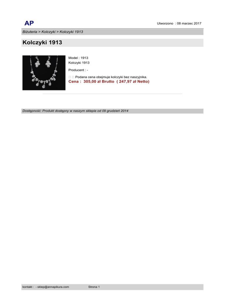 AP Utworzono : 08 marzec 2017 Biżuteria > Kolczyki > Kolczyki 1913 Kolczyki 1913 Model : 1913 Kolczyki 1913 Producent : ��Podana cena obejmuje kolczyki bez naszyjnika. Cena : 305,00 zł Brutto ( 247,97 zł Netto) Dostępność: Produkt dostępny w naszym sklepie od 09 grudzień 2014 kontakt : - [email protected] Strona 1
