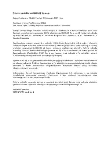 Nabycie udziałów spółki DLKF Sp. z o.o. Raport bieżący nr 62/2009 z dnia 26 listopada 2009 roku Podstawa prawna (wybierana w ESPI): Art. 56 ust. 1 pkt 2 Ustawy o ofercie - informacje bieżące i okresowe Zarząd Europejskiego Funduszu Hipotecznego S.A. informuje, iż w dniu 26 listopada 2009 roku Emitent zawarł umowę sprzedaży 100% udziałów spółki DLKF Sp. z o.o. Zbywającymi udziały są: FASBY BEARS, S.L., z siedzibą w La Coruña, Hiszpania oraz CAMPRñ PLHS, S.L., z siedzibą w La Coruña, Hiszpania. Przedmiotem zawartej umowy jest nabycie 121.000 (sto dwadzieścia jeden tysięcy) równych i niepodzielnych udziałów, o wartości nominalnej 50,00 zł (pięćdziesiąt złotych) każdy, o łącznej wartości nominalnej 6.050.000 zł (sześć milionów pięćdziesiąt złotych). Nabyte udziały stanowią 100% kapitału zakładowego spółki DLKF Sp. z o.o. i uprawniają do 100% głosów na Zgromadzeniu Wspólników DLKF Sp. z o.o. Łączna cena nabycia w/w udziałów wynosi 9.500.000 zł (dziewięć milionów pięćset tysięcy złotych). Spółka DLKF Sp. z o.o. prowadzi działalność polegającą na obsłudze i wynajmie nieruchomości na własny rachunek. Źródłem finansowania w/w udziałów w znaczącej części są środki własne Emitenta, a także finansowanie długoterminowe. Nabywane aktywa mają charakter długoterminowej inwestycji. Jednocześnie Zarząd Europejskiego Funduszu Hipotecznego S.A. informuje, iż nie istnieją jakiekolwiek powiązania pomiędzy Emitentem i jego osobami zarządzającymi oraz nadzorującymi a stroną zbywającą udziały. Nabyte udziały stanowią aktywa o znacznej wartości, gdyż łączna cena nabycia udziałów przekracza 10% kapitałów własnych Europejskiego Funduszu Hipotecznego S.A. Podstawa prawna: RMF GPW §5 ust.1 pkt 1