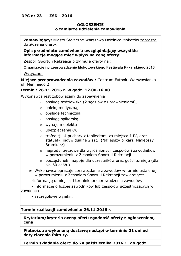 DPC nr 23 – ZSD - 2016 OGŁOSZENIE o zamiarze udzielenia zamówienia Zamawiający: Miasto Stołeczne Warszawa Dzielnica Mokotów zaprasza do złożenia oferty. Opis przedmiotu zamówienia uwzględniający wszystkie informacje mogące mieć wpływ na cenę oferty: Zespół Sportu i Rekreacji przyjmuje oferty na : Organizację i przeprowadzenie Mokotowskiego Festiwalu Piłkarskiego 2016 Wytyczne: Miejsce przeprowadzenia zawodów : Centrum Futbolu Warszawianka ul. Merliniego 2 Termin : 26.11.2016 r. w godz. 12.00-16.00 Wykonawca jest zobowiązany do zapewnienia : o obsługę sędziowską (2 sędziów z uprawnieniami), o opiekę medyczną, o obsługę techniczną, o obsługę spikerską o wynajem obiektu o ubezpieczenie OC o trofea tj. 4 puchary z tabliczkami za miejsca I-IV, oraz statuetki indywidualne 2 szt. (Najlepszy piłkarz, Najlepszy Bramkarz) o nagrody rzeczowe dla wyróżnionych zespołów i zawodników w porozumieniu z Zespołem Sportu i Rekreacji o poczęstunek i napoje dla uczestników oraz gości turnieju (dla ok. 60 osób.) • Wykonawca opracuje sprawozdanie z zawodów w formie ustalonej w porozumieniu z Zespołem Sportu i Rekreacji zawierające: -informację o miejscu i terminie przeprowadzenia zawodów, - informację o liczbie zawodników lub zespołów uczestniczących w zawodach - szczegółowe wyniki . Termin realizacji zamówienia: 26.11.2016 r. Kryterium/kryteria oceny ofert: zgodność oferty z ogłoszeniem, cena Płatność za wykonaną dostawę nastąpi w terminie 21 dni od daty złożenia faktury. Termin składania ofert: do 24 października 2016 r. do godz. 12.00 Oferty można składać: * drogą elektroniczną na adres - [email protected] * pisemnie na adres lub osobiście: Zespół Sportu i Rekreacji Dzielnica Mokotów m.st. Warszawy, ul. Wiśniowa 37, 02-545 Warszawa Pokój 209 Oferty złożone po terminie określonym w zapytaniu nie będą rozpatrywane przez Zamawiającego. Komórka organizacyjna Urzędu Dzielnicy Mokotów m.st. Warszawy realizująca wydatek: Zespół Sportu i Rekreacji. Osoba do kontaktu: Krzysztof Gampel tel: 22/ 56 51 689 Informacje dodatkowe: 1. Zamawiający będzie rozpatrywał oferty złożone zgodnie z zapytaniem. 2. Zamawiający udzieli zamówienia wykonawcy, którego oferta zostanie wybrana jako najkorzystniejsza. 3. Zamawiający zastrzega sobie prawo do zmiany zapytania bez podania przyczyn. 4. Zamawiający zastrzega sobie prawo odwołania zapytania w każdym czasie bez podawania przyczyn. 5. W sprawach nie ujętych w ogłoszeniu mają zastosowanie przepisy kodeksu cywilnego. Załączniki : 1. wzór umowy 2. wzór oferty Kierownik Zespołu Sportu i Rekreacji dla Dzielnicy Mokotów 17.10.2016 r. /-/ Lech Kwasiborski ................................................... data, podpis i pieczątka kierownika komórki organizacyjnej realizującej wydatek