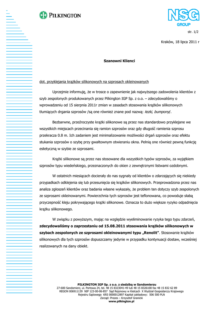 str. 1/2 Kraków, 18 lipca 2011 r Szanowni Klienci dot. przyklejania krążków silikonowych na szprosach okleinowanych Uprzejmie informuję, że w trosce o zapewnienie jak najwyższego zadowolenia klientów z szyb zespolonych produkowanych przez Pilkington IGP Sp. z o.o. – zdecydowaliśmy o wprowadzeniu od 15 sierpnia 2011r zmian w zasadach stosowania krążków silikonowych tłumiących drgania szprosów /są one również znane pod nazwą: łezki, bumpony/. Bezbarwne, przeźroczyste krążki silikonowe są przez nas standardowo przyklejane we wszystkich miejscach przecinania się ramion szprosów oraz gdy długość ramienia szprosu przekracza 0.8 m. Ich zadaniem jest minimalizowanie możliwości drgań szprosów oraz efektu stukania szprosów o szybę przy gwałtownym otwieraniu okna. Pełnią one również pewną funkcję estetyczną w szybie ze szprosami. Krążki silikonowe są przez nas stosowane dla wszystkich typów szprosów, za wyjątkiem szprosów typu wiedeńskiego, przeznaczonych do okien z zewnętrznymi listwami ozdobnymi. W ostatnich miesiącach docierały do nas sygnały od klientów o zdarzających się niekiedy przypadkach odklejenia się lub przesunięcia się krążków silikonowych. Przeprowadzona przez nas analiza zgłoszeń klientów oraz badania własne wykazały, że problem ten dotyczy szyb zespolonych ze szprosami okleinowanymi. Powierzchnia tych szprosów jest teflonowana, co powoduje słabą przyczepność kleju pokrywającego krążki silikonowe. Oznacza to dużo większe ryzyko odpadnięcia krążku silikonowego. W związku z powyższym, mając na względzie wyeliminowanie ryzyka tego typu zdarzeń, zdecydowaliśmy o zaprzestaniu od 15.08.2011 stosowania krążków silikonowych w szybach zespolonych ze szprosami okleinowanymi typu „Renolit”. Stosowanie krążków silikonowych dla tych szprosów dopuszczamy jedynie w przypadku kontynuacji dostaw, wcześniej realizowanych na dany obiekt. PILKINGTON IGP Sp. z o.o. z siedzibą w Sandomierzu 27-600 Sandomierz, ul. Portowa 24, tel. 48 15 8323041-49 lub 48 15 8326100 fax 48 15 832 62 89 REGON 006911139 NIP 123-00-06-857 Sąd Rejonowy w Kielcach X Wydział Gospodarczy Krajowego Rejestru Sądowego KRS 0000012897 Kapitał zakładowy: 506 500 PLN Zarząd: Prezes – Krzysztof Granicki www.pilkington.pl str. 2/2 Prosimy o informowanie o tej zmianie wszystkich nowych klientów, decydujących się na szyby z tego typu szprosami. Zwracamy uwagę, że oprócz nieco innego wyglądu szyb /brak krążków silikonowych w miejscach krzyżowania się szprosu/, konsekwencją tej zmiany będzie zwiększona w niektórych przypadkach możliwość ewentualnych drgań szprosów lub stukania szprosu o szybę. Sytuacje te mogą mieć miejsce przede wszystkim w przypadku okien rozwiernych lub uchylnych; w momencie wykonywania ruchów skrzydłem okiennym lub drzwiowym. Może to być również zauważalne w budynkach, które są narażone na drgania od przejeżdżających w pobliżu tramwajów lub pociągów. z poważaniem: Krzysztof Skarbiński Quality Manager Pilkington IGP Sp. z o.o. tel.: 12 627 90 00 GSM: +48 601 506 051 e-mail: [email protected] PILKINGTON IGP Sp. z o.o. z siedzibą w Sandomierzu 27-600 Sandomierz, ul. Portowa 24, tel. 48 15 8323041-49 lub 48 15 8326100 fax 48 15 832 62 89 REGON 006911139 NIP 123-00-06-857 Sąd Rejonowy w Kielcach X Wydział Gospodarczy Krajowego Rejestru Sądowego KRS 0000012897 Kapitał zakładowy: 506 500 PLN Zarząd: Prezes – Krzysztof Granicki www.pilkington.pl
