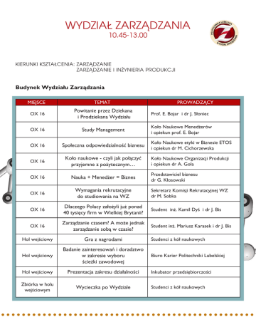 WYDZIAŁ ZARZĄDZANIA 10.45-13.00 KIERUNKI KSZTAŁCENIA: ZARZĄDZANIE ZARZĄDZANIE I INŻYNIERIA PRODUKCJI Budynek Wydziału Zarządzania MIEJSCE TEMAT PROWADZĄCY OX 16 Powitanie przez Dziekana i Prodziekana Wydziału Prof. E. Bojar i dr J. Słoniec OX 16 Study Management Koło Naukowe Menedżerów i opiekun prof. E. Bojar OX 16 Społeczna odpowiedzialność biznesu Koło Naukowe etyki w Biznesie ETOS i opiekun dr M. Cichorzewska OX 16 Koło naukowe - czyli jak połączyć przyjemne z pożytecznym… Koło Naukowe Organizacji Produkcji i opiekun dr A. Gola OX 16 Nauka + Menedżer = Biznes OX 16 Wymagania rekrutacyjne do studiowania na WZ OX 16 Dlaczego Polacy założyli już ponad 40 tysięcy firm w Wielkiej Brytanii? Student inż. Kamil Dyś i dr J. Bis OX 16 Zarządzanie czasem? A może jednak zarządzanie sobą w czasie? Student inż. Mariusz Karasek i dr J. Bis Hol wejściowy Gra z nagrodami Hol wejściowy Badanie zainteresowań i doradztwo w zakresie wyboru ścieżki zawodowej Hol wejściowy Prezentacja zakresu działalności Zbiórka w holu wejściowym Wycieczka po Wydziale Przedstawiciel biznesu dr G. Kłosowski Sekretarz Komisji Rekrutacyjnej WZ dr M. Sobka Studenci z kół naukowych Biuro Karier Politechniki Lubelskiej Inkubator przedsiębiorczości Studenci z kół naukowych
