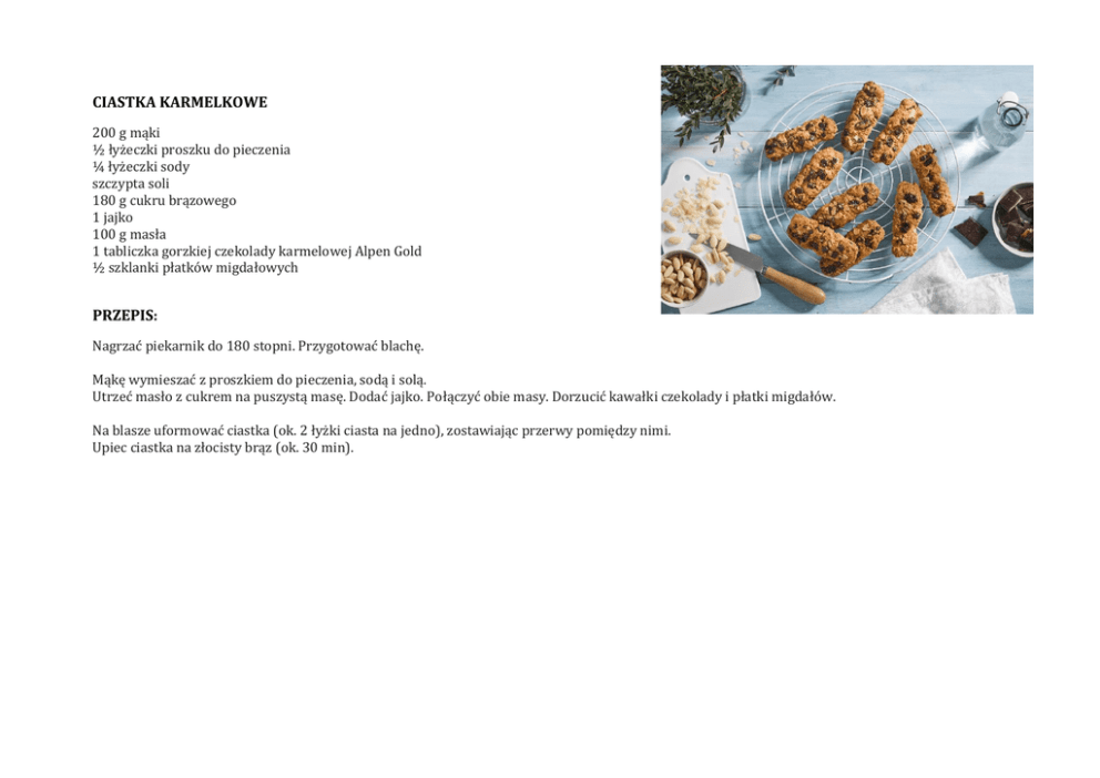 CIASTKA KARMELKOWE 200 g mąki ½ łyżeczki proszku do pieczenia ¼ łyżeczki sody szczypta soli 180 g cukru brązowego 1 jajko 100 g masła 1 tabliczka gorzkiej czekolady karmelowej Alpen Gold ½ szklanki płatków migdałowych PRZEPIS: Nagrzać piekarnik do 180 stopni. Przygotować blachę. Mąkę wymieszać z proszkiem do pieczenia, sodą i solą. Utrzeć masło z cukrem na puszystą masę. Dodać jajko. Połączyć obie masy. Dorzucić kawałki czekolady i płatki migdałów. Na blasze uformować ciastka (ok. 2 łyżki ciasta na jedno), zostawiając przerwy pomiędzy nimi. Upiec ciastka na złocisty brąz (ok. 30 min).