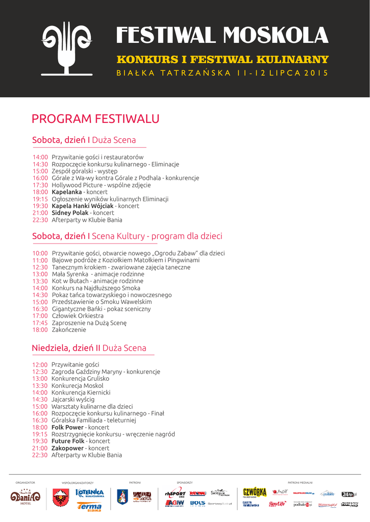 FESTIWAL MOSKOLA KONKURS I FESTIWAL KULINARNY B I A Ł K A TAT R Z A Ń S K A 1 1 - 1 2 L I P C A 2 0 1 5 PROGRAM FESTIWALU Sobota, dzień I Duża Scena 14:00 14:30 15:00 16:00 17:30 18:00 19:15 19:30 21:00 22:30 Przywitanie gości i restauratorów Rozpoczęcie konkursu kulinarnego - Eliminacje Zespół góralski - występ Górale z Wa-wy kontra Górale z Podhala - konkurencje Hollywood Picture - wspólne zdjęcie Kapelanka - koncert Ogłoszenie wyników kulinarnych Eliminacji Kapela Hanki Wójciak - koncert Sidney Polak - koncert Afterparty w Klubie Bania Sobota, dzień I Scena Kultury - program dla dzieci 10:00 11:00 12:30 13:00 13:30 14:00 14:30 15:00 16:30 17:00 17:45 18:00 Przywitanie gości, otwarcie nowego „Ogrodu Zabaw” dla dzieci Bajowe podróże z Koziołkiem Matołkiem i Pingwinami Tanecznym krokiem - zwariowane zajęcia taneczne Mała Syrenka - animacje rodzinne Kot w Butach - animacje rodzinne Konkurs na Najdłuższego Smoka Pokaz tańca towarzyskiego i nowoczesnego Przedstawienie o Smoku Wawelskim Gigantyczne Bańki - pokaz sceniczny Człowiek Orkiestra Zaproszenie na Dużą Scenę Zakończenie Niedziela, dzień II Duża Scena 12:00 12:30 13:00 13:30 14:00 14:30 15:00 16:00 16:30 18:00 19:15 19:30 21:00 22:30 ORGANIZATOR Przywitanie gości Zagroda Gaździny Maryny - konkurencje Konkurencja Grulisko Konkurecja Moskol Konkurencja Kiernicki Jajcarski wyścig Warsztaty kulinarne dla dzieci Rozpoczęcie konkursu kulinarnego - Finał Góralska Familiada - teleturniej Folk Power - koncert Rozstrzygnięcie konkursu - wręczenie nagród Future Folk - koncert Zakopower - koncert Afterparty w Klubie Bania WSPÓŁORGANIZATORZY PATRONI SPONSORZY PATRONI MEDIALNI