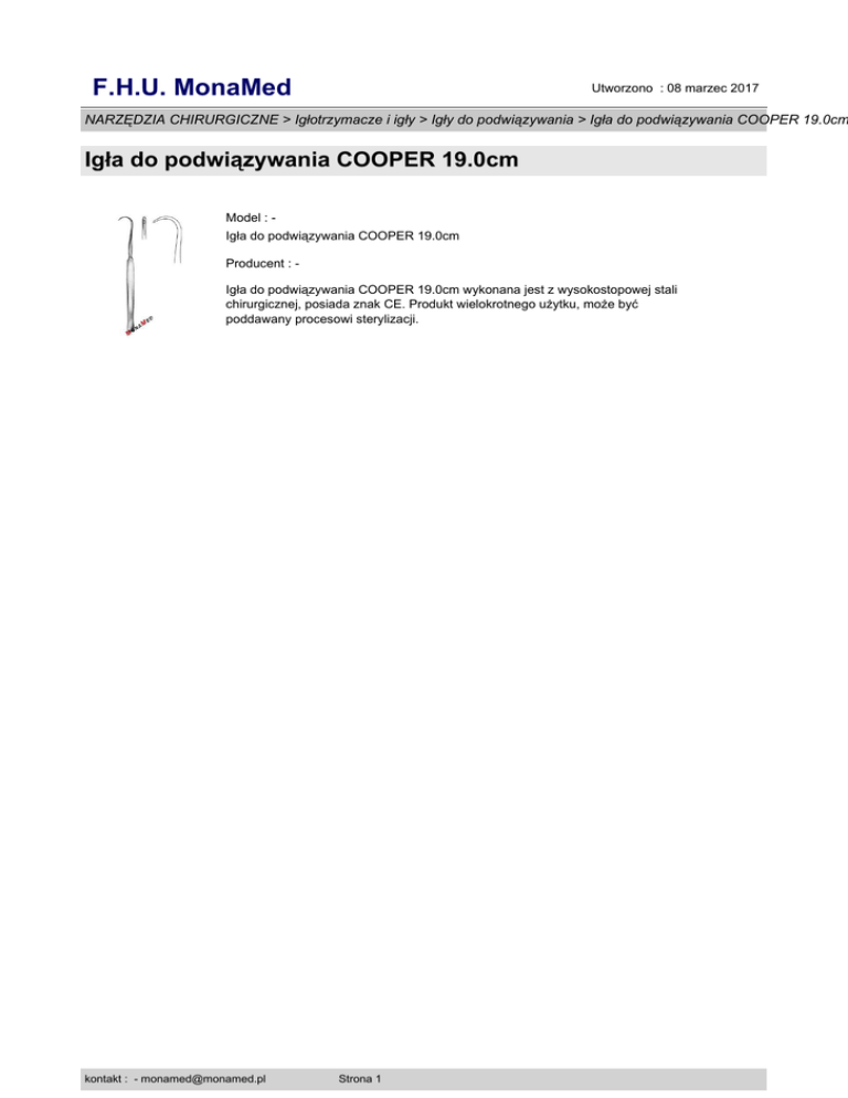 F.H.U. MonaMed Utworzono : 08 marzec 2017 NARZĘDZIA CHIRURGICZNE > Igłotrzymacze i igły > Igły do podwiązywania > Igła do podwiązywania COOPER 19.0cm Igła do podwiązywania COOPER 19.0cm Model : Igła do podwiązywania COOPER 19.0cm Producent : Igła do podwiązywania COOPER 19.0cm wykonana jest z wysokostopowej stali chirurgicznej, posiada znak CE. Produkt wielokrotnego użytku, może być poddawany procesowi sterylizacji. kontakt : - [email protected] Strona 1 F.H.U. MonaMed Utworzono : 08 marzec 2017 NARZĘDZIA CHIRURGICZNE > Igłotrzymacze i igły > Igły do podwiązywania > Igła do podwiązywania COOPER 19.0cm Igła do podwiązywania COOPER 19.0cm kontakt : - [email protected] Strona 2 F.H.U. MonaMed Utworzono : 08 marzec 2017 NARZĘDZIA CHIRURGICZNE > Igłotrzymacze i igły > Igły do podwiązywania > Igła do podwiązywania COOPER 19.0cm Igła do podwiązywania COOPER 19.0cm DefSemiHidden="true" DefQFormat="false" DefPriority="99" LatentStyleCount="267"> UnhideWhenUsed="false" QFormat="true" Name="Normal" /> UnhideWhenUsed="false" QFormat="true" Name="heading 1" /> UnhideWhenUsed="false" QFormat="true" Name="Title" /> UnhideWhenUsed="false" QFormat="true" Name="Subtitle" /> UnhideWhenUsed="false" QFormat="true" Name="Strong" /> UnhideWhenUsed="false" QFormat="true" Name="Emphasis" /> UnhideWhenUsed="false" Name="Table Grid" /> UnhideWhenUsed="false" QFormat="true" Name="No Spacing" /> UnhideWhenUsed="false" Name="Light Shading" /> UnhideWhenUsed="false" Name="Light List" /> UnhideWhenUsed="false" Name="Light Grid" /> UnhideWhenUsed="false" Name="Medium Shading 1" /> UnhideWhenUsed="false" Name="Medium Shading 2" /> UnhideWhenUsed="false" Name="Medium List 1" /> UnhideWhenUsed="false" Name="Medium List 2" /> UnhideWhenUsed="false" Name="Medium Grid 1" /> kontakt : - [email protected] Strona 3 F.H.U. MonaMed Utworzono : 08 marzec 2017 NARZĘDZIA CHIRURGICZNE > Igłotrzymacze i igły > Igły do podwiązywania > Igła do podwiązywania COOPER 19.0cm Igła do podwiązywania COOPER 19.0cm UnhideWhenUsed="false" Name="Medium Grid 2" /> UnhideWhenUsed="false" Name="Medium Grid 3" /> UnhideWhenUsed="false" Name="Dark List" /> UnhideWhenUsed="false" Name="Colorful Shading" /> UnhideWhenUsed="false" Name="Colorful List" /> UnhideWhenUsed="false" Name="Colorful Grid" /> UnhideWhenUsed="false" Name="Light Shading Accent 1" /> UnhideWhenUsed="false" Name="Light List Accent 1" /> UnhideWhenUsed="false" Name="Light Grid Accent 1" /> UnhideWhenUsed="false" Name="Medium Shading 1 Accent 1" /> UnhideWhenUsed="false" Name="Medium Shading 2 Accent 1" /> UnhideWhenUsed="false" Name="Medium List 1 Accent 1" /> UnhideWhenUsed="false" QFormat="true" Name="List Paragraph" /> UnhideWhenUsed="false" QFormat="true" Name="Quote" /> UnhideWhenUsed="false" QFormat="true" Name="Intense Quote" /> UnhideWhenUsed="false" Name="Medium List 2 Accent 1" /> UnhideWhenUsed="false" Name="Medium Grid 1 Accent 1" /> UnhideWhenUsed="false" Name="Medium Grid 2 Accent 1" /> UnhideWhenUsed="false" Name="Medium Grid 3 Accent 1" /> UnhideWhenUsed="false" Name="Dark List Accent 1" /> UnhideWhenUsed="false" Name="Colorful Shading Accent 1" /> UnhideWhenUsed="false" Name="Colorful List Accent 1" /> UnhideWhenUsed="false" Name="Colorful Grid Accent 1" /> UnhideWhenUsed="false" Name="Light Shading Accent 2" /> UnhideWhenUsed="false" Name="Light List Accent 2" /> UnhideWhenUsed="false" Name="Light Grid Accent 2" /> UnhideWhenUsed="false" Name="Medium Shading 1 Accent 2" /> kontakt : - [email protected] Strona 4 F.H.U. MonaMed Utworzono : 08 marzec 2017 NARZĘDZIA CHIRURGICZNE > Igłotrzymacze i igły > Igły do podwiązywania > Igła do podwiązywania COOPER 19.0cm Igła do podwiązywania COOPER 19.0cm UnhideWhenUsed="false" Name="Medium Shading 2 Accent 2" /> UnhideWhenUsed="false" Name="Medium List 1 Accent 2" /> UnhideWhenUsed="false" Name="Medium List 2 Accent 2" /> UnhideWhenUsed="false" Name="Medium Grid 1 Accent 2" /> UnhideWhenUsed="false" Name="Medium Grid 2 Accent 2" /> UnhideWhenUsed="false" Name="Medium Grid 3 Accent 2" /> UnhideWhenUsed="false" Name="Dark List Accent 2" /> UnhideWhenUsed="false" Name="Colorful Shading Accent 2" /> UnhideWhenUsed="false" Name="Colorful List Accent 2" /> UnhideWhenUsed="false" Name="Colorful Grid Accent 2" /> UnhideWhenUsed="false" Name="Light Shading Accent 3" /> UnhideWhenUsed="false" Name="Light List Accent 3" /> UnhideWhenUsed="false" Name="Light Grid Accent 3" /> UnhideWhenUsed="false" Name="Medium Shading 1 Accent 3" /> UnhideWhenUsed="false" Name="Medium Shading 2 Accent 3" /> UnhideWhenUsed="false" Name="Medium List 1 Accent 3" /> UnhideWhenUsed="false" Name="Medium List 2 Accent 3" /> UnhideWhenUsed="false" Name="Medium Grid 1 Accent 3" /> UnhideWhenUsed="false" Name="Medium Grid 2 Accent 3" /> UnhideWhenUsed="false" Name="Medium Grid 3 Accent 3" /> UnhideWhenUsed="false" Name="Dark List Accent 3" /> UnhideWhenUsed="false" Name="Colorful Shading Accent 3" /> UnhideWhenUsed="false" Name="Colorful List Accent 3" /> UnhideWhenUsed="false" Name="Colorful Grid Accent 3" /> UnhideWhenUsed="false" Name="Light Shading Accent 4" /> UnhideWhenUsed="false" Name="Light List Accent 4" /> UnhideWhenUsed="false" Name="Light Grid Accent 4" /> kontakt : - [email protected] Strona 5 F.H.U. MonaMed Utworzono : 08 marzec 2017 NARZĘDZIA CHIRURGICZNE > Igłotrzymacze i igły > Igły do podwiązywania > Igła do podwiązywania COOPER 19.0cm Igła do podwiązywania COOPER 19.0cm UnhideWhenUsed="false" Name="Medium Shading 1 Accent 4" /> UnhideWhenUsed="false" Name="Medium Shading 2 Accent 4" /> UnhideWhenUsed="false" Name="Medium List 1 Accent 4" /> UnhideWhenUsed="false" Name="Medium List 2 Accent 4" /> UnhideWhenUsed="false" Name="Medium Grid 1 Accent 4" /> UnhideWhenUsed="false" Name="Medium Grid 2 Accent 4" /> UnhideWhenUsed="false" Name="Medium Grid 3 Accent 4" /> UnhideWhenUsed="false" Name="Dark List Accent 4" /> UnhideWhenUsed="false" Name="Colorful Shading Accent 4" /> UnhideWhenUsed="fa