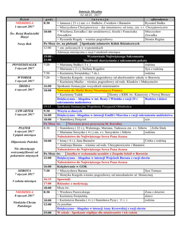 Dzień NIEDZIELA 1 styczeń 2017 Św. Bożej Rodzicielki Maryi Nowy Rok PONIEDZIAŁEK 2 styczeń 2017 WTOREK 3 styczeń 2017 ŚRODA 4 styczeń 2017 CZWARTEK 5 styczeń 2017 PIĄTEK 6 styczeń 2017 I piątek miesiąca Objawienie Pańskie Nie obowiązuje wstrzemięźliwość od pokarmów mięsnych SOBOTA 7 styczeń 2017 I sobota miesiąca NIEDZIELA 8 styczeń 2017 Niedziela Chrztu Pańskiego Intencje Mszalne 01-08.01. 2017 godz intencja ofiarodawca + Janusza ( 21 r.) zm. z r. Stułków, Ćwieków i Baranów Ryszard Stułka 8:30 + Mieczysława Chrzyptowicza – dar imieninowy od żony, zm. z r. Chrzyptowiczów + Wiesławę Zawadka ( dar urodzinowy), Józefa i Franciszka Mieczysław 10:00 Zawadków Zawadka + Ryszarda Rogalę – wieniec pogrzebowy Siostra Regina Po Mszy św. na plebanii Spotkanie zelatorów Kółek Różańcowych 12:00 + zm. polecanych w wypominkach Adoracja miesięczna z racji I niedzieli miesiąca. 19:00 Wystawienie Najświętszego Sakramentu 21:00 Możliwość skorzystania z sakramentu pokuty 7:20 + Mariannę Stułka ( 3 r. ) rodzina + Marianne ( 2 r.), Stefana Rogalów Syn z rodziną 7:50 + Kazimierę Świętulską ( 7 dz.) rodzina 7:20 + Henryka Kargola - wieniec pogrzebowy od absolwentów szkoły w Borowiu + Kazimierę Mućko – wieniec pogrzebowy od rodz. Klusków i Maksymców Spotkanie formacyjne wszystkich ministrantów 16:00 18:00 Nowenna do Matki Bożej Nieustającej Pomocy + Kazimierę Tudek Siostry z KRK św. Katarzyny z Nowej Brzuzy Dziękczynno – błagalna w int. Beaty i Witolda z racji 25 r Rodzice i dzieci sakramentu małżeństwa 19:15 Spotkanie formacyjne Wspólnoty Przyjaciół Oblubieńca 9:30 Wizyta u chorych 16:00 Dziękczynno –błagalna w intencji Emilii i Marcina z racji sakramentu małżeństwa + Stanisławę Dzięcioł syn 18:00 Po Mszy św. Nowenna przez przyczynę bł. Karoliny 8:30 + Stanisławę ( 22 r.), Walentego, Mariana, Tadeusza zm. z r. Sitków Zofia Sitek + Marianne Serzysko ( 4 r.) zm. z r. Serzysków i Sitków rodzina Nabożeństwo do Najświętszego Serca Pana Jezusa + Irenę ( 4 r.), Jana Baranów Córka z rodziną 10:00 + Andrzeja Barana – wieniec od rodz. Chrzyptowiczów i Baranów Nabożeństwo do Najświętszego Serca Pana Jezusa Po Mszy św. Jasełka w wykonaniu uczniów z Zespołu Szkół w Borowiu 12:00 Dziękczynno – błagalna w intencji Wojciech Barana z racji chrztu Nabożeństwo do Najświętszego Serca Pana Jezusa 16:00 Kolędowanie w GOK + Mieczysława Barana Syn Tomasz 7:20 + Henryka Kargola wieniec pogrzebowy od mieszkańców ul. Słonecznej 16:15 Spowiedź 17:00 Różaniec z medytacją Msza św. 18:00 + Wiesława Paziewskiego Żona z dziećmi 8:30 + Kazimierę Świętulską dzieci + Kazimierza Baranka ( 4 r.) i Stanisława Pyzę ( 11 r. ) rodzina 10:00 Za parafian 12:00 Dziękczynno – błagalna w intencji Anny Krzewskiej z racji chrztu W szkole - Spotkanie wigilijne dla ministrantów i ich rodzin 15:00