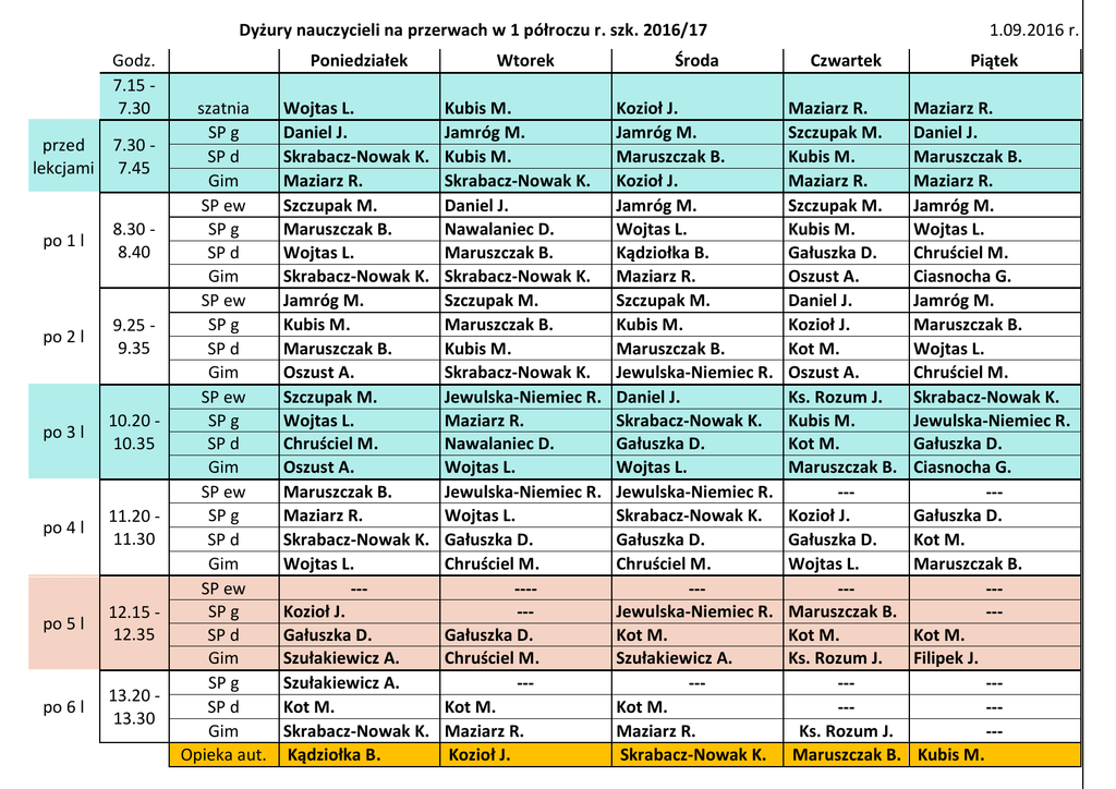 Dyżury nauczycieli na przerwach w 1 półroczu r. szk. 2016/17 1.09