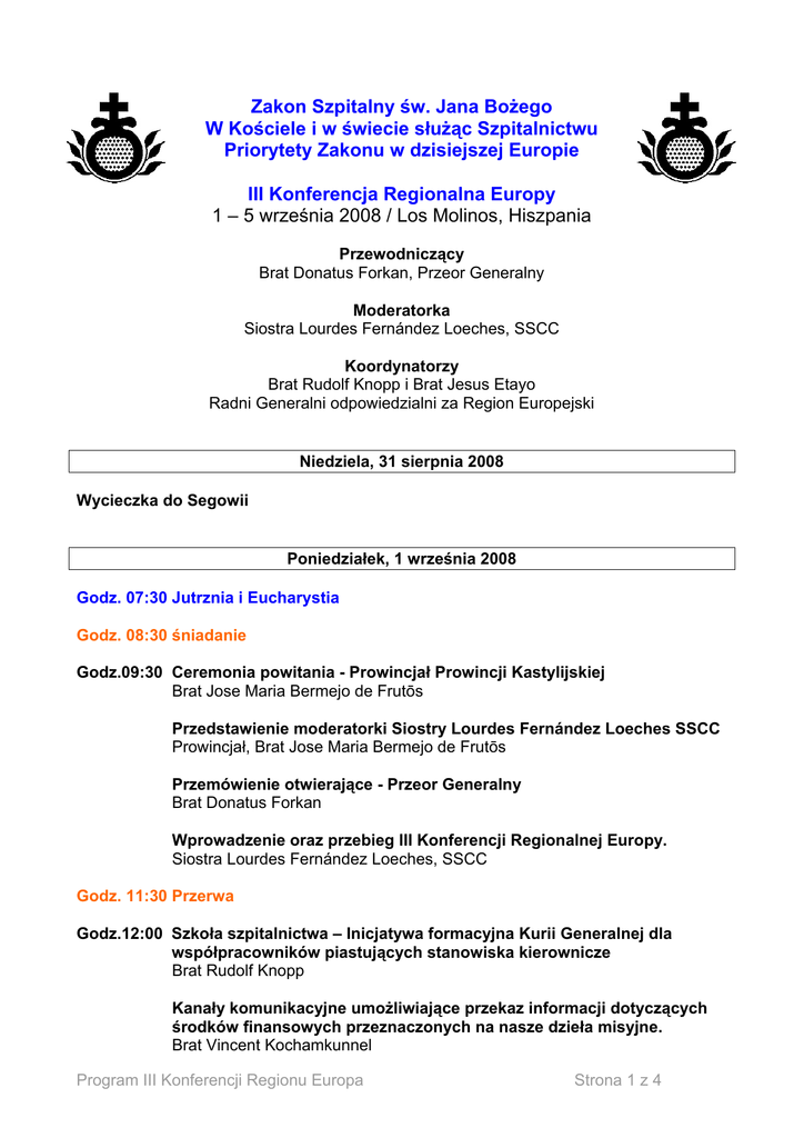 Zakon Szpitalny św. Jana Bożego W Kościele i w świecie służąc Szpitalnictwu Priorytety Zakonu w dzisiejszej Europie III Konferencja Regionalna Europy 1 – 5 września 2008 / Los Molinos, Hiszpania Przewodniczący Brat Donatus Forkan, Przeor Generalny Moderatorka Siostra Lourdes Fernández Loeches, SSCC Koordynatorzy Brat Rudolf Knopp i Brat Jesus Etayo Radni Generalni odpowiedzialni za Region Europejski Niedziela, 31 sierpnia 2008 Wycieczka do Segowii Poniedziałek, 1 września 2008 Godz. 07:30 Jutrznia i Eucharystia Godz. 08:30 śniadanie Godz.09:30 Ceremonia powitania - Prowincjał Prowincji Kastylijskiej Brat Jose Maria Bermejo de Frutōs Przedstawienie moderatorki Siostry Lourdes Fernández Loeches SSCC Prowincjał, Brat Jose Maria Bermejo de Frutōs Przemówienie otwierające - Przeor Generalny Brat Donatus Forkan Wprowadzenie oraz przebieg III Konferencji Regionalnej Europy. Siostra Lourdes Fernández Loeches, SSCC Godz. 11:30 Przerwa Godz.12:00 Szkoła szpitalnictwa – Inicjatywa formacyjna Kurii Generalnej dla współpracowników piastujących stanowiska kierownicze Brat Rudolf Knopp Kanały komunikacyjne umożliwiające przekaz informacji dotyczących środków finansowych przeznaczonych na nasze dzieła misyjne. Brat Vincent Kochamkunnel Program III Konferencji Regionu Europa Strona 1 z 4 Godz. 13:30 Obiad Godz. 16:00 Budowanie przyszłości poprzez proces odnowy Ojciec Alejandro Fernández Barrajòn OdeM Przewodniczący Konferencji ds. Zakonnych w Hiszpanii Godz. 17:30 Przerwa 18:00 h Praca w grupach Sesja plenarna Godz. 19:30 Nieszpory Godz. 20:00 Kolacja Wtorek, 2 września 2008 Godz. 07:30 Jutrznia i Eucharystia Godz. 08:30 Śniadanie Godz.09:30 Rola Współbrata i Współpracownika w przyszłości Brat Marco Fabello, Prowincja Lombardzko-Venecka Pan Karl Fries, Prowincja Bawarska Brat Eduardo Ribes Argente, Prowincja Aragońska Pani Carol Marley, Prowincja Angielska Godz. 11:30 Przerwa Godz. 12:00 Praca w grupach Sesja plenarna Pani Rita Monteverdi, Prowincja Lombardzko-Venecka Godz. 13:30 Obiad Godz. 16:00 Ukształtowanie duszpasterstwa w ośrodkach Zakonu Brat Jesus Etayo Godz. 17:30 Przerwa Godz. 18:00 Praca w grupach Sesja plenarna Godz.19:30 Nieszpory Godz.20:00 Kolacja Program III Konferencji Regionu Europa Strona 2 z 4 Środa, 3 września 2008 Godz. 07:30 Jutrznia i Eucharystia Godz. 08:30 Śniadanie Godz. 09:30 Pierwszy projekt Statutów Generalnych Brat Jesus Etayo Godz. 11:30 Przerwa Godz. 12:00 Praca w Grupach Sesja Plenarna Godz. 13:30 Obiad Godz.16:00 Zwiedzanie Madrytu Spotkanie z lokalnymi organami władzy Tradycyjna kolacja madrycka Czwartek, 4 września 2008 Godz. 07:30 Jutrznia i Eucharystia Godz. 08:30 Śniadanie Godz. 09:30 Wymogi bioetyki i sytuacje konfliktowe Doktor Juan Luis Trueba, Neurolog, Master z Bioetyki Przewodniczący Stowarzyszenia Bioetyki Podstawowej i Klinicznej w Hiszpanii Kodeks etyczny Prowincji Austryjackiej – pomoc w codzienności? Doktor Reinhard Pichler, Prowincja Austryjacka Kwestie etyczne dotyczące opieki nad osobami niepełnosprawnymi Dyrektor Anna Plunkett, Prowincja Irlandzka Godz. 11:30 Przerwa Godz. 12:00 Praca w grupach Sesja plenarna Program III Konferencji Regionu Europa Strona 3 z 4 Godz. 13:30 Obiad Godz. 16:00 Tworzenie biura dla Zakonu w Brukseli: możliwość czy nadmierne oczekiwania – doświadczenia praktyczne Ojciec Meinolf von Spee SDB Dyrektor Europejskiego Biura Salezjanów w Brukseli Współpraca w zakresie badań w Europie Profesor Paolo Rossini, Dyrektor Naukowy AFaR Godz. 17:30 Przerwa Godz. 18:00 Praca w grupach Sesja plenarna Godz. 19:30 Nieszpory Godz. 20:00 Kolacja Piątek, 5 września 2008 Godz. 07:30 Jutrznia Godz. 08:30 Śniadanie Godz. 09:30 Dokument końcowy: Priorytety Zakonu w dzisiejszej Europie Brat Rudolf Knopp e Brat Jesus Etayo Godz. 11:30 Przerwa Godz. 12:00 Wolne wnioski Godz. 13:30 Obiad 16:00 h Końcowe przemówienie Przeora Generalnego Brat Donatus Forkan Godz. 17:30 Przerwa Godz. 18:00 Eucharystia na zakończenie Godz. 20:00 Kolacja Sobota, 6 września 2008 Możliwość zwiedzenia ośrodków Zakonu w Madrycie i w okolicy. Program III Konferencji Regionu Europa Strona 4 z 4
