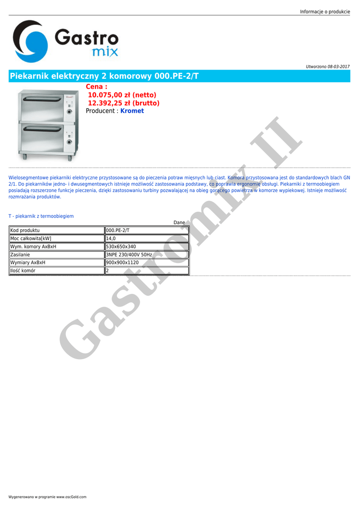 Informacje o produkcie Utworzono 08-03-2017 Piekarnik elektryczny 2 komorowy 000.PE-2/T Cena : 10.075,00 zł (netto) 12.392,25 zł (brutto) II Producent : Kromet T - piekarnik z termoobiegiem m ix Wielosegmentowe piekarniki elektryczne przystosowane są do pieczenia potraw mięsnych lub ciast. Komora przystosowana jest do standardowych blach GN 2/1. Do piekarników jedno- i dwusegmentowych istnieje możliwość zastosowania podstawy, co poprawia ergonomię obsługi. Piekarniki z termoobiegiem posiadają rozszerzone funkcje pieczenia, dzięki zastosowaniu turbiny pozwalającej na obieg gorącego powietrza w komorze wypiekowej. Istnieje możliwość rozmrażania produktów. Dane 000.PE-2/T Moc całkowita[kW] 14,0 Wym. komory AxBxH 530x650x340 tr o Kod produktu Zasilanie 3NPE 230/400V 50Hz Wymiary AxBxH 900x900x1120 2 G as Ilość komór Wygenerowano w programie www.oscGold.com