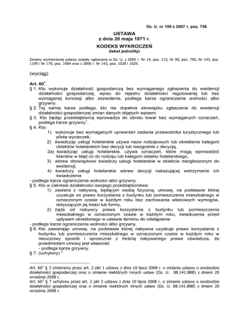 Dz. U. nr 109 z 2007 r. poz. 756 USTAWA z dnia 20 maja 1971 r. KODEKS WYKROCZEŃ (tekst jednolity) Zmiany wymienionej ustawy zostały ogłoszone w Dz. U. z 2005 r. Nr 14, poz. 113, Nr 90, poz. 756, Nr 143, poz. 1199 i Nr 179, poz. 1484 oraz z 2006 r. Nr 143, poz. 1028 i 1029. (wyciąg) Art. 601. § 1. Kto wykonuje działalność gospodarczą bez wymaganego zgłoszenia do ewidencji działalności gospodarczej, wpisu do rejestru działalności regulowanej lub bez wymaganej koncesji albo zezwolenia, podlega karze ograniczenia wolności albo grzywny. § 2. Tej samej karze podlega, kto nie dopełnia obowiązku zgłaszania do ewidencji działalności gospodarczej zmian danych objętych wpisem. § 3. Kto będąc przedsiębiorcą wprowadza do obrotu towar bez wymaganych oznaczeń, podlega karze grzywny1. § 4. Kto: 1) wykonuje bez wymaganych uprawnień zadania przewodnika turystycznego lub pilota wycieczek, 2) świadcząc usługi hotelarskie używa nazw rodzajowych lub określenia kategorii obiektów hotelarskich bez decyzji lub niezgodnie z decyzją, 2a) świadcząc usługi hotelarskie, używa oznaczeń, które mogą wprowadzić klientów w błąd co do rodzaju lub kategorii obiektu hotelarskiego, 3) wbrew obowiązkowi świadczy usługi hotelarskie w obiekcie niezgłoszonym do ewidencji, 4) świadczy usługi hotelarskie wbrew decyzji nakazującej wstrzymanie ich świadczenia - podlega karze ograniczenia wolności albo grzywny. § 5. Kto w zakresie działalności swojego przedsiębiorstwa: 1) zawiera z nabywcą, będącym osobą fizyczną, umowę, na podstawie której uzyskuje on prawo korzystania z budynku lub pomieszczenia mieszkalnego w oznaczonym czasie w każdym roku bez zachowania właściwych wymogów, dotyczących jej treści lub formy, 2) żąda od nabywcy prawa korzystania z budynku lub pomieszczenia mieszkalnego w oznaczonym czasie w każdym roku, świadczenia przed upływem określonego w ustawie terminu do odstąpienia - podlega karze ograniczenia wolności albo grzywny. § 6. Kto zawierając umowę, na podstawie której nabywca uzyskuje prawo korzystania z budynku lub pomieszczenia mieszkalnego w oznaczonym czasie w każdym roku w nieuczciwy sposób i sprzecznie z treścią nabywanego prawa oświadcza, że przedmiotem umowy jest własność - podlega karze grzywny. § 7. (uchylony) 2 Art. 601 § 3 zmieniony przez art. 2 pkt 1 ustawy z dnia 10 lipca 2008 r. o zmianie ustawy o swobodzie działalności gospodarczej oraz o zmianie niektórych innych ustaw (Dz. U. 08.141.888) z dniem 20 września 2008 r. Art. 601 § 7 uchylony przez art. 2 pkt 2 ustawy z dnia 10 lipca 2008 r. o zmianie ustawy o swobodzie działalności gospodarczej oraz o zmianie niektórych innych ustaw (Dz. U. 08.141.888) z dniem 20 września 2008 r.