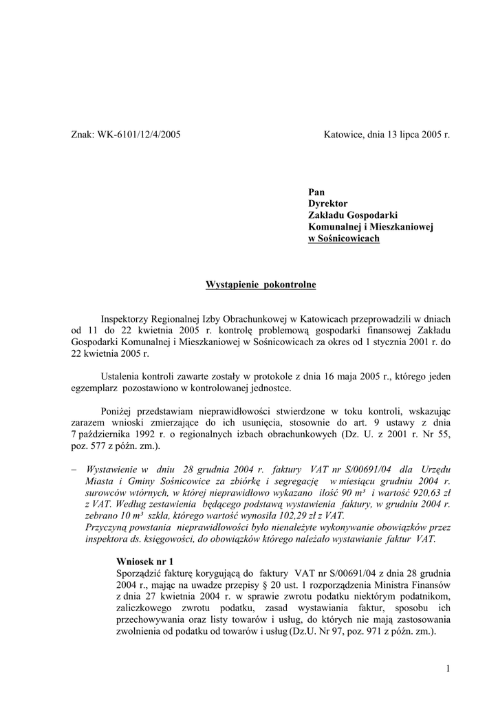 Znak: WK-6101/12/4/2005 Katowice, dnia 13 lipca 2005 r. Pan Dyrektor Zakładu Gospodarki Komunalnej i Mieszkaniowej w Sośnicowicach Wystąpienie pokontrolne Inspektorzy Regionalnej Izby Obrachunkowej w Katowicach przeprowadzili w dniach od 11 do 22 kwietnia 2005 r. kontrolę problemową gospodarki finansowej Zakładu Gospodarki Komunalnej i Mieszkaniowej w Sośnicowicach za okres od 1 stycznia 2001 r. do 22 kwietnia 2005 r. Ustalenia kontroli zawarte zostały w protokole z dnia 16 maja 2005 r., którego jeden egzemplarz pozostawiono w kontrolowanej jednostce. PoniŜej przedstawiam nieprawidłowości stwierdzone w toku kontroli, wskazując zarazem wnioski zmierzające do ich usunięcia, stosownie do art. 9 ustawy z dnia 7 października 1992 r. o regionalnych izbach obrachunkowych (Dz. U. z 2001 r. Nr 55, poz. 577 z późn. zm.). − Wystawienie w dniu 28 grudnia 2004 r. faktury VAT nr S/00691/04 dla Urzędu Miasta i Gminy Sośnicowice za zbiórkę i segregację w miesiącu grudniu 2004 r. surowców wtórnych, w której nieprawidłowo wykazano ilość 90 m³ i wartość 920,63 zł z VAT. Według zestawienia będącego podstawą wystawienia faktury, w grudniu 2004 r. zebrano 10 m³ szkła, którego wartość wynosiła 102,29 zł z VAT. Przyczyną powstania nieprawidłowości było nienaleŜyte wykonywanie obowiązków przez inspektora ds. księgowości, do obowiązków którego naleŜało wystawianie faktur VAT. Wniosek nr 1 Sporządzić fakturę korygującą do faktury VAT nr S/00691/04 z dnia 28 grudnia 2004 r., mając na uwadze przepisy § 20 ust. 1 rozporządzenia Ministra Finansów z dnia 27 kwietnia 2004 r. w sprawie zwrotu podatku niektórym podatnikom, zaliczkowego zwrotu podatku, zasad wystawiania faktur, sposobu ich przechowywania oraz listy towarów i usług, do których nie mają zastosowania zwolnienia od podatku od towarów i usług (Dz.U. Nr 97, poz. 971 z późn. zm.). 1 Wniosek nr 2 Wzmocnić nadzór nad inspektorem ds. księgowości zobowiązanym do wystawiania faktur VAT z tytułu sprzedaŜy usług związanych ze zbiórką i segregacją surowców wtórnych, stosownie do przepisów rozporządzenia Ministra Finansów z dnia 27 kwietnia 2004 r. w sprawie zwrotu podatku niektórym podatnikom, zaliczkowego zwrotu podatku, zasad wystawiania faktur, sposobu ich przechowywania oraz listy towarów i usług, do których nie mają zastosowania zwolnienia od podatku od towarów i usług (Dz.U. Nr 97, poz. 971 z późn. zm.), mając na uwadze art. 35a ustawy z dnia 26 listopada 1998 r. o finansach publicznych (Dz. U. z 2003 r. Nr 15, poz. 148 z późn. zm.). − Zaniechanie prowadzenia ewidencji ilościowo-wartościowej dla prowadzonej zbiórki surowców wtórnych (metal, plastik, szkło) podlegających segregacji i sprzedaŜy do powtórnego przerobu, czym naruszono art. 17 ust. 2 i art. 4 ust. 1 ustawy z dnia 29 września 1994 r. o rachunkowości (Dz.U. z 2002 r. Nr 76, poz. 694 z późn. zm.). Skutkiem powyŜszego był brak moŜliwości przeprowadzenia kontroli ilości i rodzaju zbieranych surowców wtórnych, od momentu ich zbiórki do chwili sprzedaŜy. Odpowiedzialność za stwierdzoną nieprawidłowość ponosi p. Beata Ciepła - Główny Księgowy Zakładu Gospodarki Komunalnej i Mieszkaniowej w Sośnicowicach, która nie złoŜyła wniosku o zmianę planu kont w zakresie prowadzenia ewidencji ilościowowartościowej dla zbieranych surowców wtórnych. Wniosek nr 3 Zaprowadzić ewidencję ilościowo-wartościową dla zbieranych surowców wtórnych, stosownie do art. 17 ust. 2 ustawy z dnia 29 września 1994 r. o rachunkowości (Dz. U. z 2002 r. Nr 76, poz. 694 z późn. zm.). − Brak oznaczenia (nadania numerów inwentarzowych) na środkach trwałych oraz pozostałych środkach trwałych (wyposaŜeniu) będących w posiadaniu Zakładu Gospodarki Komunalnej i Mieszkaniowej w Sośnicowicach. PowyŜszym naruszono ustalenia wewnętrzne wynikające z postanowień pkt 13.1 ppkt f Instrukcji Inwentaryzacyjnej z dnia 25 listopada 1995 r. Odpowiedzialność za powyŜszą nieprawidłowość ponosi p. Henryka Sawczuk - Dyrektor Zakładu Gospodarki Komunalnej i Mieszkaniowej w Sośnicowicach, która nie powierzyła na piśmie obowiązków w tym zakresie Ŝadnemu z pracowników zakładu. Wniosek nr 4 Powierzyć pracownikowi – w formie pisemnej – zadania w zakresie oznaczenia składników majątkowych w postaci środków trwałych i pozostałych środków trwałych numerami inwentarzowymi, stosownie do przepisów art. 35a ustawy z dnia 26 listopada 1998 r. o finansach publicznych (Dz. U. z 2003 r. Nr 15, poz. 148 z późn. zm.) oraz Standardów kontroli finansowej w jednostkach sektora finansów publicznych wprowadzonych Komunikatem Nr 1 Ministra Finansów z dnia 30 stycznia 2003 r. (Dz.Urz. Min. Fin. Nr 3, poz.13). Wniosek nr 5 Nadać numery inwentarzowe środkom trwałym oraz wyposaŜeniu będącym w posiadaniu Zakładu Gospodarki Komunalnej i Mieszkaniowej w Sośnicowicach, mając na uwadze zapisy § 20 pkt 7 Instrukcji Inwentaryzacyjnej przyjętej Zarządzeniem nr 7/2005 z dnia 1 marca 2005 r. 2 − Zaniechanie zachowania pisemnej formy powiadomienia oferentów o wyniku postępowania o udzielenie w roku 2004 zamówienia na realizację zadania pn. „Remont dachów budynków przy ul. Rynek 13, 14, 15 w Sośnicowicach”. PowyŜszym naruszono przepis art. 92 w związku z art. 28 ust. 1 ustawy z dnia 29 stycznia 2004 r. Prawo zamówień publicznych (Dz.U. Nr 19, poz. 177 z późn. zm.). Przyczyną nieprawidłowości było nienaleŜyte wykonywanie obowiązków przez pracownika zatrudnionego na stanowisku administratora budynków mieszkalnych odpowiedzialnego za merytoryczne prowadzenie postępowania. Wniosek nr 6 Wzmocnić nadzór nad pracownikiem odpowiadającym za merytoryczne prowadzenie postępowań o udzielenie zamówień publicznych, stosownie do przepisów ustawy z dnia 29 stycznia 2004 r. Prawo zamówień publicznych (Dz.U. Nr 19, poz. 177 z późn. zm.), mając na uwadze art. 