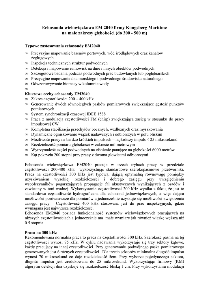 Echosonda wielowiązkowa EM 2040 firmy Kongsberg Maritime na małe zakresy głębokości (do 300 - 500 m) Typowe zastosowania echosondy EM2040 • Precyzyjne mapowanie basenów portowych, wód śródlądowych oraz kanałów żeglugowych Inspekcja technicznych struktur podwodnych Detekcja i mapowanie rumowisk na dnie i innych obiektów podwodnych Szczegółowe badania podczas podwodnych prac budowlanych lub pogłębiarskich Precyzyjne mapowanie dna morskiego i podwodnego środowiska naturalnego Odwzorowywanie biomasy w kolumnie wody • • • • • • Kluczowe cechy echosondy EM2040 • Zakres częstotliwości 200 – 400 kHz • Generowanie dwóch równoległych pasków pomiarowych zwiększające gęstość punktów pomiarowych • System synchronizacji czasowej IDEE 1588 • Praca z modulacją częstotliwości FM (chirp) zwiększająca zasięg w stosunku do pracy impulsowej CW • Kompletna stabilizacja przechyłów bocznych, wzdłużnych oraz myszkowania • Dynamiczne ogniskowanie wiązek nadawczych i odbiorczych w polu bliskim • Możliwość pracy na bardzo krótkich impulsach – najkrótszy impuls < 25 mikrosekund • Rozdzielczość pomiaru głębokości w zakresie milimetrowym • Wytrzymałość części podwodnych na ciśnienie panujące na głębokości 6000 metrów • Kąt pokrycia 200 stopni przy pracy z dwoma głowicami odbiorczymi Echosonda wielowiązkowa EM2040 pracuje w trzech trybach pracy w przedziale częstotliwości 200-400 kHz wykorzystując standardowe szerokopasmowe przetworniki. Praca na częstotliwości 300 kHz jest typową, dającą optymalną równowagę pomiędzy uzyskiwaniem wysokiej rozdzielczości i dobrego zasięgu przy uwzględnieniu współczynników pogarszających propagacje fal akustycznych wynikających z osadów i zawiesiny w toni wodnej. Wykorzystanie częstotliwości 200 kHz wynika z faktu, że jest to standardowa częstotliwość hydrograficzna dla echosond jednowiązkowych, a więc dająca możliwości porównawcze dla pomiarów a jednocześnie uzyskuje się możliwości zwiększenia zasięgu pracy. Częstotliwość 400 kHz stosowana jest do prac inspekcyjnych, gdzie wymagana jest najwyższa rozdzielczość. Echosonda EM2040 posiada funkcjonalność systemów wielowiązkowych pracujących na niższych częstotliwościach a jednocześnie ma małe wymiary jak również wiązkę węższą niż 0.5 stopnia. Praca na 300 kHz Rekomendowana normalna praca to praca na częstotliwości 300 kHz. Szerokość pasma na tej częstotliwości wynosi 75 kHz. W cyklu nadawania wykorzystuje się trzy sektory kątowe, każdy pracujący na innej częstotliwości. Przy generowaniu podwójnego paska pomiarowego generowanych jest 6 różnych częstotliwości. Dla trzech sektorów minimalna długość impulsu wynosi 70 mikrosekund co daje rozdzielczość 5cm. Przy wyborze pojedynczego sektora, długość impulsu jest zredukowana do 25 mikrosekund. Wykorzystując firmowy (KM) algorytm detekcji dna uzyskuje się rozdzielczość bliską 1 cm. Przy wykorzystaniu modulacji częstotliwości FM (chirp) w paśmie 1.7 kHz można uzyskać szerokość 500 metrów paska pomiarowego na głębokości 300 metrów w oceanie. Praca na 200 kHz Tryb pracy na 200 kHz jest podobny jak na 300 kHz. Wykorzystywane są takie same długości impulsów CW, natomiast impulsy FM są dłuższe niż przy 300 kHz. Rozdzielczość zakresowa i rozdzielczość dna są takie same. Typowo wykorzystywane są dwa sektory na pasek pomiarowy. Absorpcja wody na tej częstotliwości jest mniejsza niż przy 300 kHz co w rezultacie pozwala na uzyskanie szerszego paska pomiarowego i większej głębokości. W typowych warunkach oceanicznych na głębokości około 500m uzyskuje się 600m szerokości paska pomiarowego. Praca na 400 kHz Ta częstotliwość głownie jest wykorzystywana podczas prac inspekcyjnych gdzie wymagana jest wysoka rozdzielczość. Zastosowany jest tu bardzo krótki impuls i szerokie pasmo odbiornika. Operator może wybierać 1, 2 lub 3 sektory pracy podczas nadawania. Przy zastosowaniu pojedynczej głowicy odbiorczej kąt pokrycia paska pomiarowego wynosi 120 stopni, przy podwójnej głowicy kąt pokrycia wynosi 180 stopni. Najkrótszy impuls < 25 mikrosekund. Przy ustawieniu dłuższego impulsu nadawczego można także stosować opcję podwójnego paska pomiarowego. Echosonda EM2040 jest systemem modułowym, pozwalającym użytkownikowi na wybór systemu o szerokości wiązki 0.50 x 10 lub 10 x 10 . Wachlarzowa charakterystyka wiązki nadawczej jest podzielona na trzy sektory nadające jednocześnie na różniących się od siebie częstotliwościach. Uzyskuje się przez to stłumienie interferencji pochodzących od silnych ech od dna, co w systemach prostszych widoczne jest na echogramach na zewnątrz kąta poczynając od około 60 stopni. Możliwość stosowania podwójnego paska pomiarowego pozwala na uzyskiwanie dużej gęstości punktów pomiarowych wzdłuż trasy przy stosunkowo dużej prędkości jednostki pomiarowej. Przykładowo przy prędkości 8 węzłów i przy zastosowaniu 0.5 stopniowej szerokości wiązki nadawczej uzyskuje się 100% pokrycie dna. Zasada generowania podwójnego paska pomiarowego Dwie transmisje o różnych częstotliwościach na jeden ping pozwalają na jednoczesne uzyskanie dwóch pasków pomiarowych wzdłuż trasy Dwie wiązki nadawcze Efektywny ślad wiązki na dnie Podwójna gęstość w porównaniu do trybu normalnego Wiązka odbiorcza Ilustracja zasady Mills Cross dla przetworników wielowiązkowych Standardowo podwodne elementy systemu EM2040 wytrzymują ciśnienie panujące na głębokości 6000 metrów. Umożliwia to wykorzystanie echosondy na pojazdach podwodnych typu AUV lub ROV. Elektroniczne układy analogowe umieszczone są w obudowach przetworników a komunikacja z jednostką procesora na powierzchni odbywa się poprzez łącze Ethernet. Dla pojazdów podwodnych jednostka procesora może być umieszczona w pojemniku ciśnieniowym o wewn