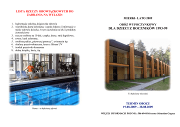LISTA RZECZY OBOWIĄZKOWYCH DO ZABRANIA NA WYJAZD: MIERKI- LATO 2009 1. legitymację szkolną, ksiąŜeczkę zdrowia 2. wypełnioną kartę kolonijną: ( zgoda lekarza i informacje o stanie zdrowia dziecka, w tym uczulenia na leki i produkty Ŝywnościowe 3. rzeczy osobiste na 10 dni, czapka, dresy, strój kąpielowy, 4. rower, kask ochronny, 5. osobisty pakiet „pierwszej pomocy”, aviomarin itp. 6. okulary przeciwsłoneczne, krem z filtrem UV 7. środek przeciwko komarom 8. dobrą ksiąŜkę, karty, itp. OBÓZ WYPOCZYNKOWY DLA DZIECI Z ROCZNIKÓW 1993-99 Tu będziemy mieszkać Basen – tu będziemy pływać TERMIN OBOZU 19.08.2009 – 28.08.2009 WIĘCEJ INFORMACJI POD NR : 506-694-816 trener Sebastian Gogacz PROPONUJEMY: TRANSPORT: autokar- przejazd w obie strony Wyjazd spod OSiR przy ul. Chopina 10/12 Zbiórka godzina 11:00 Powrót pod OSiR przy ul. Chopina 10/12 Godzina przyjazdu 18:00 ZAKWATEROWANIE: Zespół Hotelowy „Kormoran” Mierki k. Olsztynka Pokoje 2,3 i 4– osobowe WYśYWIENIE: Pełne wyŜywienie: kuchnia tradycyjna i regionalna. OPIEKA: Ubezpieczenie NNW, KL Opieka trenerów, instruktorów przez 24h ATRAKCJE: Codzienna kąpiel w Jeziorze Pluszne Wycieczka do Olsztyna Wycieczki po jeziorze rowerami wodnymi Zajęcia na basenie z podwodnym filmowaniem Wycieczki rowerowe oraz piesze, podchody Imprezy na powietrzu, siatkówka, koszykówka Ogniska i wiele innych atrakcji☺ Jadalnia KADRA: mgr Krzysztof Klepko – kierownik obozu, trener MKS POLONIA W-wa, mgr Sebastian Gogacz – trener UKP Wodnik Włocławek, mgr Michał Szafranek – trener UKS TRÓJKA Puławy CENA: Koszt całkowity : 1100 zł REZERWACJA MIEJSC: Wpłata zaliczki : 200 zł do dnia 05.06.2009 na konto: BP INTELIGO LAGUNA SWIMMING 50 1020 5558 1111 1408 6680 0007 z dopiskiem: imię i nazwisko uczestnika „MIERKI 2009” WNIESIENIE CAŁKOWITEJ OPŁATY ZA OBÓZ WYMAGANE DO 02.07.2009