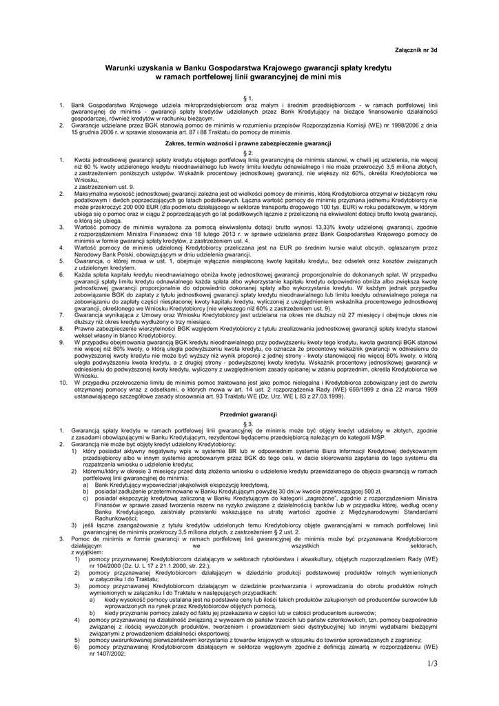 Załącznik nr 3d Warunki uzyskania w Banku Gospodarstwa Krajowego gwarancji spłaty kredytu w ramach portfelowej linii gwarancyjnej de mini mis 1. 2. § 1. Bank Gospodarstwa Krajowego udziela mikroprzedsiębiorcom oraz małym i średnim przedsiębiorcom - w ramach portfelowej linii gwarancyjnej de minimis - gwarancji spłaty kredytów udzielanych przez Bank Kredytujący na bieżące finansowanie działalności gospodarczej, również kredytów w rachunku bieżącym. Gwarancje udzielane przez BGK stanowią pomoc de minimis w rozumieniu przepisów Rozporządzenia Komisji (WE) nr 1998/2006 z dnia 15 grudnia 2006 r. w sprawie stosowania art. 87 i 88 Traktatu do pomocy de minimis. Zakres, termin ważności i prawne zabezpieczenie gwarancji 1. 2. 3. 4. 5. 6. 7. 8. 9. 10. § 2. Kwota jednostkowej gwarancji spłaty kredytu objętego portfelową linią gwarancyjną de minimis stanowi, w chwili jej udzielenia, nie więcej niż 60 % kwoty udzielonego kredytu nieodnawialnego lub kwoty limitu kredytu odnawialnego i nie może przekroczyć 3,5 miliona złotych, z zastrzeżeniem poniższych ustępów. Wskaźnik procentowy jednostkowej gwarancji, nie większy niż 60%, określa Kredytobiorca we Wniosku, z zastrzeżeniem ust. 9. Maksymalna wysokość jednostkowej gwarancji zależna jest od wielkości pomocy de minimis, którą Kredytobiorca otrzymał w bieżącym roku podatkowym i dwóch poprzedzających go latach podatkowych. Łączna wartość pomocy de minimis przyznana jednemu Kredytobiorcy nie może przekroczyć 200 000 EUR (dla podmiotu działającego w sektorze transportu drogowego 100 tys. EUR) w roku podatkowym, w którym ubiega się o pomoc oraz w ciągu 2 poprzedzających go lat podatkowych łącznie z przeliczoną na ekwiwalent dotacji brutto kwotą gwarancji, o którą się ubiega. Wartość pomocy de minimis wyrażona za pomocą ekwiwalentu dotacji brutto wynosi 13,33% kwoty udzielonej gwarancji, zgodnie z rozporządzeniem Ministra Finansówz dnia 18 lutego 2013 r. w sprawie udzielania przez Bank Gospodarstwa Krajowego pomocy de minimis w formie gwarancji spłaty kredytów, z zastrzeżeniem ust. 4. Wartość pomocy de minimis udzielonej Kredytobiorcy przeliczana jest na EUR po średnim kursie walut obcych, ogłaszanym przez Narodowy Bank Polski, obowiązującym w dniu udzielenia gwarancji. Gwarancja, o której mowa w ust. 1, obejmuje wyłącznie niespłaconą kwotę kapitału kredytu, bez odsetek oraz kosztów związanych z udzielonym kredytem. Każda spłata kapitału kredytu nieodnawialnego obniża kwotę jednostkowej gwarancji proporcjonalnie do dokonanych spłat. W przypadku gwarancji spłaty limitu kredytu odnawialnego każda spłata albo wykorzystanie kapitału kredytu odpowiednio obniża albo zwiększa kwotę jednostkowej gwarancji proporcjonalnie do odpowiednio dokonanej spłaty albo wykorzystania kredytu. W każdym jednak przypadku zobowiązanie BGK do zapłaty z tytułu jednostkowej gwarancji spłaty kredytu nieodnawialnego lub limitu kredytu odnawialnego polega na zobowiązaniu do zapłaty części niespłaconej kwoty kapitału kredytu, wyliczonej z uwzględnieniem wskaźnika procentowego jednostkowej gwarancji, określonego we Wniosku Kredytobiorcy (nie większego niż 60% z zastrzeżeniem ust. 9). Gwarancja wynikająca z Umowy oraz Wniosku Kredytobiorcy jest udzielana na okres nie dłuższy niż 27 miesięcy i obejmuje okres nie dłuższy niż okres kredytu wydłużony o trzy miesiące. Prawne zabezpieczenie wierzytelności BGK względem Kredytobiorcy z tytułu zrealizowania jednostkowej gwarancji spłaty kredytu stanowi weksel własny in blanco Kredytobiorcy. W przypadku obejmowania gwarancją BGK kredytu nieodnawialnego przy podwyższeniu kwoty tego kredytu, kwota gwarancji BGK stanowi nie więcej niż 60% kwoty, o którą uległa podwyższeniu kwota kredytu, co oznacza że procentowy wskaźnik gwarancji w odniesieniu do podwyższonej kwoty kredytu nie może być wyższy niż wynik proporcji z jednej strony - kwoty stanowiącej nie więcej 60% kwoty, o którą uległa podwyższeniu kwota kredytu, a z drugiej strony - podwyższonej kwoty kredytu. Wskaźnik procentowy jednostkowej gwarancji w odniesieniu do podwyższonej kwoty kredytu, wyliczony z uwzględnieniem zasady opisanej w zdaniu poprzednim, określa Kredytobiorca we Wniosku. W przypadku przekroczenia limitu de minimis pomoc traktowana jest jako pomoc nielegalna i Kredytobiorca zobowiązany jest do zwrotu otrzymanej pomocy wraz z odsetkami, o których mowa w art. 14 ust. 2 rozporządzenia Rady (WE) 659/1999 z dnia 22 marca 1999 ustanawiającego szczegółowe zasady stosowania art. 93 Traktatu WE (Dz. Urz. WE L 83 z 27.03.1999). Przedmiot gwarancji 1. 2. 3. § 3. Gwarancją spłaty kredytu w ramach portfelowej linii gwarancyjnej de minimis może być objęty kredyt udzielony w złotych, zgodnie z zasadami obowiązującymi w Banku Kredytującym, rezydentowi będącemu przedsiębiorcą należącym do kategorii MŚP. Gwarancją nie może być objęty kredyt udzielony Kredytobiorcy: 1) który posiadał aktywny negatywny wpis w systemie BR lub w odpowiednim systemie Biura Informacji Kredytowej dedykowanym przedsiębiorcy albo w innym systemie aprobowanym przez BGK do tego celu, w dacie skierowania zapytania do tego systemu dla rozpatrzenia wniosku o udzielenie kredytu; 2) któremu/który w okresie 3 miesięcy przed datą złożenia wniosku o udzielenie kredytu przewidzianego do objęcia gwarancją w ramach portfelowej linii gwarancyjnej de minimis: a) Bank Kredytujący wypowiedział jakąkolwiek ekspozycję kredytową, b) posiadał zadłużenie przeterminowane w Banku Kredytującym powyżej 30 dni,w kwocie przekraczającej 500 zł, c) posiadał ekspozycję kredytową zaliczoną w Banku Kredytującym do kategorii „zagrożone”, zgodnie z rozporządzeniem Ministra Finansów w sprawie zasad tworzenia rezerw na ryzyko związane z działalnością banków lub w przypadku której, według oceny Banku Kredytującego, zaistniały 