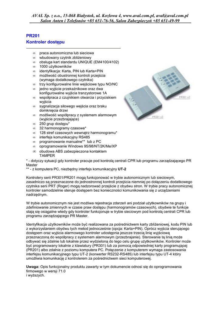 AVAL Sp. z o.o., 15-868 Białystok, ul. Kozłowa 4, www.aval.com.pl, [email protected] Salon Anten i Telefonów +85 651-76-56, Salon Zabezpieczeń +85 651-49-99 PR201 Kontroler dostępu • • • • • • praca autonomiczna lub sieciowa wbudowany czytnik zbliŜeniowy obsługa kart standardu UNIQUE (EM4100/4102) 1000 uŜytkowników identyfikacja: Karta, PIN lub Karta+PIN moŜliwość obustronnej kontroli przejścia (wymaga dodatkowego czytnika) • trzy konfigurowalne linie wejściowe typu NO/NC • jedno wyjście przekaźnikowe oraz dwa konfigurowalne wyjścia tranzystorowe 1A • współpraca z czujnikiem otwarcia i przyciskiem wyjścia • sygnalizacja siłowego wejścia oraz braku domknięcia drzwi • moŜliwość współpracy z systemem alarmowym (wyjście przezbrajające) • 250 grup dostępu* • 32 harmonogramy czasowe* • 128 stref czasowych wewnątrz harmonogramu* • interfejs komunikacyjny RS485 • programowanie manualne** lub z PC • oprogramowanie Windows 95/98/NT/2K/Me/XP • obudowa ABS zabezpieczona kontaktem TAMPER * - dotyczy sytuacji gdy kontroler pracuje pod kontrolą centrali CPR lub programu zarządzającego PR Master ** - z komputera PC, niezbędny interfejs komunikacyjny UT-2 Kontrolery serii PR301/PR201 mogą funkcjonować w trybie autonomicznym lub sieciowym, zasadniczo są przeznaczone do jednostronnej kontroli przejścia niemniej po dołączeniu dodatkowego czytnika serii PRT (Roger) mogą nadzorować przejście z obydwu stron. W trybie pracy autonomicznej kontroler samodzielnie steruje dostępem bez konieczności komunikowania się z urządzeniami nadrzędnym. W trybie autonomicznym nie jest moŜliwa rejestracja zdarzeń ani podział uŜytkowników na grupy i zdefiniowanie zmiennych w czasie praw dostępu (harmonogramów czasowych), obydwie te funkcje stają się osiągalne wtedy gdy kontroler funkcjonuje w trybie sieciowym pod kontrolą centrali CPR lub programu zarządzającego PR Master. Identyfikacja uŜytkowników moŜe być realizowana za pośrednictwem karty zbliŜeniowej, kodu PIN lub z wykorzystaniem obydwu tych metod jednocześnie (opcja: Karta+PIN). Oprócz wyjścia sterującego dostępem oraz wyjścia alarmowego kontroler udostępnia jeszcze trzecią linię wyjściową przeznaczoną do współpracy z systemem alarmowym (przezbrajanie). Sterowanie tą linią moŜe odbywać się zdalnie lub lokalnie przez wydzieloną do tego celu grupę uŜytkowników. Kontroler moŜe być programowany lokalnie z klawiatury (PR301) lub za pomocą odpowiedniej karty programującej (PR201) albo zdalnie z poziomu komputera PC. Połączenie z komputerem wymaga zastosowania interfejsu komunikacyjnego typu UT-2 (konwerter RS232-RS485) lub interfejsu typu UT-4 który umoŜliwia komunikację z kontrolerem za pośrednictwem sieci komputerowej. Uwaga: Opis funkcjonalny produktu zawarty w tym dokumencie odnosi się do oprogramowania firmowego w wersji 71.0 i wyŜszych. AVAL Sp. z o.o., 15-868 Białystok, ul. Kozłowa 4, www.aval.com.pl, [email protected] Salon Anten i Telefonów +85 651-76-56, Salon Zabezpieczeń +85 651-49-99 Napięcie zasilania Pobór prądu Ochrona antysabotaŜowa Zasięg czytania kart Karty Interfejs komunikacyjny Odległość pomiędzy kontrolerem a dodatkowym czytnikiem dostępu Maksymalna odległość pomiędzy kontrolerem a komputerem Linie wejściowe Linie wyjściowe Środowisko pracy Wymiary Waga Dane techniczne 10...15 VDC śr. 80mA Kontakt NC, 30V/50mA, detekcja otwarcia obudowy oraz oderwania od podłoŜa Do 12cm dla kart ISO (zaleŜy od typu i dostawcy karty) Standard UNIQUE, modulacja ASK, 125kHz (kompatybilne z EM4001/2) RS485 - moŜliwość stosowania struktur typu "drzewo" 150 m (500 ft) 1200 m (4000 ft) Trzy konfigurowalne linie typu NO/NC Dwa w pełni zabezpieczone wyjścia tranzystorowe o obciąŜalności 1A oraz wyjście przekaźnikowe 1.5A DC/AC Klasa I - warunki wewnętrzne ograniczone do środowiska biurowo-mieszkalnego 105 x 105 x 31 mm (szer. x wys. x głęb.) 175g