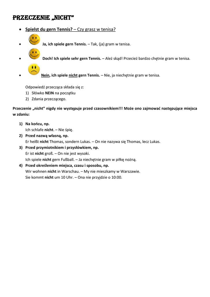 Przeczenie „nicht” Spielst du gern Tennis? – Czy grasz w tenisa? Ja, ich spiele gern Tennis. – Tak, (ja) gram w tenisa. Doch! Ich spiele sehr gern Tennis. – Ależ skąd! Przecież bardzo chętnie gram w tenisa. Nein, ich spiele nicht gern Tennis. – Nie, ja niechętnie gram w tenisa. Odpowiedź przecząca składa się z: 1) Słówko NEIN na początku 2) Zdania przeczącego. Przeczenie „nicht” nigdy nie występuje przed czasownikiem!!! Może ono zajmować następujące miejsca w zdaniu: 1) Na końcu, np. Ich schlafe nicht. – Nie śpię. 2) Przed nazwą własną, np. Er heißt nicht Thomas, sondern Lukas. – On nie nazywa się Thomas, lecz Lukas. 3) Przed przymiotnikiem i przysłówkiem, np. Er ist nicht groß. – On nie jest wysoki. Ich spiele nicht gern Fußball. – Ja niechętnie gram w piłkę nożną. 4) Przed określeniem miejsca, czasu i sposobu, np. Wir wohnen nicht in Warschau. – My nie mieszkamy w Warszawie. Sie kommt nicht um 10 Uhr. – Ona nie przyjdzie o 10:00.