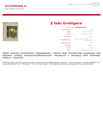 Wyczerpane.pl SOWA Sp. z o.o. ul. Hrubieszowska 6a 01-209 Warszawa Z teki Grottgera Cena brutto: Liczba stron: 40,00 PLN 216 ISBN: 83-205-4403-3 Autor: Konopnicka Maria Format: 165x238 Wydawnictwo: LSW Ludowa Spółdzielnia Wydawnicza Rok wydania: 1992 Oprawa: Miękka Język: polski EAN: 9788320544039 Wybór utworów prozatorskich (opowiadania) i wierszy Marii Konopnickiej, powstałych pod wpływem przeżyć artystyczno-patriotycznych związanych z percepcją dzieł wybitnego malarza i rysownika. Publikacja zawiera także 48 całostronicowych, czarno-białych reprodukcji obrazów, akwareli i - przede wszystkim - rysunków Gottgera, m.in. z jego patriotycznych cykli: "Warszawa", "Polonia", Litwa i Wojna". Tekst dopełniono obszernymi przypisami historyczno-literackimi.