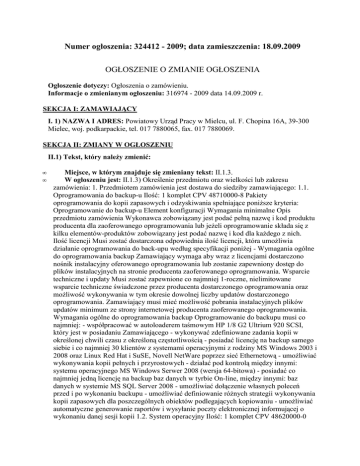 Numer ogłoszenia: 324412 - 2009; data zamieszczenia: 18.09.2009 OGŁOSZENIE O ZMIANIE OGŁOSZENIA Ogłoszenie dotyczy: Ogłoszenia o zamówieniu. Informacje o zmienianym ogłoszeniu: 316974 - 2009 data 14.09.2009 r. SEKCJA I: ZAMAWIAJĄCY I. 1) NAZWA I ADRES: Powiatowy Urząd Pracy w Mielcu, ul. F. Chopina 16A, 39-300 Mielec, woj. podkarpackie, tel. 017 7880065, fax. 017 7880069. SEKCJA II: ZMIANY W OGŁOSZENIU II.1) Tekst, który naleŜy zmienić: • • Miejsce, w którym znajduje się zmieniany tekst: II.1.3. W ogłoszeniu jest: II.1.3) Określenie przedmiotu oraz wielkości lub zakresu zamówienia: 1. Przedmiotem zamówienia jest dostawa do siedziby zamawiającego: 1.1. Oprogramowania do backup-u Ilość: 1 komplet CPV 48710000-8 Pakiety oprogramowania do kopii zapasowych i odzyskiwania spełniające poniŜsze kryteria: Oprogramowanie do backup-u Element konfiguracji Wymagania minimalne Opis przedmiotu zamówienia Wykonawca zobowiązany jest podać pełną nazwę i kod produktu producenta dla zaoferowanego oprogramowania lub jeŜeli oprogramowanie składa się z kilku elementów-produktów zobowiązany jest podać nazwę i kod dla kaŜdego z nich. Ilość licencji Musi zostać dostarczona odpowiednia ilość licencji, która umoŜliwia działanie oprogramowania do back-upu według specyfikacji poniŜej - Wymagania ogólne do oprogramowania backup Zamawiający wymaga aby wraz z licencjami dostarczono nośnik instalacyjny oferowanego oprogramowania lub zostanie zapewniony dostęp do plików instalacyjnych na stronie producenta zaoferowanego oprogramowania. Wsparcie techniczne i updaty Musi zostać zapewnione co najmniej 1-roczne, nielimitowane wsparcie techniczne świadczone przez producenta dostarczonego oprogramowania oraz moŜliwość wykonywania w tym okresie dowolnej liczby updatów dostarczonego oprogramowania. Zamawiający musi mieć moŜliwość pobrania instalacyjnych plików updatów minimum ze strony internetowej producenta zaoferowanego oprogramowania. Wymagania ogólne do oprogramowania backup Oprogramowanie do backupu musi co najmniej: - współpracować w autoloaderem taśmowym HP 1/8 G2 Ultrium 920 SCSI, który jest w posiadaniu Zamawiającego - wykonywać zdefiniowane zadania kopii w określonej chwili czasu z określoną częstotliwością - posiadać licencję na backup samego siebie i co najmniej 30 klientów z systemami operacyjnymi z rodziny MS Windows 2003 i 2008 oraz Linux Red Hat i SuSE, Novell NetWare poprzez sieć Ethernetową - umoŜliwiać wykonywania kopii pełnych i przyrostowych - działać pod kontrolą między innymi: systemu operacyjnego MS Windows Serwer 2008 (wersja 64-bitowa) - posiadać co najmniej jedną licencję na backup baz danych w tyrbie On-line, między innymi: baz danych w systemie MS SQL Server 2008 - umoŜliwiać dołączenie własnych poleceń przed i po wykonaniu backupu - umoŜliwiać definiowanie róŜnych strategii wykonywania kopii zapasowych dla poszczególnych obiektów podlegających kopiowaniu - umoŜliwiać automatyczne generowanie raportów i wysyłanie poczty elektronicznej informującej o wykonaniu danej sesji kopii 1.2. System operacyjny Ilość: 1 komplet CPV 48620000-0 Systemy operacyjne spełniające poniŜsze kryteria: Opis przedmiotu zamówienia Wykonawca zobowiązany jest podać pełną nazwę i kod produktu producenta dla zaoferowanego oprogramowania lub jeŜeli oprogramowanie składa się z kilku elementów - produktów zobowiązany jest podać nazwę i kod dla kaŜdego z nich. 1. Ilość licencji obsługiwanych serwerów Musi zostać dostarczona odpowiednia ilość licencji, która umoŜliwia instalację wirtualnego systemu operacyjnego (wg specyfikacji poniŜej) dla minimum trzech serwerów dwuprocesorowych czterordzeniowych 64-bitowych Muszą zostać dostarczone odpowiednie licencje na oprogramowanie, umoŜliwiające zdalne zarządzanie (wg specyfikacji poniŜej) wszystkimi naraz wirtualizacyjnymi systemami operacyjnymi oraz zainstalowanymi na nich wirtualnymi maszynami. 2 Sposób instalacji Oprogramowanie wirtualizacyjne instalowane bezpośrednio na serwerze fizycznym bez konieczności instalowania innego systemu operacyjnego 3 Oprogramowanie musi posiadać centralną konsolę graficzną do zarządzania wieloma maszynami wirtualnymi oraz ich zasobami pracującymi na wielu serwerach fizycznych - globalne zarządzanie kontrolą dostępu do serwerów i maszyn wirtualnych - wykonywanie automatycznych bądź manualnych zadań w celu optymalizacji infrastruktury dla maszyn wirtualnych; - widok całego systemu i zbioru maszyn wirtualnych. Mapy Infrastruktury - moŜliwość monitorowania dostępności i wydajności maszyn wirtualnych; - moŜliwość raportowania dostępności i wydajności maszyn wirtualnych - funkcje ochrony dostępu zintegrowane z mechanizmem uwierzytelniania Windows; - planowanie zadań i ustawianie znaczników alarmów w celu generowania automatycznych powiadomień o statusie serwerów lub maszyn wirtualnych; - tworzenie obrazów maszyn wirtualnych - klonowanie maszyn wirtualnych - wykonywanie wielu kopii migawkowych (snapshoot) w kaŜdym momencie pracy maszyny wirtualnej oraz moŜliwość powrotu do jej stanu z kaŜdego momentu zrobienia kopii. 4 RównowaŜenie obciąŜenia serwerów MoŜliwość automatycznego przenoszenia maszyn wirtualnych bez konieczności ich zatrzymywania w celu równowaŜenia obciąŜenia serwerów. 5 Przenoszenie dysków wirtualnych MoŜliwość przeniesienia dysków wirtualnych maszyn między macierzami z zachowaniem nieprzerwanego dostępu. 6 Zabezpieczenie przed uszkodzeniem maszyn fizycznych MoŜliwość automatycznego uruchomienia maszyn wirtualnych w przypadku uszkodzenia maszyn fizycznych 7 Monitoring zasobów MoŜliwość ciągłego monitoringu utylizacji zasobów z moŜliwością tworzenia polityk określających przydzielanie zasobów z określonymi priorytetami. 8 Backup danych MoŜliwość tworzenia backupu maszyn wirtualnych bez konieczności ich zatrzymywa