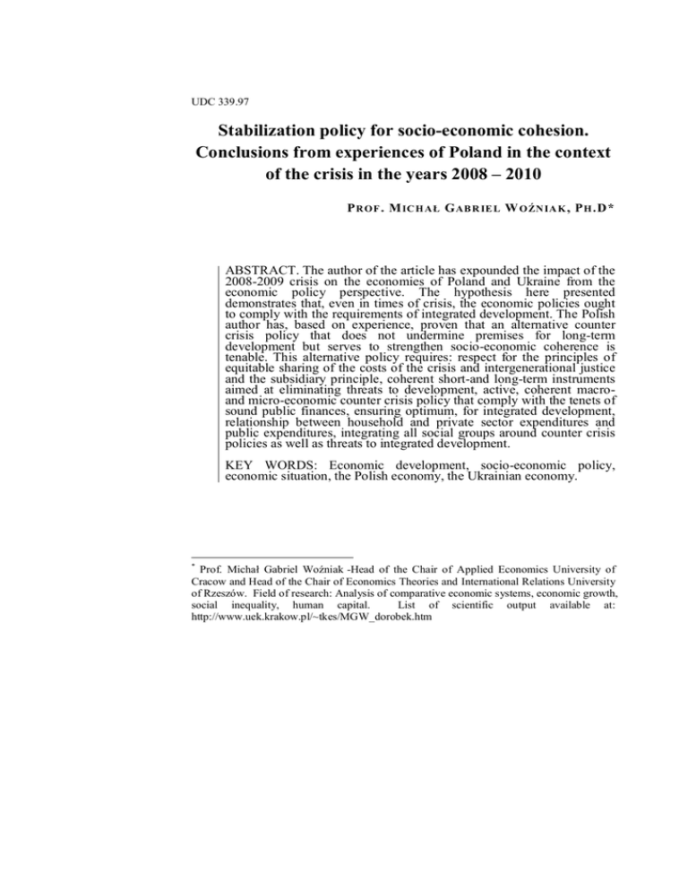UDC 339.97 Stabilization policy for socio-economic cohesion. Conclusions from experiences of Poland in the context of the crisis in the years 2008 – 2010 P R OF . M IC H AŁ G AB R IE L W O ŹN IA K , P H .D* ABSTRACT. The author of the article has expounded the impact of the 2008-2009 crisis on the economies of Poland and Ukraine from the economic policy perspective. The hypothesis here presented demonstrates that, even in times of crisis, the economic policies ought to comply with the requirements of integrated development. The Polish author has, based on experience, proven that an alternative counter crisis policy that does not undermine premises for long-term development but serves to strengthen socio-economic coherence is tenable. This alternative policy requires: respect for the principles of equitable sharing of the costs of the crisis and intergenerational justice and the subsidiary principle, coherent short-and long-term instruments aimed at eliminating threats to development, active, coherent macroand micro-economic counter crisis policy that comply with the tenets of sound public finances, ensuring optimum, for integrated development, relationship between household and private sector expenditures and public expenditures, integrating all social groups around counter crisis policies as well as threats to integrated development. KEY WORDS: Economic development, socio-economic policy, economic situation, the Polish economy, the Ukrainian economy. * Prof. Michał Gabriel Woźniak -Head of the Chair of Applied Economics University of Cracow and Head of the Chair of Economics Theories and International Relations University of Rzeszów. Field of research: Analysis of comparative economic systems, economic growth, social inequality, human capital. List of scientific output available at: http://www.uek.krakow.pl/~tkes/MGW_dorobek.htm References 1. Barber, B. R., Skonsumowani. Jak rynek psuje dzieci, infantylizuje dorosіych i poіyka obywateli, Warszawa: Wydawnictwo MUZA, 2007. 2. Debord, G., Spoіeczeсstwo spektaklu oraz rozwaїania o spoіeczeсstwie spektaklu, Warszawa: Paсstwowy Instytut Wydawniczy, 2006. 3. IMF, 2010, International Monetary Fund on-line data, www.imf.org, 15 th of November 2010. 4. Nowy kredyt MFW dla Ukrainy, „Tydzieс na wschodzie”, Biuletyn Analityczny. Rosja, Kaukaz, Azja Centralna, nr 24(142) z 3.07. 2010 r. Wersja angielska tego biuletynu: „Eastweek”. 5. Rawls, J., Teoria sprawiedliwoњci, Warszawa: Paсstwowe Wydawnictwo Naukowe, 1994. 6. The Lizbon Strategy for Growth and Employment, Report from the High Level Group Claired by Wim Kok, November 2004. 7. UNCTAD, Trade and Development, Report 2007, New York – Geneva, 2007. 8. Woźniak, M. G., ”Paradoksy rozwoju kapitaіu ludzkiego a konwergencja ekonomiczna” W: Konwergencja modeli ekonomicznych. Polska i Ukraina, red., M. G. Wozniak, V. Chuzhikov, D. Lukianienko, Krakуw: Fundacja Uniwersytetu Ekonomicznego w Krakowie, 2009, s. 145 164 (opublikowana w jкzyku ukraiсskim, red. D. Lukianienko, V. Chuzhikov, M. G. Woџniak, Kyiv: KNEU, 2010, s. 144-163). 9. UNECE, 2010, United Nation Economic Commission for Europe online data base, www.unece.org, 15 th of November 2010. 10. Woźniak, M. G., „Odkіadane kwestie spуjnoњci spoіecznoekonomicznej” W: Konwergencja modeli ekonomicznych. Polska i Ukraina, red., M. G. Wozniak, V. Chuzhikov, D. Lukianienko, Krakуw: Fundacja Uniwersytetu Ekonomicznego w Krakowie, 2009, s. 261 - 268 (opublikowana w jкzyku ukraiсskim, red., D. Lukianienko, V. Chuzhikov, M.G. Woџniak, Kyiv: KNEU, 2010, s. 261-269). 11. Jerzy Żyżyński, Strukturalne przyczyny kryzysu, maszynopis referatu wygіoszonego na konferencji pt.: Neoliberalizm w obliczu њwiatowego kryzysu finansowego, Warszawa: Instytut Badaс nad Spoіeczn№ Gospodark№ Rynkow№ im J. M. Keynesa, Stowarzyszenie Ruch Spoіeczny „Praca-Pokуj-Sprawiedliwoњж”, Wyїsza Szkoіa EkonomicznoInformatyczna w Warszawie, 19 grudnia 2008. The article was received by the editorial board on 25.11.2010 The full text of the article is available in Ukrainian.