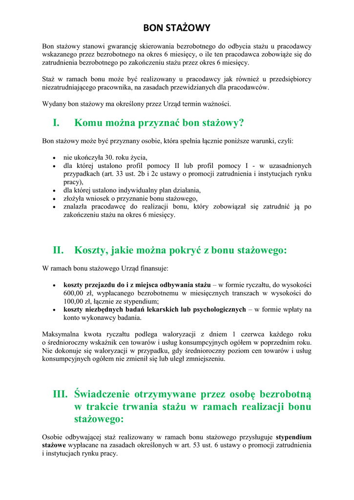 BON STAŻOWY I. Komu można przyznać bon stażowy? II. Koszty