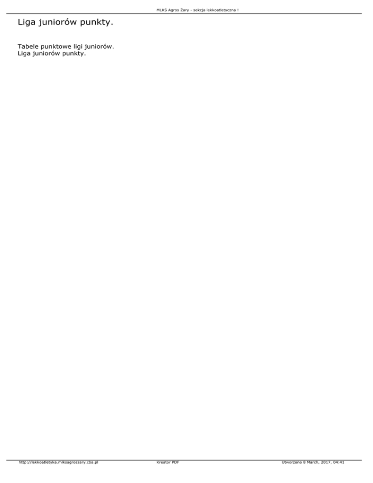 MLKS Agros Żary - sekcja lekkoatletyczna ! Liga juniorów punkty. Tabele punktowe ligi juniorów. Liga juniorów punkty. http://lekkoatletyka.mlksagroszary.cba.pl Kreator PDF Utworzono 8 March, 2017, 04:41