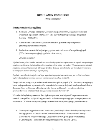 REGULAMIN KONKURSU „Wyspa szczęścia” Postanowienia ogólne 1. Konkurs „Wyspa szczęścia”, zwany dalej Konkursem, organizowany jest w ramach opolskich obchodów VIII Edycji Ogólnopolskiego Tygodnia Kariery – OTK 2016. 2. Adresatami Konkursu są uczniowie szkół gimnazjalnych i ponadgimnazjalnych miasta Opola. 3. Zadaniem uczestników jest przygotowanie dokumentów aplikacyjnych (CV + list motywacyjny) zgodnie z instrukcją. „Wyspa szczęścia” Wyobraź sobie gdzież daleko, na środku oceanu istnieje państwo usytuowane na wyspie o wspaniałym, przyjaznym klimacie, bujnej roślinności i bogatą w różne złoża naturalne. Wyspę zamieszkują ludzie przyjaźni, spokojni i pracowici. Głównym źródłem dochodu mieszkańców jest turystyka i rolnictwo, w mniejszym stopniu przemysł wydobywczy. Zgodnie z wieloletnią tradycją rząd tego wyspiarskiego państwa wybierany jest co 5 lat na drodze wyboru kandydatów spośród zgłoszeń napływających z całego świata . Twoje zadanie polega na przesłaniu dokumentów aplikacyjnych (CV i listu motywacyjnego), które mają przekonać reprezentantów mieszkańców wyspy, że jesteś idealnym kandydatem do rządu. Sam wybierz na jakie stanowisko chcesz aplikować – premiera, ministra sprawiedliwości, finansów lub innego, które możesz stworzyć W zadaniu będziemy oceniać Twoją kreatywność, umiejętność argumentowania swoich pomysłów, spójność wypowiedzi w liście motywacyjnym oraz poprawność tworzenia CV i listu motywacyjnego (forma listu motywacyjnego jest dowolna). 4. Głównymi organizatorami Konkursu jest Miejska Poradnia PsychologicznoPedagogiczna w Opolu oraz Centrum Informacji i Planowania Kariery Zawodowej Wojewódzkiego Urzędu Pracy w Opolu przy współpracy z Gimnazjami i Szkołami Ponadgimnazjalnymi miasta Opola. 1 5. Konkurs organizowany jest na zasadach określonych niniejszym regulaminem i zgodnie z powszechnie obowiązującymi zasadami prawa. 6. Regulamin Konkursu dostępny jest na stronie internetowej Miejskiej Poradni Psychologiczno-Pedagogicznej w Opolu oraz u szkolnych doradców zawodowych i pedagogów szkolnych szkół. Uczestnictwo w konkursie 1. Uczestnikami konkursu mogą być uczniowie szkół gimnazjalnych i ponadgimnazjalnych miasta Opola. 2. Warunkiem uczestnictwa w konkursie jest podanie danych kontaktowych, w tym imienia i nazwiska, adresu, adresu e-mail oraz ewentualnie numeru telefonu w zakresie niezbędnym do kontaktowania się organizatorów z uczestnikiem. 3. Udział w konkursie jest równoznaczny z wyrażeniem przez osoby uczestniczące zgody na przetwarzanie przez organizatora ich danych osobowych na potrzeby konkursu oraz w celach marketingowych organizatora (ustawa o ochronie danych osobowych z dnia 29.08.1997r. Dz.U. nr 133 poz. 883 z późn. zmianami). 4. Udział w konkursie jest jednoznaczny z nieodpłatnym udzieleniem prawa do nieodpłatnego wykorzystania prac w następujących polach eksploatacji: druku w dowolnej liczbie publikacji i w dowolnym nakładzie, prezentacji podczas wystaw plenerowych, publikacji w Internecie. 5. Nadesłanie prac oznacza akceptację warunków konkursu i regulaminu. 6. Osoby niepełnoletnie dołączają pisemną zgodę rodziców lub opiekunów na udział w konkursie. Terminarz Konkursu 1. Konkurs trwa od 1 października 2016r. do 12.10. 2016 roku. 2. Ostatecznym terminem nadsyłania jest 12.10.2016 r. 3. Rozstrzygnięcie Konkursu i ogłoszenie imion i nazwisk zwycięzców nastąpi podczas obchodów VIII Edycji OTK – 17-22.10.2016r. 2 Zasady Konkursu 1. Do konkursu prace należy zgłaszać w formie : a. CV – praca pisemna b. List motywacyjny – praca pisemna (max. dwie strony A-4, rozmiar czcionki: 12) c. film – czas trwania max. 5 minut, zapisany na płycie CD 2. Prace powinny być podpisane imieniem, nazwiskiem, należy podać szkołę i klasę do której uczęszcza uczeń, a także adres i numer telefonu autora. 3. Uczniowie składają prace w zamkniętych i podpisanych kopertach u szkolnych doradców zawodowych lub pedagogów szkolnych w swoich szkołach w nieprzekraczalnym terminie do 12.10.2016. Przebieg oraz zasady prowadzenia Konkursu 1. Uczestnicy Konkursu zostaną podzieleni na dwie grupy wiekowe: - uczniowie gimnazjum; - uczniowie szkół ponadgimnazjalnych . 2. O wyłonieniu zwycięzców Konkursu decyduje powołana w tym celu Komisja Konkursowa, zwana dalej Komisją. 3. Komisję powołuje Organizator. 4. Prace konkursowe nie spełniające warunków regulaminu nie będą klasyfikowane przez Komisję. 5. Spośród zgłoszonych do Konkursu prac Komisja wybierze najciekawsze i przyzna nagrody 6. W uzasadnionych przypadkach istnieje możliwość przyznania specjalnych wyróżnień dla autorów prac nienagrodzonych. 7. Decyzja Komisji jest ostateczna. 8. Laureaci konkursu zostaną powiadomieni o przyznaniu nagród przez Organizatorów. 3