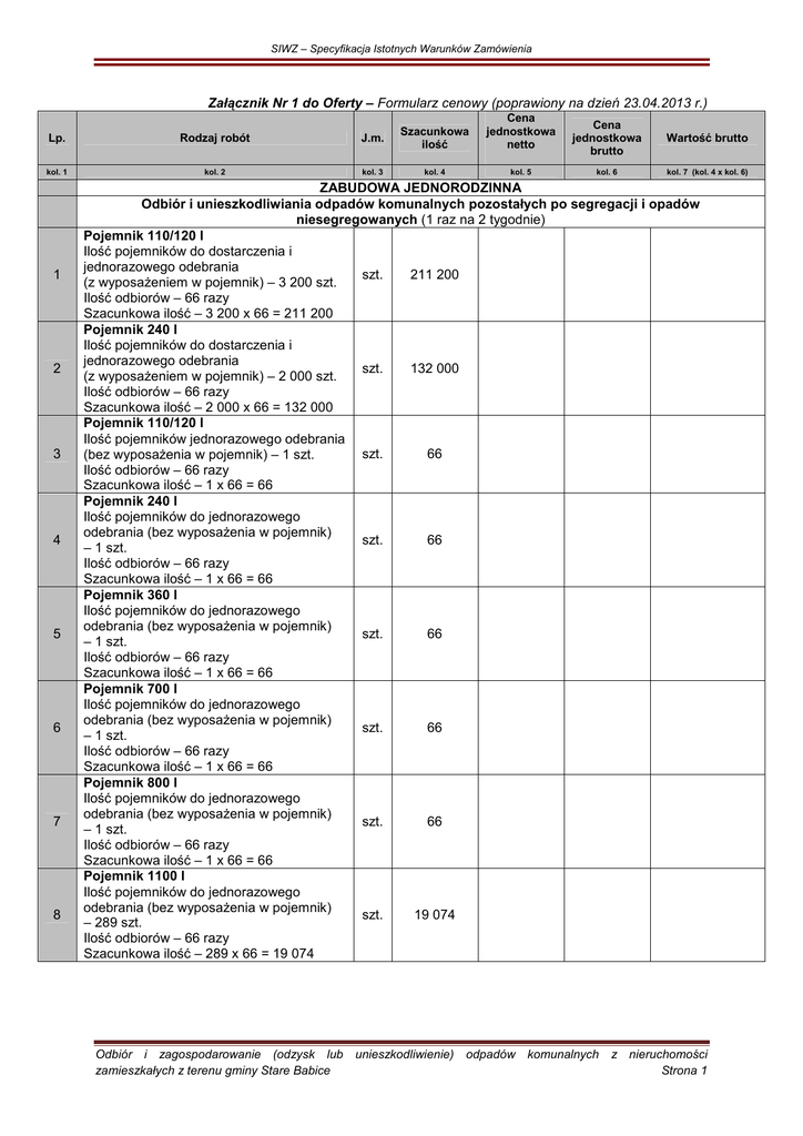 SIWZ – Specyfikacja Istotnych Warunków Zamówienia Załącznik Nr 1 do Oferty – Formularz cenowy (poprawiony na dzień 23.04.2013 r.) Lp. Rodzaj robót J.m. Szacunkowa ilość kol. 1 kol. 2 kol. 3 kol. 4 1 2 3 4 5 6 7 8 Cena jednostkowa netto kol. 5 Cena jednostkowa brutto Wartość brutto kol. 6 kol. 7 (kol. 4 x kol. 6) ZABUDOWA JEDNORODZINNA Odbiór i unieszkodliwiania odpadów komunalnych pozostałych po segregacji i opadów niesegregowanych (1 raz na 2 tygodnie) Pojemnik 110/120 l Ilość pojemników do dostarczenia i jednorazowego odebrania szt. 211 200 (z wyposażeniem w pojemnik) – 3 200 szt. Ilość odbiorów – 66 razy Szacunkowa ilość – 3 200 x 66 = 211 200 Pojemnik 240 l Ilość pojemników do dostarczenia i jednorazowego odebrania szt. 132 000 (z wyposażeniem w pojemnik) – 2 000 szt. Ilość odbiorów – 66 razy Szacunkowa ilość – 2 000 x 66 = 132 000 Pojemnik 110/120 l Ilość pojemników jednorazowego odebrania szt. 66 (bez wyposażenia w pojemnik) – 1 szt. Ilość odbiorów – 66 razy Szacunkowa ilość – 1 x 66 = 66 Pojemnik 240 l Ilość pojemników do jednorazowego odebrania (bez wyposażenia w pojemnik) szt. 66 – 1 szt. Ilość odbiorów – 66 razy Szacunkowa ilość – 1 x 66 = 66 Pojemnik 360 l Ilość pojemników do jednorazowego odebrania (bez wyposażenia w pojemnik) szt. 66 – 1 szt. Ilość odbiorów – 66 razy Szacunkowa ilość – 1 x 66 = 66 Pojemnik 700 l Ilość pojemników do jednorazowego odebrania (bez wyposażenia w pojemnik) szt. 66 – 1 szt. Ilość odbiorów – 66 razy Szacunkowa ilość – 1 x 66 = 66 Pojemnik 800 l Ilość pojemników do jednorazowego odebrania (bez wyposażenia w pojemnik) szt. 66 – 1 szt. Ilość odbiorów – 66 razy Szacunkowa ilość – 1 x 66 = 66 Pojemnik 1100 l Ilość pojemników do jednorazowego odebrania (bez wyposażenia w pojemnik) szt. 19 074 – 289 szt. Ilość odbiorów – 66 razy Szacunkowa ilość – 289 x 66 = 19 074 Odbiór i zagospodarowanie (odzysk lub zamieszkałych z terenu gminy Stare Babice unieszkodliwienie) odpadów komunalnych z nieruchomości Strona 1 SIWZ – Specyfikacja Istotnych Warunków Zamówienia 9 10 11 11 12 13 14 Odbiór i zagospodarowanie odpadów komunalnych zbieranych selektywnie (segregowanych) (1 raz na miesiąc) Worek niebieski o pojemności 120 l na papier, tworzywa sztuczne, drobny złom i opakowania wielomateriałowe szt. 334 000 Ilość worków do dostarczenia i odebrania w okresie realizacji zamówienia – 334 000 szt. Worek zielony o pojemności 60 l na szkło Ilość worków do dostarczenia i odebrania w szt. 166 000 okresie realizacji zamówienia – 166 000 szt. Odbiór i zagospodarowanie odpadów biodegradowalnych (1 raz na dwa tygodnie w okresie od 1 kwietnia do 30 listopada) Worek brązowy lub pojemnik o pojemności 120 l Ilość worków do dostarczenia i odebrania w szt. 150 000 okresie realizacji zamówienia – 150 000 szt. ZABUDOWA WIELORODZINNA Odbiór i unieszkodliwiania odpadów komunalnych pozostałych po segregacji i opadów niesegregowanych (3 razy w tygodniu) Pojemnik 1100 l Ilość pojemników do dostarczenia i jednorazowego odebrania szt. 7 800 (z wyposażeniem w pojemnik) – 20 szt. Ilość odbiorów – 390 razy Szacunkowa ilość – 20 x 390 = 7 800 Odbiór i zagospodarowanie odpadów komunalnych zbieranych selektywnie (segregowanych) (1 raz na tydzień) Pojemnik 1100 l na papier, tworzywa sztuczne, drobny złom i opakowania wielomateriałowe (zabudowa wielorodzinna) Ilość pojemników do dostarczenia i szt. 2 600 jednorazowego odebrania (z wyposażeniem w pojemnik) – 20 szt. Ilość odbiorów – 130 razy Szacunkowa ilość – 20 x 130 = 2 600 Pojemnik 1100 l na szkło Ilość pojemników do dostarczenia i jednorazowego odebrania szt. 1 950 (z wyposażeniem w pojemnik) – 15 szt. Ilość odbiorów – 130 razy Szacunkowa ilość – 15 x 130 = 1 950 Odbiór i zagospodarowanie odpadów biodegradowalnych (1 raz na dwa tygodnie w okresie od 1 kwietnia do 30 listopada) Pojemnik 240 l na odpady biodegradowalne Ilość pojemników do dostarczenia i szt. 840 jednorazowego odebrania (z wyposażeniem w pojemnik) – 20 szt. Ilość odbiorów – 42 razy Szacunkowa ilość – 20 x 42 = 840 Odbiór i zagospodarowanie (odzysk lub zamieszkałych z terenu gminy Stare Babice unieszkodliwienie) odpadów komunalnych z nieruchomości Strona 2 SIWZ – Specyfikacja Istotnych Warunków Zamówienia 15 16 17 18 19 21 22 23 ODPADY ODBIERANE Z GMINNEGO PUNKTU SELEKTYWNEJ ZBIÓRKI ODPADÓW I PUNKTÓW SELEKTYWNEJ ZBIÓRKI PRZETERMINOWANYCH LEKÓW I BATERII Odbiór zagospodarowanie odpadów 2 wielkogabarytowych (1 raz w roku) m 1000 Ilość odbiorów – 3 razy Odbiór i zagospodarowanie zużytych opon Mg 3,5 Odbiór i zagospodarowanie zużytych Mg 0,9 akumulatorów Odbiór i zagospodarowanie zużytego Mg 3,5 sprzętu elektrycznego i elektronicznego Odbiór i zagospodarowanie odpadowych Mg 0,0016 chemikaliów Odbiór i zagospodarowanie odpadów Mg 500 budowlanych i rozbiórkowych Odbiór i zagospodarowanie leków Mg 0,8 Odbiór i zagospodarowanie baterii Mg 0,35 Razem (suma kol. 7) Porównawcza cena ofertowa brutto (wpisać do Oferty Wykonawcy) Cena jednostkowa brutto dla każdej pozycji musi być podana z dokładnością do jednego grosza. Określone ilości usług w ramach przedmiotu zamówienia są szacunkowe i będą ulegały zmianie w zależności od potrzeb Zamawiającego, na co Wykonawca wyraża zgodę i nie będzie dochodził roszczeń z tytułu zmian ilościowych w trakcie realizacji przedmiotu zamówienia. Faktyczne ilości wykonanych usług mogą odbiegać od podanych ilości. Zamawiający nie jest zobowiązany do zrealizowania w całości podanych ilości usług jak też może zwiększyć ilości poszczególnych usług w zależności od potrzeb. Zmiany w tym zakresie (zmniejszenie lub zwiększenie ilości) nie stanowią zmiany warunków umowy i nie wymagają formy pisemnej w postaci aneksów. …………………………