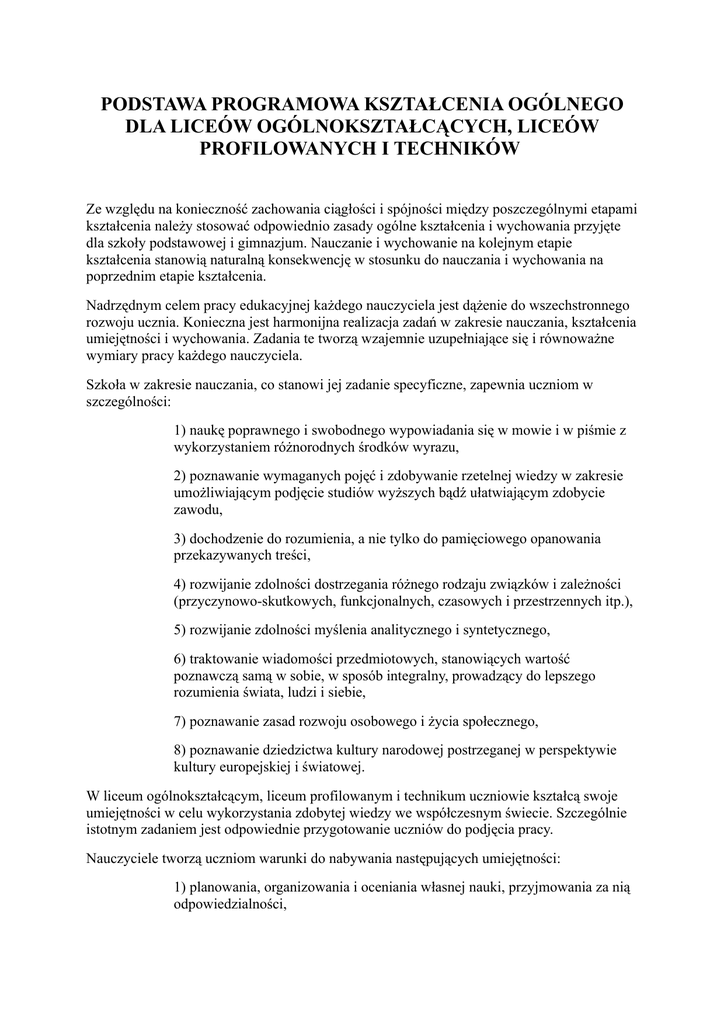 PODSTAWA PROGRAMOWA KSZTAŁCENIA OGÓLNEGO DLA LICEÓW OGÓLNOKSZTAŁCĄCYCH, LICEÓW PROFILOWANYCH I TECHNIKÓW Ze względu na konieczność zachowania ciągłości i spójności między poszczególnymi etapami kształcenia należy stosować odpowiednio zasady ogólne kształcenia i wychowania przyjęte dla szkoły podstawowej i gimnazjum. Nauczanie i wychowanie na kolejnym etapie kształcenia stanowią naturalną konsekwencję w stosunku do nauczania i wychowania na poprzednim etapie kształcenia. Nadrzędnym celem pracy edukacyjnej każdego nauczyciela jest dążenie do wszechstronnego rozwoju ucznia. Konieczna jest harmonijna realizacja zadań w zakresie nauczania, kształcenia umiejętności i wychowania. Zadania te tworzą wzajemnie uzupełniające się i równoważne wymiary pracy każdego nauczyciela. Szkoła w zakresie nauczania, co stanowi jej zadanie specyficzne, zapewnia uczniom w szczególności: 1) naukę poprawnego i swobodnego wypowiadania się w mowie i w piśmie z wykorzystaniem różnorodnych środków wyrazu, 2) poznawanie wymaganych pojęć i zdobywanie rzetelnej wiedzy w zakresie umożliwiającym podjęcie studiów wyższych bądź ułatwiającym zdobycie zawodu, 3) dochodzenie do rozumienia, a nie tylko do pamięciowego opanowania przekazywanych treści, 4) rozwijanie zdolności dostrzegania różnego rodzaju związków i zależności (przyczynowo-skutkowych, funkcjonalnych, czasowych i przestrzennych itp.), 5) rozwijanie zdolności myślenia analitycznego i syntetycznego, 6) traktowanie wiadomości przedmiotowych, stanowiących wartość poznawczą samą w sobie, w sposób integralny, prowadzący do lepszego rozumienia świata, ludzi i siebie, 7) poznawanie zasad rozwoju osobowego i życia społecznego, 8) poznawanie dziedzictwa kultury narodowej postrzeganej w perspektywie kultury europejskiej i światowej. W liceum ogólnokształcącym, liceum profilowanym i technikum uczniowie kształcą swoje umiejętności w celu wykorzystania zdobytej wiedzy we współczesnym świecie. Szczególnie istotnym zadaniem jest odpowiednie przygotowanie uczniów do podjęcia pracy. Nauczyciele tworzą uczniom warunki do nabywania następujących umiejętności: 1) planowania, organizowania i oceniania własnej nauki, przyjmowania za nią odpowiedzialności, 2) skutecznego porozumiewania się w różnych sytuacjach, prezentacji własnego punktu widzenia i uwzględniania poglądów innych ludzi, poprawnego posługiwania się językiem ojczystym, przygotowywania do publicznych wystąpień, 3) efektywnego współdziałania w zespole, budowania więzi międzyludzkich, podejmowania indywidualnych i grupowych decyzji, skutecznego działania na gruncie zachowania obowiązujących norm, 4) rozwiązywania problemów w twórczy sposób, 5) poszukiwania, porządkowania i wykorzystywania informacji z różnych źródeł, efektywnego posługiwania się technologiami informacyjnymi i komunikacyjnymi, 6) odnoszenia do praktyki zdobytej wiedzy oraz tworzenia potrzebnych doświadczeń i nawyków, 7) rozwijania sprawności umysłowych oraz osobistych zainteresowań, 8) przyswajania sobie metod i technik negocjacyjnego rozwiązywania konfliktów i problemów społecznych. W swojej pracy wychowawczej nauczyciele wspierają rodziców w realizacji ich zadań wychowawczych tak, aby umożliwiać uczniom przejmowanie odpowiedzialności za własne życie i rozwój osobowy. Nauczyciele tworzą w szkole środowisko sprzyjające zarówno wszechstronnemu rozwojowi osobowemu uczniów (w wymiarze fizycznym - w tym zdrowotnym, psychicznym, intelektualnym, moralnym i duchowym), jak i ich rozwojowi społecznemu, wspierając przy tym: 1) rozwijanie dociekliwości poznawczej, ukierunkowanej na poszukiwanie prawdy, dobra i piękna w świecie, 2) poczucie użyteczności zarówno poszczególnych przedmiotów nauczania, jak i całej edukacji na danym etapie, 3) dążenie do dobra w jego wymiarze indywidualnym i społecznym, umiejętne godzenie dobra własnego z dobrem innych, odpowiedzialności za siebie z odpowiedzialnością za innych, wolności własnej z wolnością innych, 4) poszukiwanie, odkrywanie i dążenie na drodze rzetelnej pracy do osiągnięcia wielkich celów życiowych i wartości ważnych dla odnalezienia własnego miejsca w świecie, 5) przygotowywanie się do życia w rodzinie, w społeczności lokalnej i w państwie, 6) dążenie do rozpoznawania wartości moralnych, dokonywania wyborów i hierarchizacji wartości, 7) kształtowanie w sobie postawy dialogu, umiejętności słuchania innych i rozumienia ich poglądów. Uczniowie liceów ogólnokształcących, liceów profilowanych i techników są przygotowywani w szczególności do podejmowania wyzwań współczesnego świata, takich jak: integracja, globalizacja, wymiana informacji, postęp naukowo-techniczny. Wszechstronny rozwój ucznia oraz zrównoważony rozwój kraju wymagają, aby osnowę programów nauczania i programów wychowania w liceach ogólnokształcących, liceach profilowanych i technikach stanowiły równocześnie: otwartość na świat, ale i tożsamość oparta na dziedzictwie kultury własnej ojczyzny; wiedza ogólna i umiejętność jej praktycznego wykorzystywania, ale także zdolność rozumienia i definiowania zmiennej rzeczywistości; śmiałe poszukiwania wśród tego, co nowe i nieznane, ale i wierność zasadom etycznym. Nauczyciele w pracy wychowawczej wskazują ideał, zgodnie z którym uczeń dojrzały, dobrze przygotowany do życia w społeczeństwie, to człowiek uczciwy, umiejący żyć z innymi i dla innych. Ścieżki edukacyjne W liceum ogólnokształcącym, liceum profilowanym i technikum, obok przedmiotów, wprowadza się następujące ścieżki edukacyjne: 1) edukacja czytelnicza i medialna, 2) edukacja ekologiczna, 3) edukacja europejska, 4) edukacja filozoficzna, 5) edukacja prozdrowotna, 6) edukacja regionalna - dziedzictwo kulturowe w regionie, 7) wychowanie do życia w rodzinie. Dyrektor szkoły zapewnia uwz