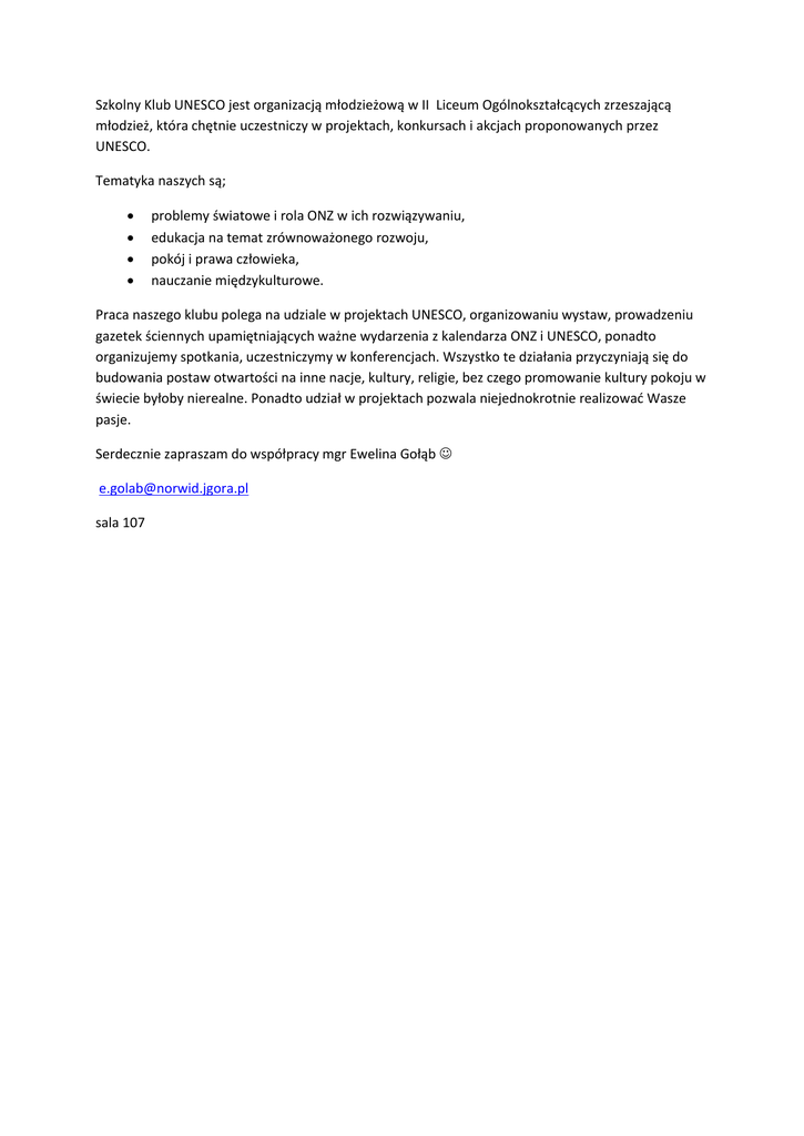 Szkolny Klub UNESCO jest organizacją młodzieżową w II Liceum Ogólnokształcących zrzeszającą młodzież, która chętnie uczestniczy w projektach, konkursach i akcjach proponowanych przez UNESCO. Tematyka naszych są; problemy światowe i rola ONZ w ich rozwiązywaniu, edukacja na temat zrównoważonego rozwoju, pokój i prawa człowieka, nauczanie międzykulturowe. Praca naszego klubu polega na udziale w projektach UNESCO, organizowaniu wystaw, prowadzeniu gazetek ściennych upamiętniających ważne wydarzenia z kalendarza ONZ i UNESCO, ponadto organizujemy spotkania, uczestniczymy w konferencjach. Wszystko te działania przyczyniają się do budowania postaw otwartości na inne nacje, kultury, religie, bez czego promowanie kultury pokoju w świecie byłoby nierealne. Ponadto udział w projektach pozwala niejednokrotnie realizować Wasze pasje. Serdecznie zapraszam do współpracy mgr Ewelina Gołąb [email protected] sala 107