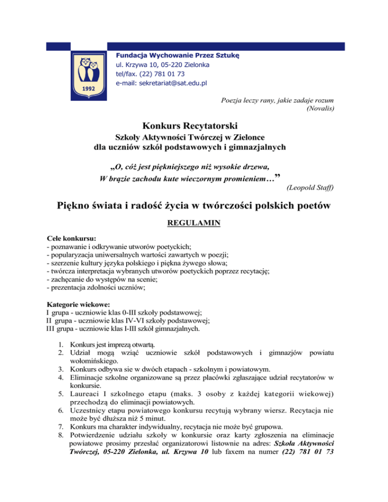 Fundacja Wychowanie Przez Sztukę ul. Krzywa 10, 05-220 Zielonka tel/fax. (22) 781 01 73 e-mail: [email protected] Poezja leczy rany, jakie zadaje rozum (Novalis) Konkurs Recytatorski Szkoły Aktywności Twórczej w Zielonce dla uczniów szkół podstawowych i gimnazjalnych „O, cóż jest piękniejszego niż wysokie drzewa, W brązie zachodu kute wieczornym promieniem…” (Leopold Staff) Piękno świata i radość życia w twórczości polskich poetów REGULAMIN Cele konkursu: - poznawanie i odkrywanie utworów poetyckich; - popularyzacja uniwersalnych wartości zawartych w poezji; - szerzenie kultury języka polskiego i piękna żywego słowa; - twórcza interpretacja wybranych utworów poetyckich poprzez recytację; - zachęcanie do występów na scenie; - prezentacja zdolności uczniów; Kategorie wiekowe: I grupa - uczniowie klas 0-III szkoły podstawowej; II grupa - uczniowie klas IV-VI szkoły podstawowej; III grupa - uczniowie klas I-III szkół gimnazjalnych. 1. Konkurs jest imprezą otwartą. 2. Udział mogą wziąć uczniowie szkół podstawowych i gimnazjów powiatu wołomińskiego. 3. Konkurs odbywa sie w dwóch etapach - szkolnym i powiatowym. 4. Eliminacje szkolne organizowane są przez placówki zgłaszające udział recytatorów w konkursie. 5. Laureaci I szkolnego etapu (maks. 3 osoby z każdej kategorii wiekowej) przechodzą do eliminacji powiatowych. 6. Uczestnicy etapu powiatowego konkursu recytują wybrany wiersz. Recytacja nie może być dłuższa niż 5 minut. 7. Konkurs ma charakter indywidualny, recytacja nie może być grupowa. 8. Potwierdzenie udziału szkoły w konkursie oraz karty zgłoszenia na eliminacje powiatowe prosimy przesłać organizatorowi listownie na adres: Szkoła Aktywności Twórczej, 05-220 Zielonka, ul. Krzywa 10 lub faxem na numer (22) 781 01 73 w terminie do 20 maja 2016 roku. 9. Powiatowy finał Konkursu, podczas którego zaprezentują się laureaci i zostaną wręczone nagrody, odbędzie się 24 maja 2016 roku w Szkole Aktywności Twórczej przy ul. Krzywej 10 w Zielonce. Początek uroczystości o godzinie 9:30. Patronat nad konkursem objęli: Burmistrz Miasta Zielonka Dyrektor Niepublicznej Szkoły Podstawowej nr 48 Niepublicznego Gimnazjum Aktywności Twórczej w Zielonce Organizator: Fundacja Wychowanie Przez Sztukę ul. Krzywa 10, 05 – 220 Zielonka www.sat.edu.pl