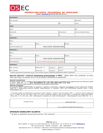 www.osec.pl PROMOCYJNA KARTA ZGŁOSZENIA NA SZKOLENIE (email: [email protected] lub fax 022 207 25 14 ) ZGŁASZAJĄCY Imię i nazwisko: Stanowisko: Tel.: Fax: E-mail: FIRMA Nazwa: NIP: Miejscowość: Kod pocztowy: Ulica: Nr: Adres do przesłania faktury: SZKOLENIE 1 Nazwa: Kod: Termin: Ośrodek: Liczba osób zgłoszonych: Łączna wartość zamówienia brutto: SZKOLENIE 2 Nazwa: Kod: Termin: Ośrodek: Liczba osób zgłoszonych: Łączna wartość zamówienia brutto: KOD PROMOCJI: Łączna wartość zamówienia brutto z upustem: UCZESTNICY Imię i nazwisko: Posiłek Jarski: □ uczulenie*: E-mail**: Tel.: Imię i nazwisko: Posiłek Jarski: □ uczulenie*: E-mail**: Tel.: **podanie poprawnego indywidualnego adresu e-mail umożliwia wysłanie uczestnikowi potwierdzenia udziału w szkoleniach Warunki płatności i realizacji zamówienia promocyjnego w OSEC: wpłata 100% ceny, przelewem na konto OSEC (jak niżej), nie później niż do 3 dni po złożeniu zamówienia na szkolenie/a Warunki uczestnictwa: Podstawą wzięcia udziału w szkoleniu jest przesłanie faksem lub mailem (skanu) wypełnionej karty zgłoszeniowej oraz dokonanie opłaty na konto OSEC Sp. z o. o. Bank MILLENNIUM 60 1160 2202 0000 0001 4710 3619 Prosimy o dokonanie wpłaty dopiero po otrzymaniu potwierdzenia uczestnictwa. Warunki rezygnacji: W przypadku OFERTY PROMOCYJNEJ, po zgłoszeniu i opłaceniu uczestnictwa, rezygnacja nie skutkuje zwrotem wpłaconych środków. Wiąże się z koniecznością pokrycia kosztów organizacyjnych w wysokości 100% ceny promocyjnej szkolenia (cena z oferty promocyjnej)+ VAT. □ Wyrażam zgodę na przetwarzanie powyższych danych zgodnie z ustawą z dnia 29 sierpnia 1997 r. o ochronie danych osobowych (Dz. U. z 2002 r. Nr 101, poz. 926, z późn. zm.) oraz w rozumieniu ustawy z dnia 18 lipca 2002 r. o świadczeniu usług drogą elektroniczną (Dz. U. Nr 144, poz. 1204 z późniejszymi zmianami) do celów informacyjnych i marketingowych przez OSEC Sp. z o. o. …………………………………………… miejscowość i data pieczątka firmowa ……………………………………………… imię i nazwisko oraz podpis osoby upoważnionej OPIEKUN HANDLOWY KLIENTA - .............................................................................. * Na jakie ze składników spożywczych jest Pan / Pani uczulona? ........................................................................ OSEC Sp. z o. o. Adres siedziby: ul. Zeusa 41, 01-497 Warszawa, tel. 22 861 96 04, fax. 22 207 25 14, email: [email protected] NIP: 522-292-83-08, REGON: 141963261, KRS : 0000335057 Sąd Rejonowy dla m. st. Warszawy w Warszawie, XIII Wydział Gospodarczy Krajowego Rejestru Sądowego Kapitał zakładowy: 57 500 zł.
