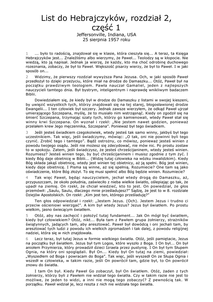 List do Hebrajczyków, rozdział 2, część 1 Jeffersonville, Indiana, USA 25 sierpnia 1957 roku 1 ... było to radością, znajdował się w klasie, która cieszyła się... A teraz, ta Księga Hebrajczyków jest... Znaleźliśmy albo wierzymy, że Paweł... Teolodzy są w kłopocie. Nie wiedzą, kto ją napisał. Jednak ja wierzę, że każdy, kto ma choć odrobinę duchowego rozeznania, zobaczy, że był to Paweł. Większość pisarzy wierzy, że był to Paweł. I w jaki sposób on... 2 Widzimy, że pierwszy rozdział wywyższa Pana Jezusa. Och, w jaki sposób Paweł przedłożył to dzięki przeżyciu, które miał na drodze do Damaszku... Otóż, Paweł był na początku prawdziwym teologiem. Pawła nauczał Gamaliel, jeden z najlepszych nauczycieli tamtego dnia. Był bystrym, inteligentnym i naprawdę wnikliwym badaczem Biblii. Dowiedziałem się, że kiedy był w drodze do Damaszku z listami w swojej kieszeni, by uwięzić wszystkich tych, którzy znajdowali się na tej starej, błogosławionej drodze Ewangelii... I ten człowiek był szczery. Jednak zawsze wierzyłem, że odkąd Paweł ujrzał umierającego Szczepana, myślę, że to musiało nim wstrząsnąć. Kiedy on zgodził się na śmierć Szczepana, trzymając szaty tych, którzy go kamienowali, wtedy Paweł stał się winny krwi Szczepana. On wyznał i rzekł: „Nie jestem nawet godzien, ponieważ przelałem krew Jego męczennika, Szczepana”. Ponieważ był tego świadkiem. 3 Jeśli jesteś świadkiem czegokolwiek, wtedy jesteś tak samo winny, jakbyś był tego uczestnikiem. Tak więc, jeśli świadczymy, mówiąc: „O tak, oni nie powinni byli tego czynić. Zrobić tego i tamtego”. Bądź ostrożny, co mówisz, ponieważ jesteś winien z powodu twojego osądu. Jeśli nie możesz się zdecydować, nie mów nic. Po prostu zostaw to w spokoju. Zatem, jeśli świadczysz, że jesteś chrześcijaninem, wtedy jesteś winien. Rozumiesz? Jesteś winien tego, by być chrześcijaninem i musisz zgodnie z tym żyć. I kiedy Bóg daje obietnicę w Biblii... (Widzę tutaj człowieka na wózku inwalidzkim). Kiedy Bóg składa jakąś obietnicę, wtedy jest winien tej obietnicy, aż ją spełni. Bóg jest winien, kiedy daje obietnicę. I Pisma są winne, aż się spełnią. Rozumiecie? One tam są jako oświadczenie, które Bóg złożył. To się musi spełnić albo Bóg będzie winien. Rozumiecie? 4 Tak więc Paweł, będąc nauczycielem, jechał wtedy drogą do Damaszku, aż, przypuszczam, że około południa, zaświeciło z nieba wielkie światło, oślepiając go tak, że upadł na ziemię. On rzekł, że chciał wiedzieć, kto to jest. On powiedział, że głos przemówił: „Saulu, Saulu, dlaczego mnie prześladujesz?” Sądzę, że jest to w 8. rozdziale Dziejów Apostolskich. On rzekł: „Kim jest ten, którego prześladuję?” Ten głos odpowiedział i rzekł: „Jestem Jezus. (Och). Jestem Jezus i trudno ci przeciw ościeniowi wierzgać”. A kim był wtedy Jezus? Jezus był światłem. Po prostu wielkim, jasno świecącym światłem. 5 Otóż, aby nas zachęcić i położyć tutaj fundament... Jak On mógł być światłem, kiedy był człowiekiem? Otóż, nikt... Była tam z Pawłem grupa żołnierzy, strażników świątynnych, jadących tam, aby aresztować. Paweł był dowódcą i oni jechali tam, by aresztować tych ludzi z powodu ich wielkich zgromadzeń i tak dalej, z powodu religijnej nadziei, która się w nich znajdowała. 6 Lecz teraz, był tutaj Jezus w formie wielkiego światła. Otóż, jeśli pamiętacie, Jezus na początku był światłem. Jezus był tym Logos, które wyszło z Boga. I On był... On był aniołem Przymierza, który prowadził dzieci Izraela przez pustynię. I On był tym Słupem Ognia, na który oni spoglądali. Był On... Kiedy był On tutaj na ziemi, powiedział: „Wyszedłem od Boga i powracam do Boga”. Tak więc, jeśli wyszedł On ze Słupa Ognia i wszedł w człowieka, w takim razie, jeśli On powrócił tam, gdzie był, to On powrócił znowu do światła. I tam On był. Kiedy Paweł Go zobaczył, był On światłem. Otóż, żaden z tych żołnierzy, którzy byli z Pawłem nie widział tego światła. Czy w takim razie nie jest to możliwe, że jeden to widzi, a inni nie mogą tego zobaczyć? Z pewnością tak. W porządku. Paweł widział je, lecz reszta z nich nie widziała tego światła. List do Hebrajczyków, rozdział 2, część 1 2 7 Otóż, kiedy Piotr był w więzieniu, dowiedzieliśmy się, że to światło przyszło do jego celi, otwarło drzwi i on był... To światło oślepiło resztę strażników, kiedy oni wychodzili. Piotr szedł, a kiedy dotarł do drzwi, one same otwarły się cicho, a potem zamknęły się za nim. On wyszedł z wewnętrznej celi do wyjściowych drzwi. One otwarły się same i cicho zamknęły. Potem przeszedł przez otwór i wyszedł na miejską ulicę. Przetarł swoje oczy, jakby chciał powiedzieć: „Czy ja śniłem?” On nie wiedział, co się stało. Był to jednak ten sam anioł Pański, ten sam anioł, który był tym Słupem Ognia, który przyprowadził Mojżesza do morza, rozdzielił je (och), a Morze Czerwone ustawiło się murem po obu stronach, a Izrael się przeprawił. Kiedy oni doszli do wzburzonego Jordanu, On się tam nie pokazał. Jednak On tam był, ponieważ On go otwarł. Oni przeprawili się w kwietniu, kiedy równiny są całe pokryte wodą. I On powstrzymał wiosnę, zatrzymał śnieg, by nie topniał, aby ta ściana wody nie rosła. On po prostu to zatrzymał. To jest nasz Jahwe. To jest nasz Pan Jezus. Po prostu zatrzymał go i oni przeszli po suchym gruncie. 8 Otóż, Bóg obiecał, że się o nich zatroszczy, a więc był zobowiązany wobec Swojej obietnicy. Otóż, Paweł, będąc świadomy tych rzeczy i znając je, był uprzywilejowany, ponieważ Bóg mówił bezpośrednio do niego. On nie mówił do tych żołnierzy, którzy byli z nim. On mówił tylko do Pawła. Otóż, kiedy anioł Pański zstą
